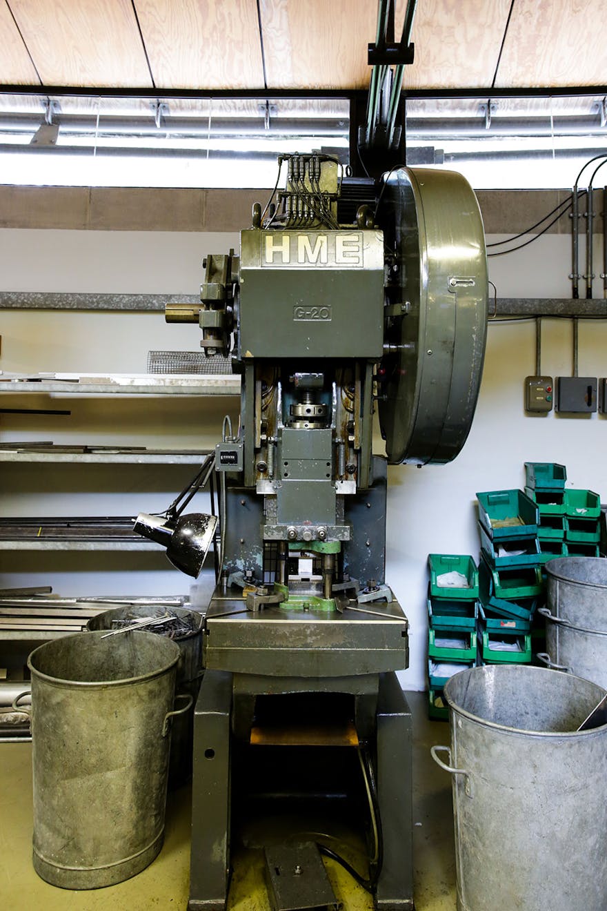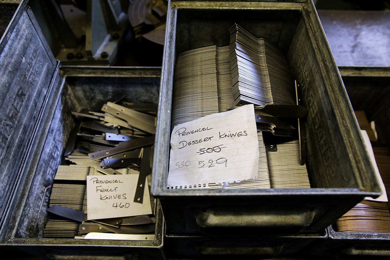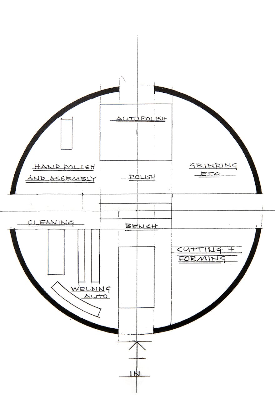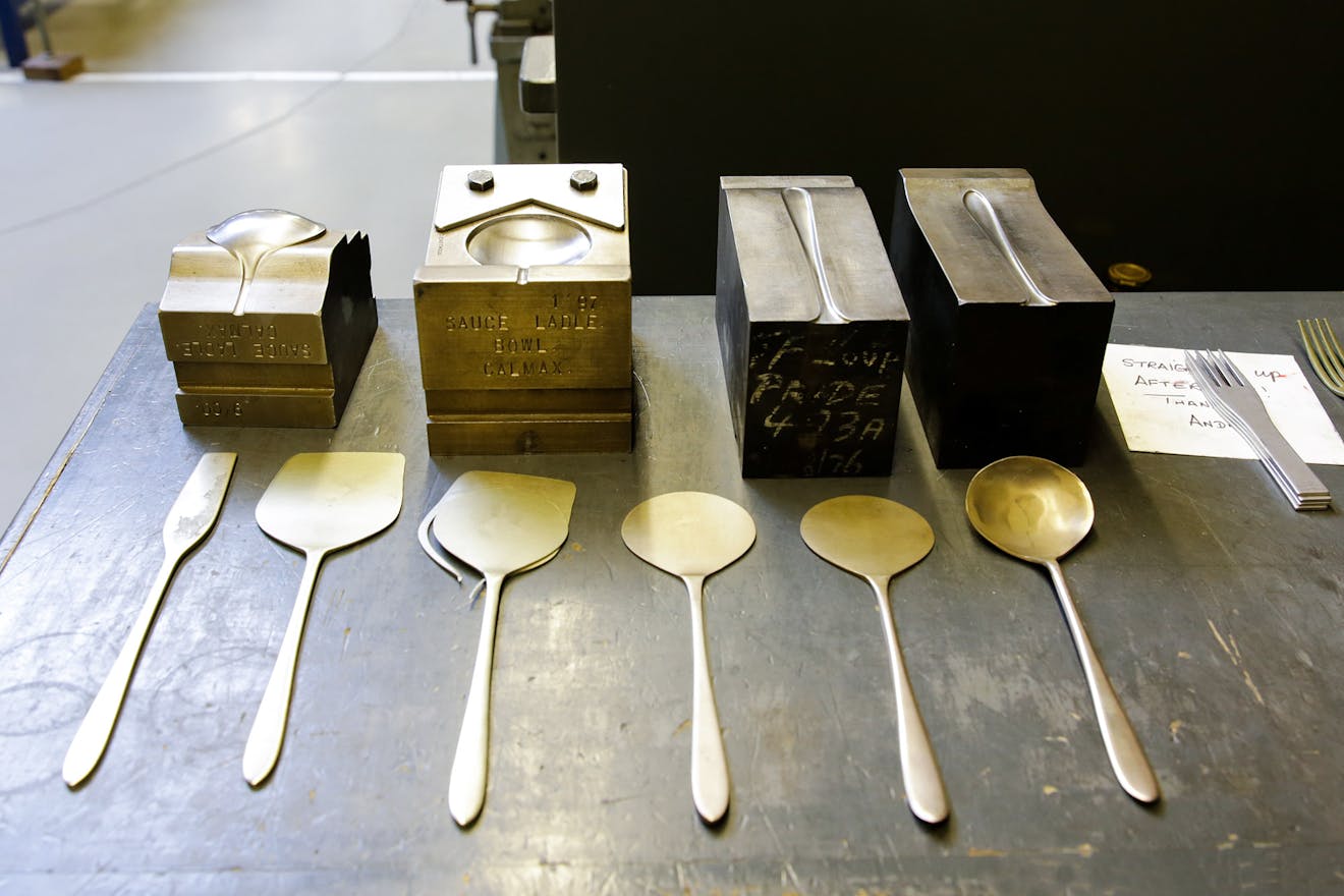 As well as being an industrial and product designer he also turned his hand to designing buildings. He worked closely with the architect Sir Michael Hopkins to design the (award winning) Round Building which enabled the company to expand in 1990. The design was largely lead by the circular concrete foundations of the gas cylinder that stood there before it. Constructed of natural stone and steel, the building’s tour de force is its bicycle-wheel-like, exposed-steel roof structure which rises towards a central hub. The roof itself is made up of Finnish pine box panels hooking on to the circular purlins. Most of the construction work was carried out by Mellor and his employees who (amongst other things) made all of the 480 roof panels and crafted the internal light fittings from the same material. David’s cutlery is still handmade there today – the round shape of the building lending itself perfectly to the step-by-step process of production. Factory manager Andrew Cisalowicz, who has worked at David Mellor Design since 1979, took the time to show us around.