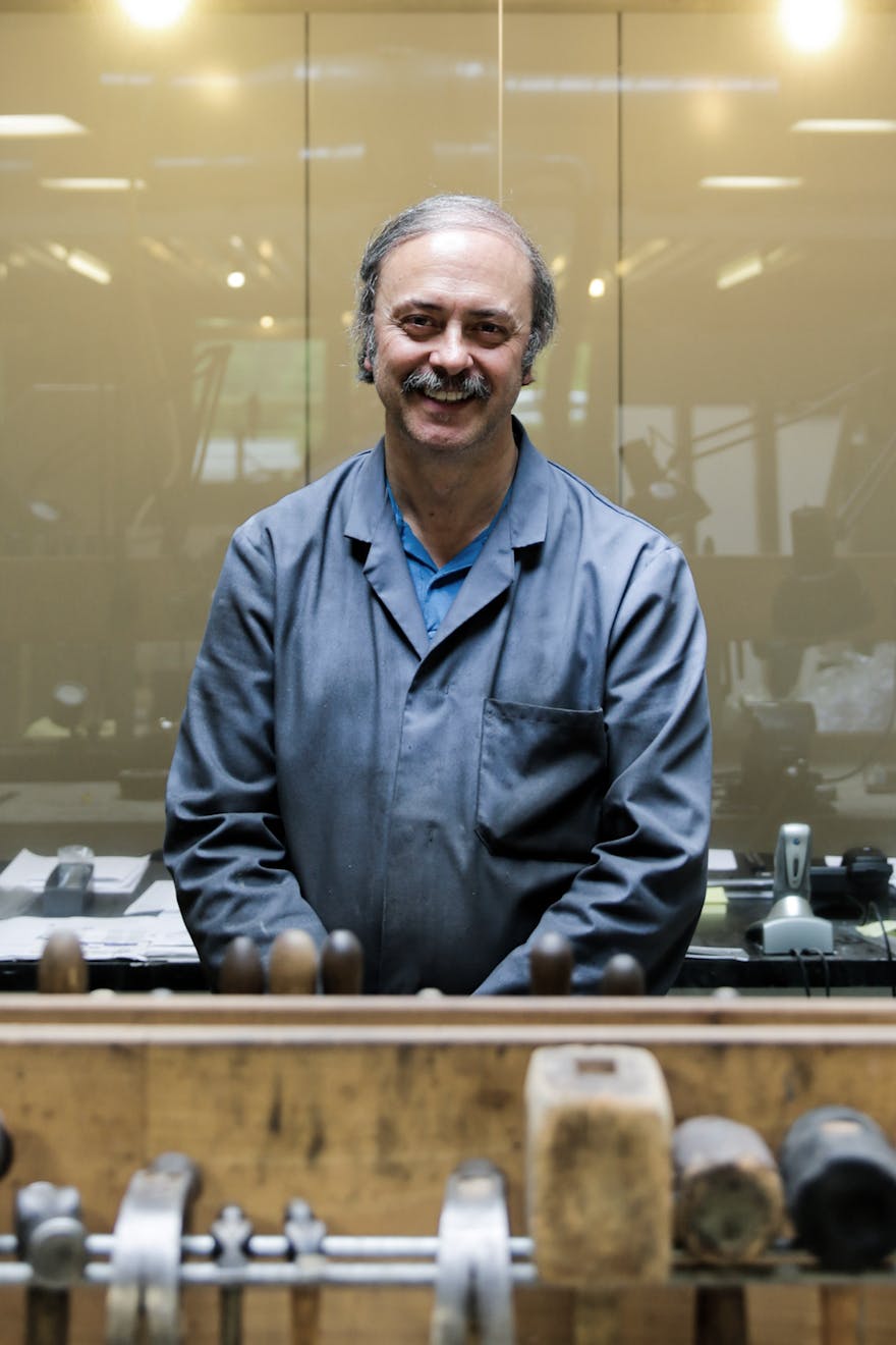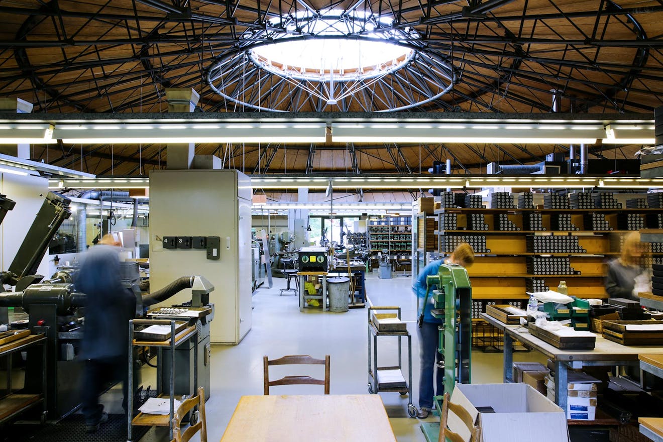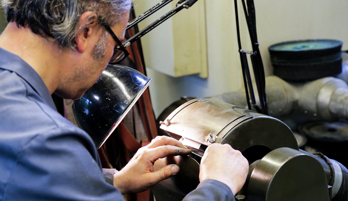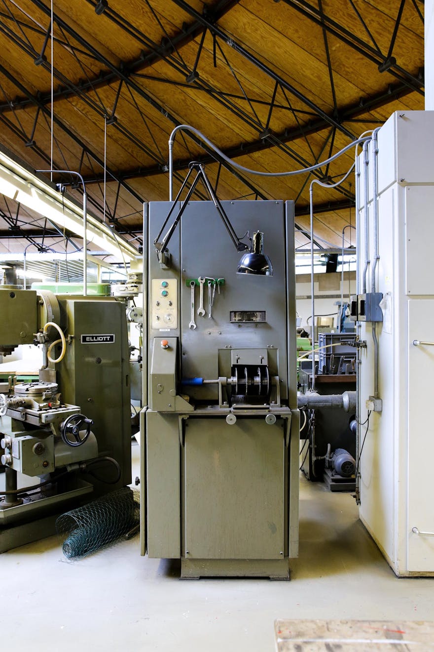 As well as being an industrial and product designer he also turned his hand to designing buildings. He worked closely with the architect Sir Michael Hopkins to design the (award winning) Round Building which enabled the company to expand in 1990. The design was largely lead by the circular concrete foundations of the gas cylinder that stood there before it. Constructed of natural stone and steel, the building’s tour de force is its bicycle-wheel-like, exposed-steel roof structure which rises towards a central hub. The roof itself is made up of Finnish pine box panels hooking on to the circular purlins. Most of the construction work was carried out by Mellor and his employees who (amongst other things) made all of the 480 roof panels and crafted the internal light fittings from the same material. David’s cutlery is still handmade there today – the round shape of the building lending itself perfectly to the step-by-step process of production. Factory manager Andrew Cisalowicz, who has worked at David Mellor Design since 1979, took the time to show us around.
