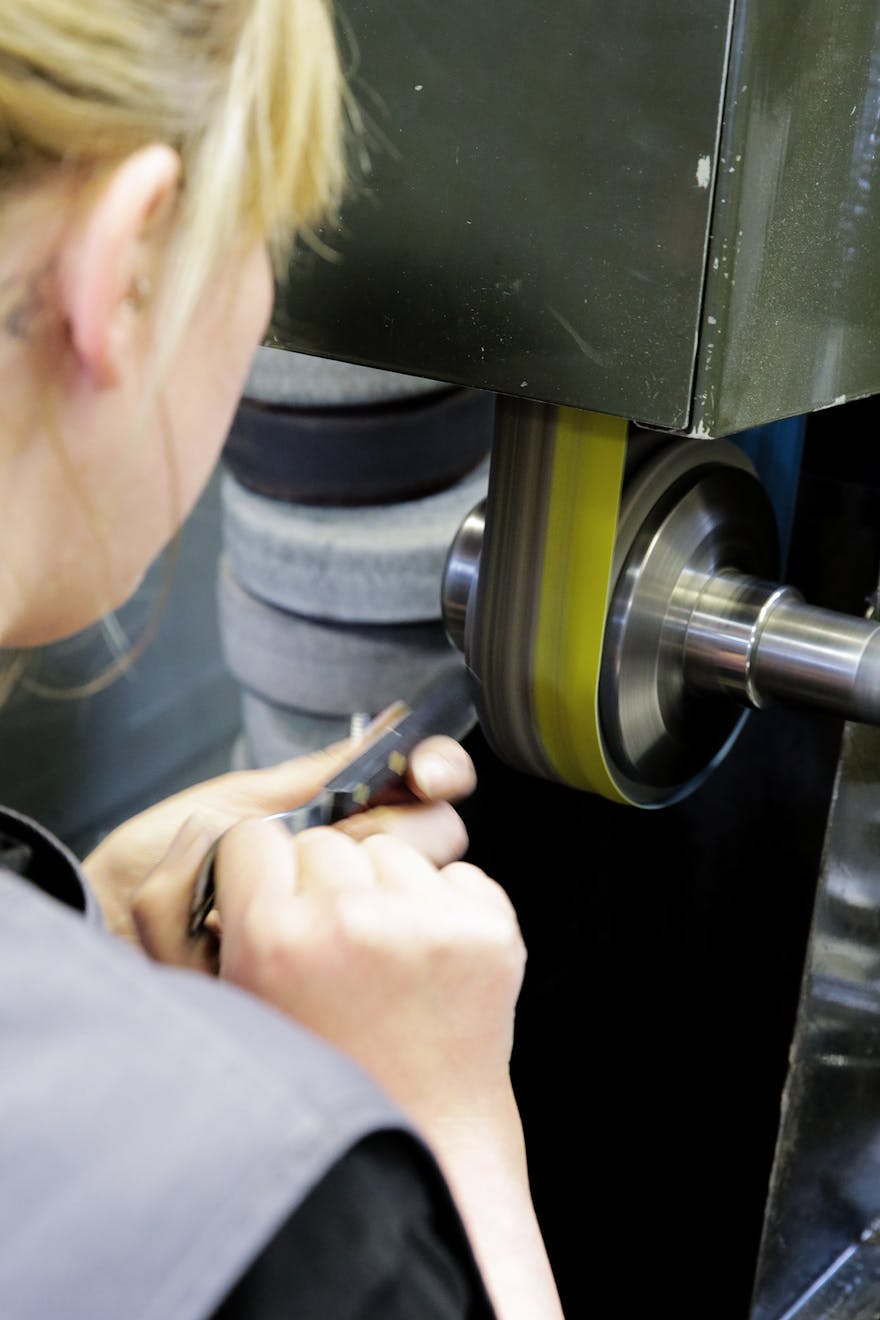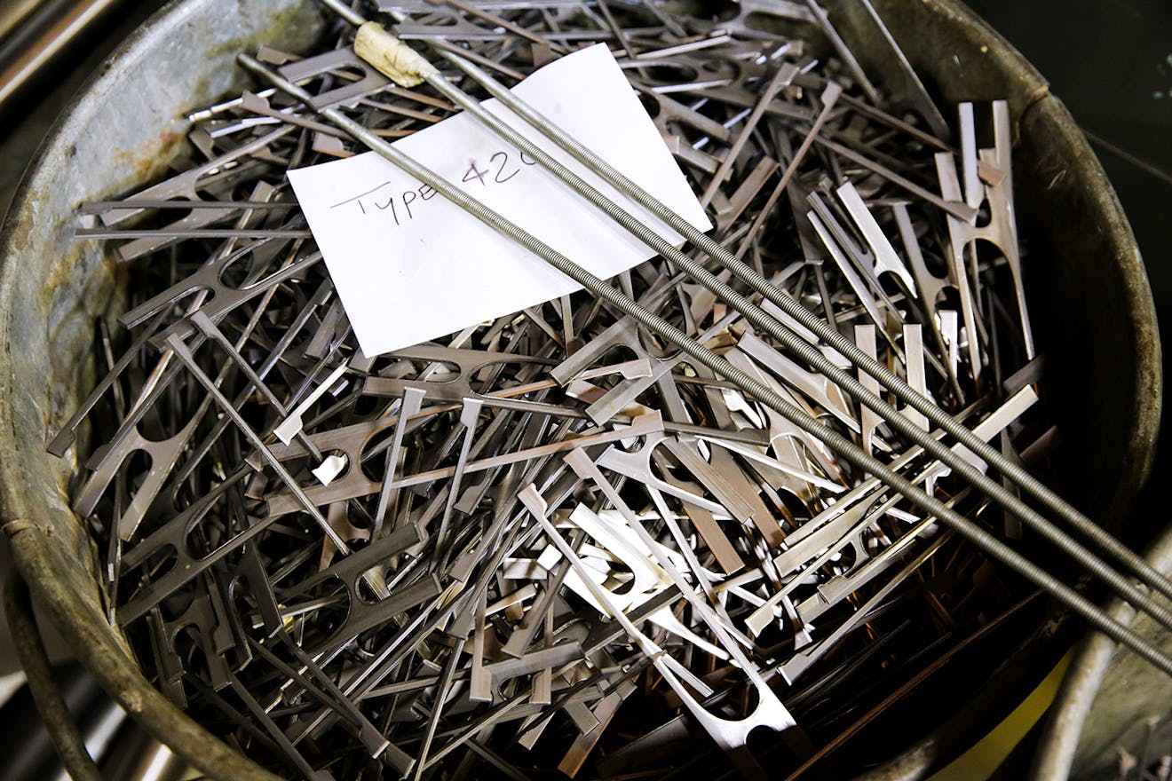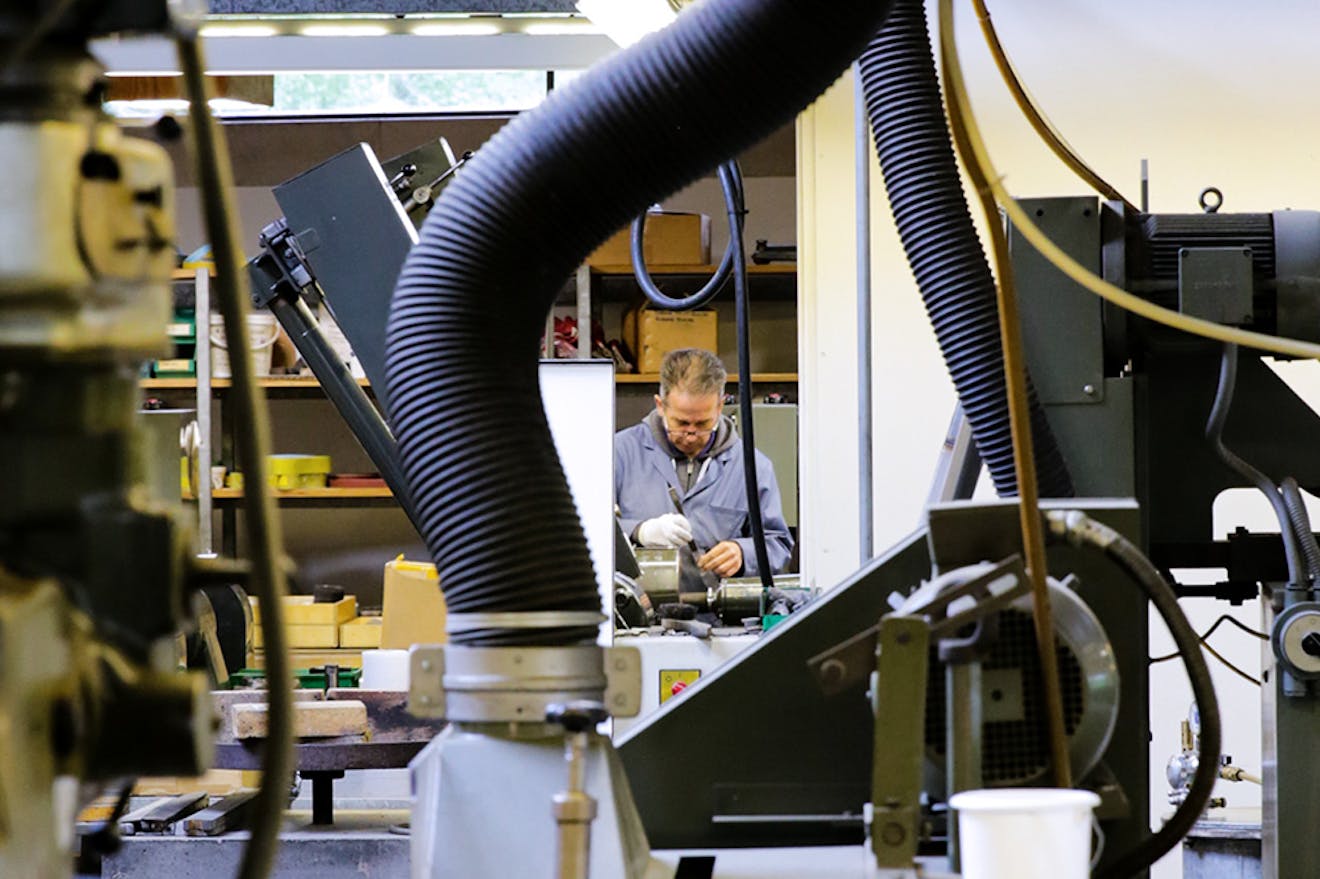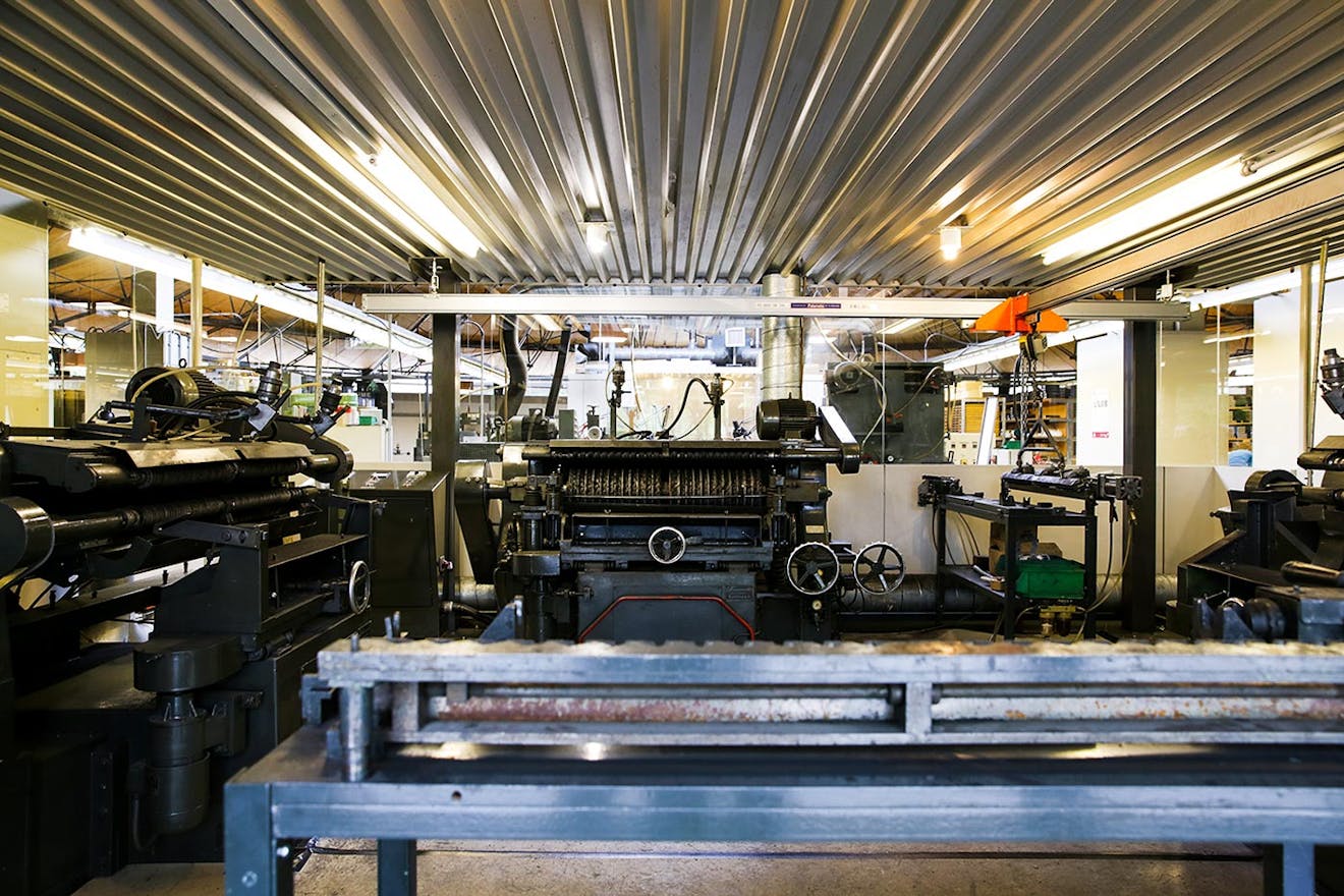 As well as being an industrial and product designer he also turned his hand to designing buildings. He worked closely with the architect Sir Michael Hopkins to design the (award winning) Round Building which enabled the company to expand in 1990. The design was largely lead by the circular concrete foundations of the gas cylinder that stood there before it. Constructed of natural stone and steel, the building’s tour de force is its bicycle-wheel-like, exposed-steel roof structure which rises towards a central hub. The roof itself is made up of Finnish pine box panels hooking on to the circular purlins. Most of the construction work was carried out by Mellor and his employees who (amongst other things) made all of the 480 roof panels and crafted the internal light fittings from the same material. David’s cutlery is still handmade there today – the round shape of the building lending itself perfectly to the step-by-step process of production. Factory manager Andrew Cisalowicz, who has worked at David Mellor Design since 1979, took the time to show us around.