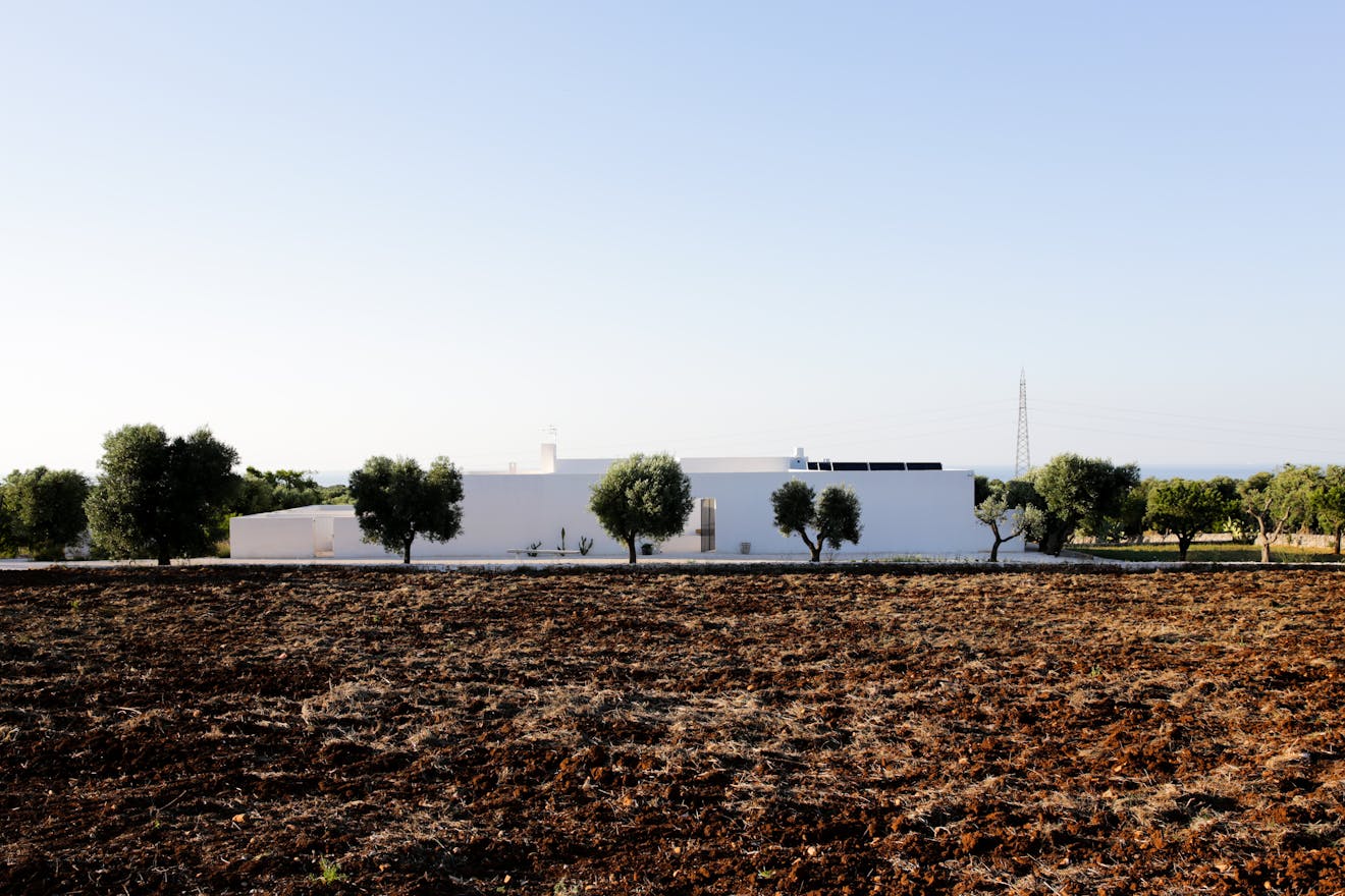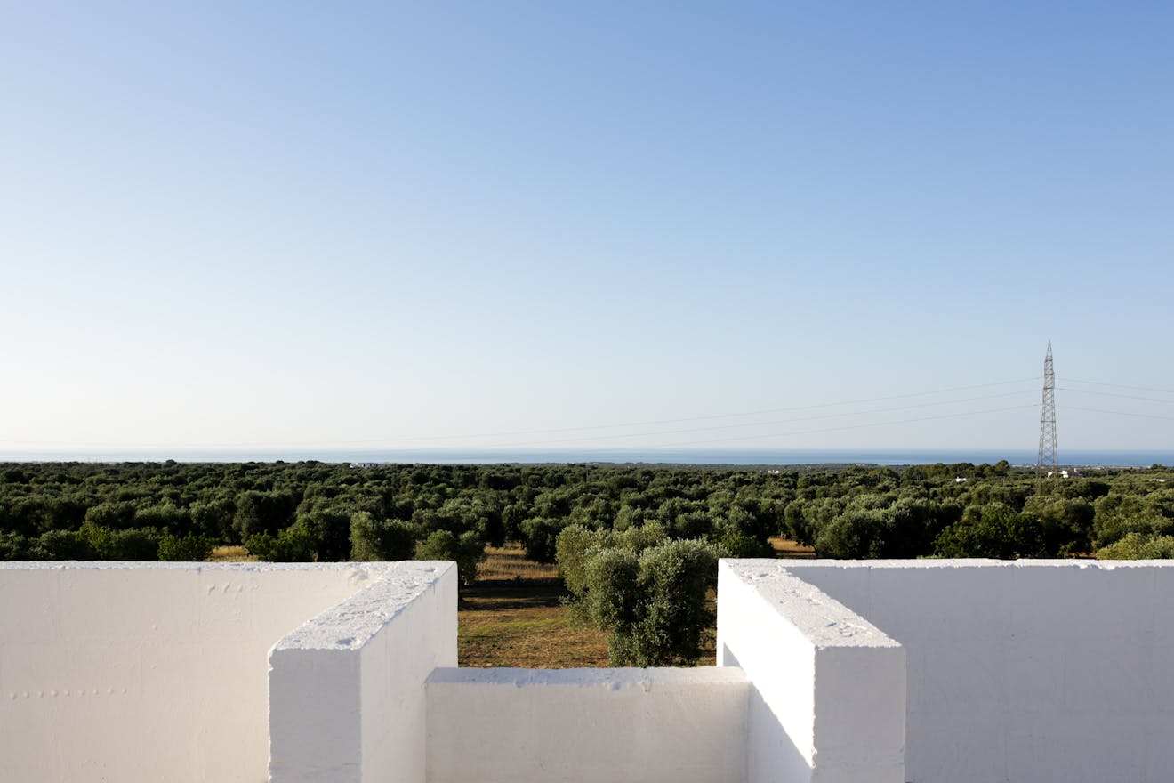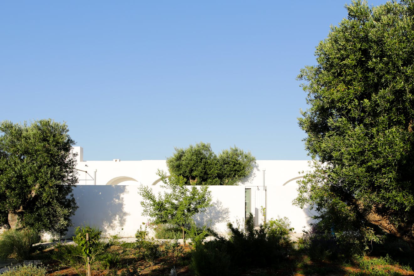 The building sits amongst 12 acres of ancient olive groves, situated just outside the beautiful white town of Ostuni and almost equidistant from the beach. As you approach the Masseria the elements start to combine, white-washed walls, raw stone, deep-red soil and dark green vegetation. Flecks of blue, white and yellow wildflowers pepper the scene. Crisp modern architectural details blend seamlessly with styles and materials seen in the farmhouses of the area giving a new twist to the local vernacular.