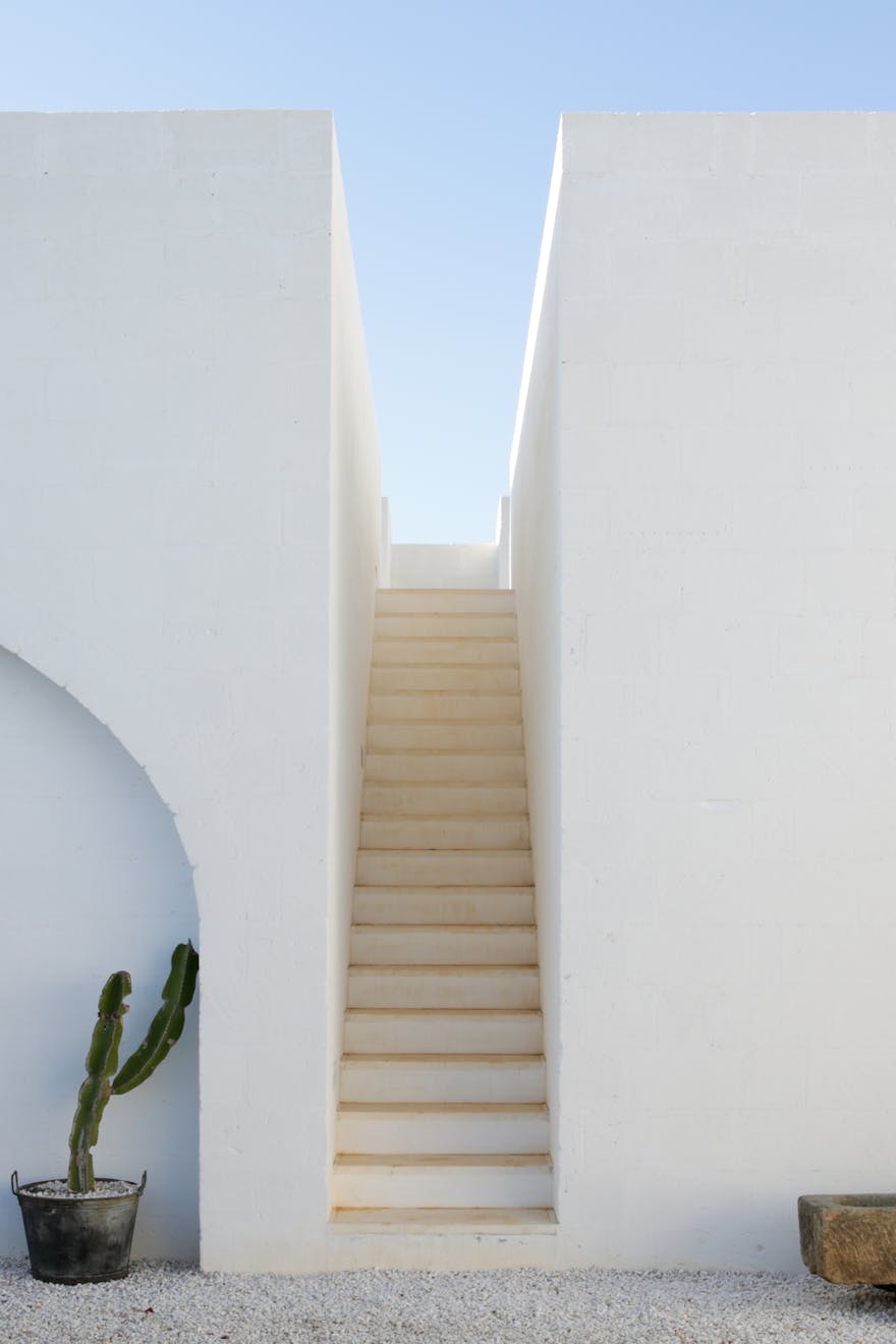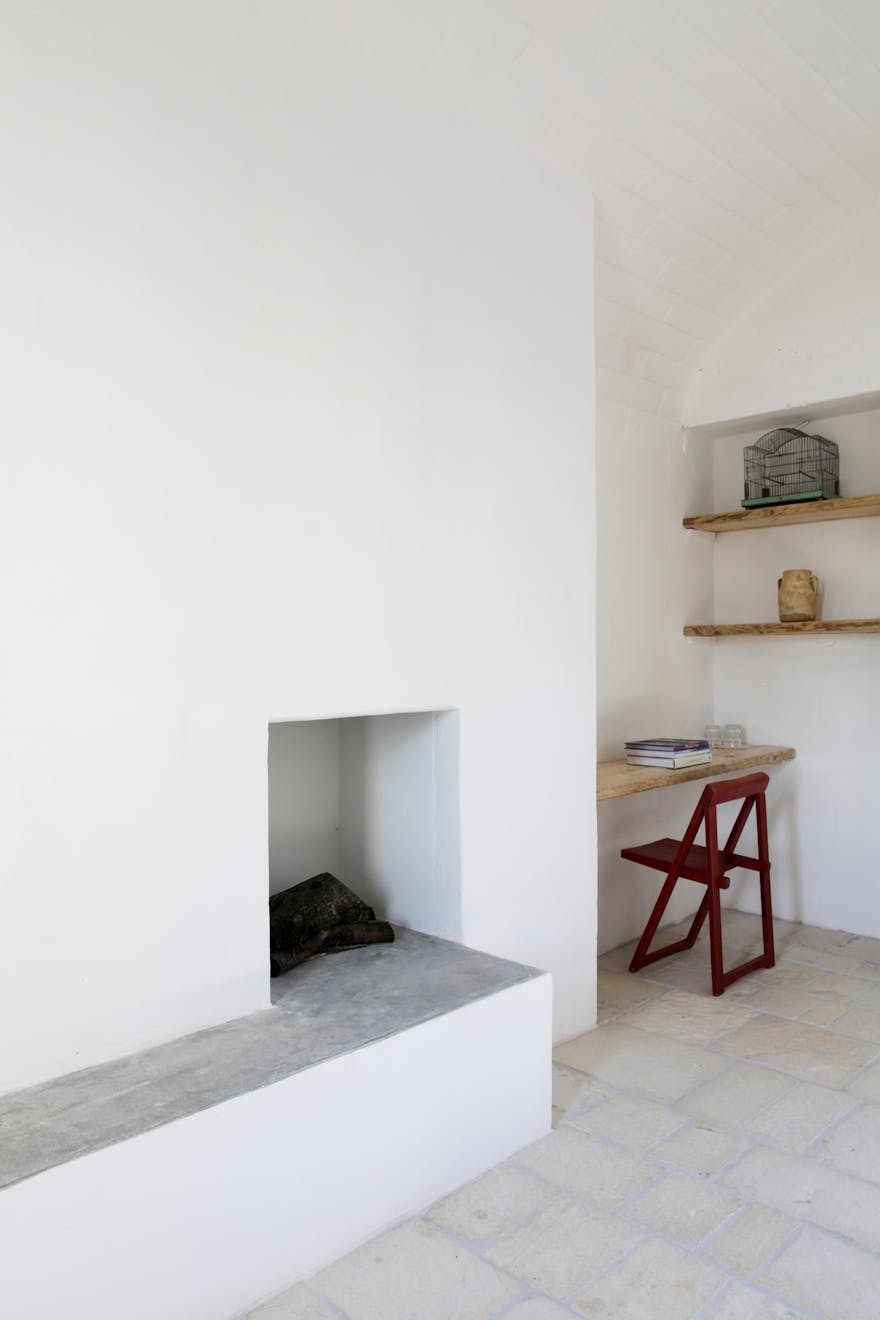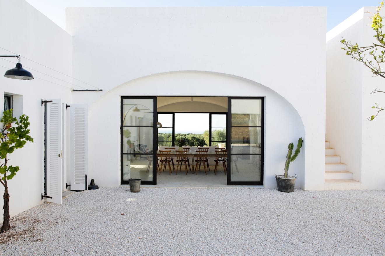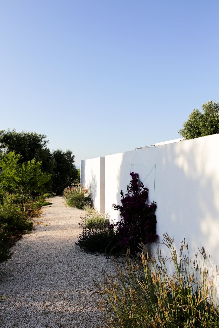 The building sits amongst 12 acres of ancient olive groves, situated just outside the beautiful white town of Ostuni and almost equidistant from the beach. As you approach the Masseria the elements start to combine, white-washed walls, raw stone, deep-red soil and dark green vegetation. Flecks of blue, white and yellow wildflowers pepper the scene. Crisp modern architectural details blend seamlessly with styles and materials seen in the farmhouses of the area giving a new twist to the local vernacular.