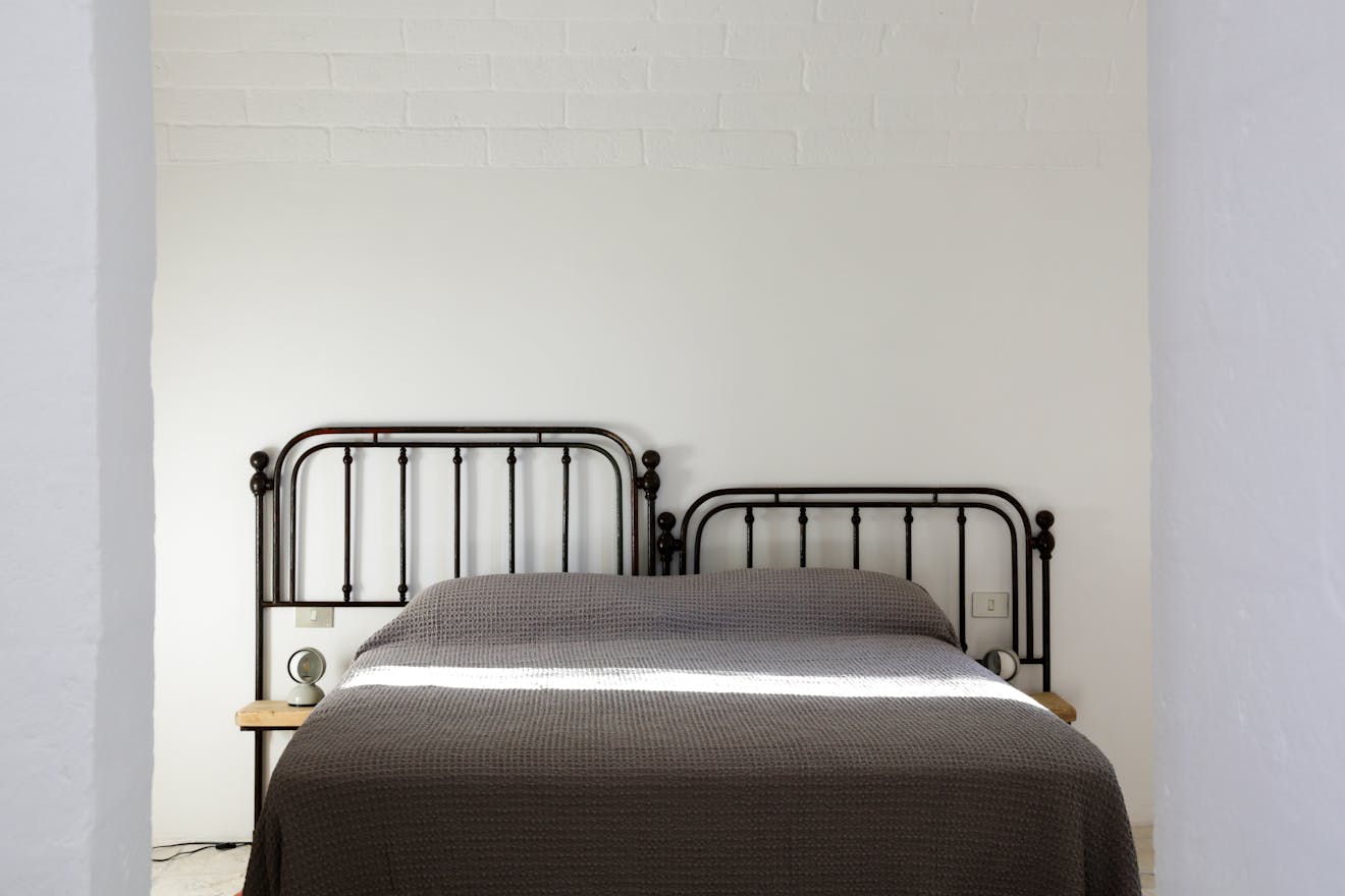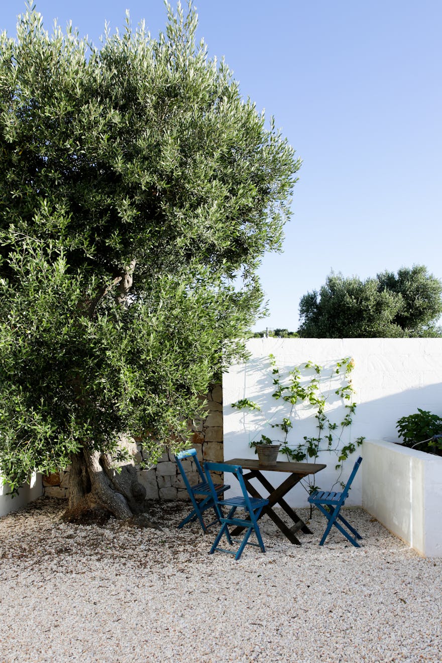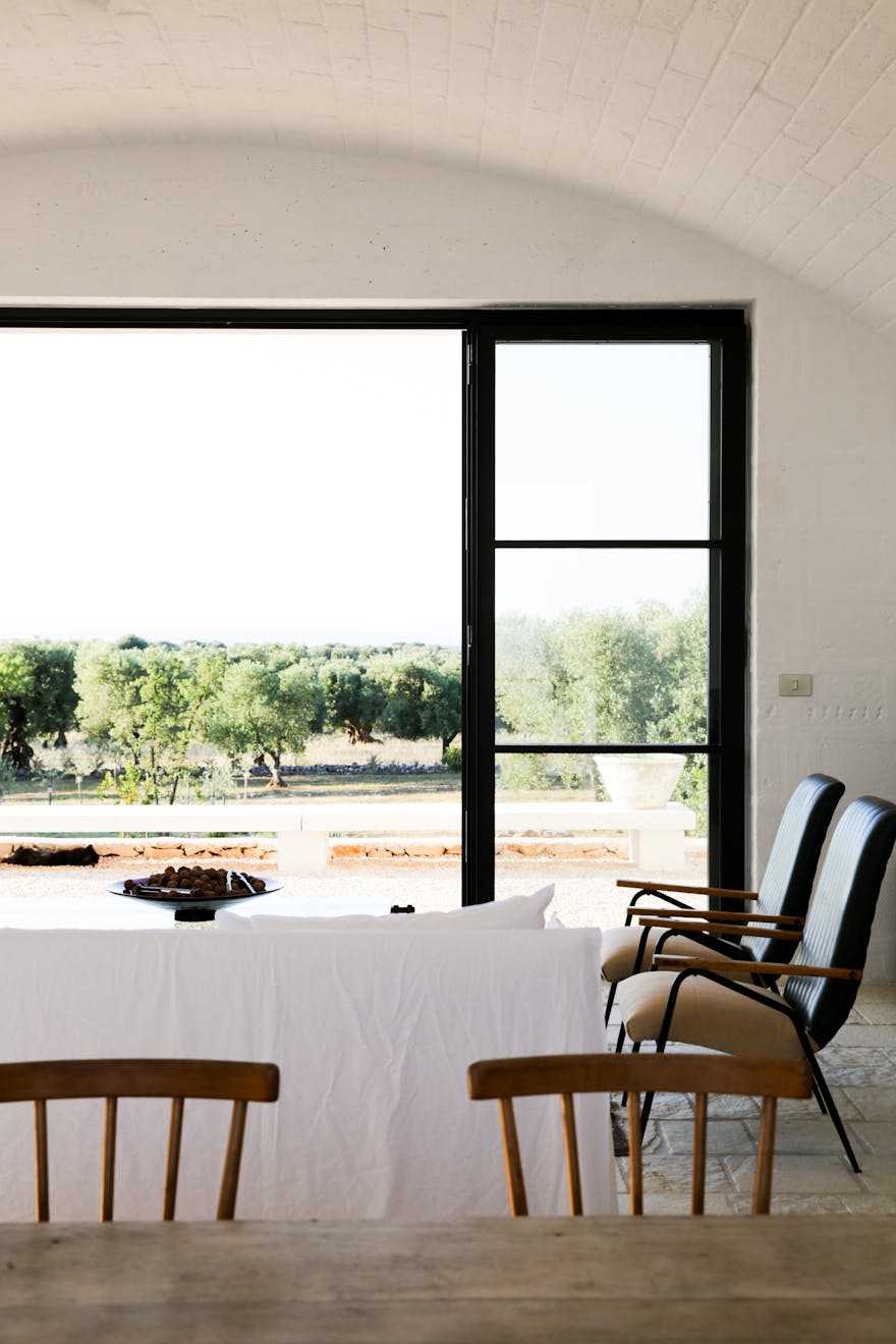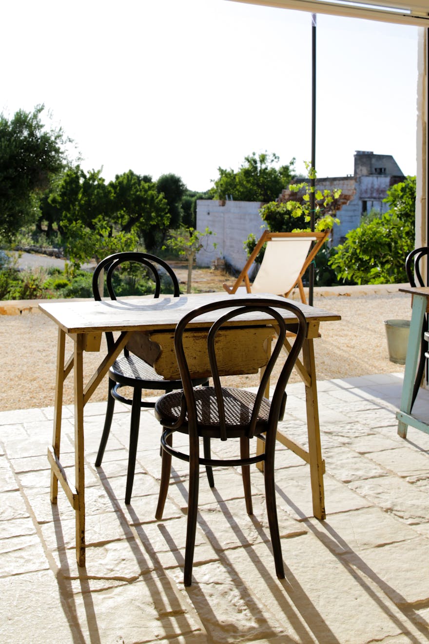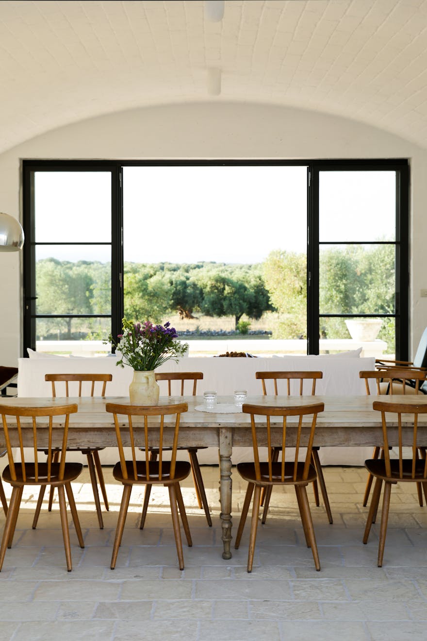 As you pass through the large steel gate of the main entrance, a striking open-air staircase beckons you towards a roof terrace with its 360 outlook, including views of the stunning local hillsides, dotted with the distinctive white buildings of Ostuni. The Masseria flows around a large internal courtyard with it’s six suites looking out towards private gardens and the olive groves beyond. A homely communal living space offers the chance to take cover from the sun and soak up the magnificent views across the swimming pool, olive groves and the blue sea during the day. In the evening the large kitchen table is the scene of a freshly prepared communal meal, eating and socialising are important here.