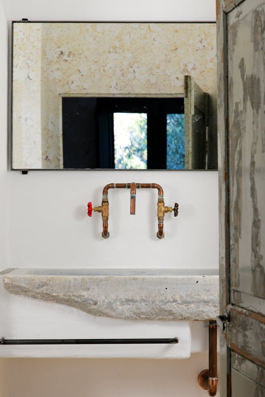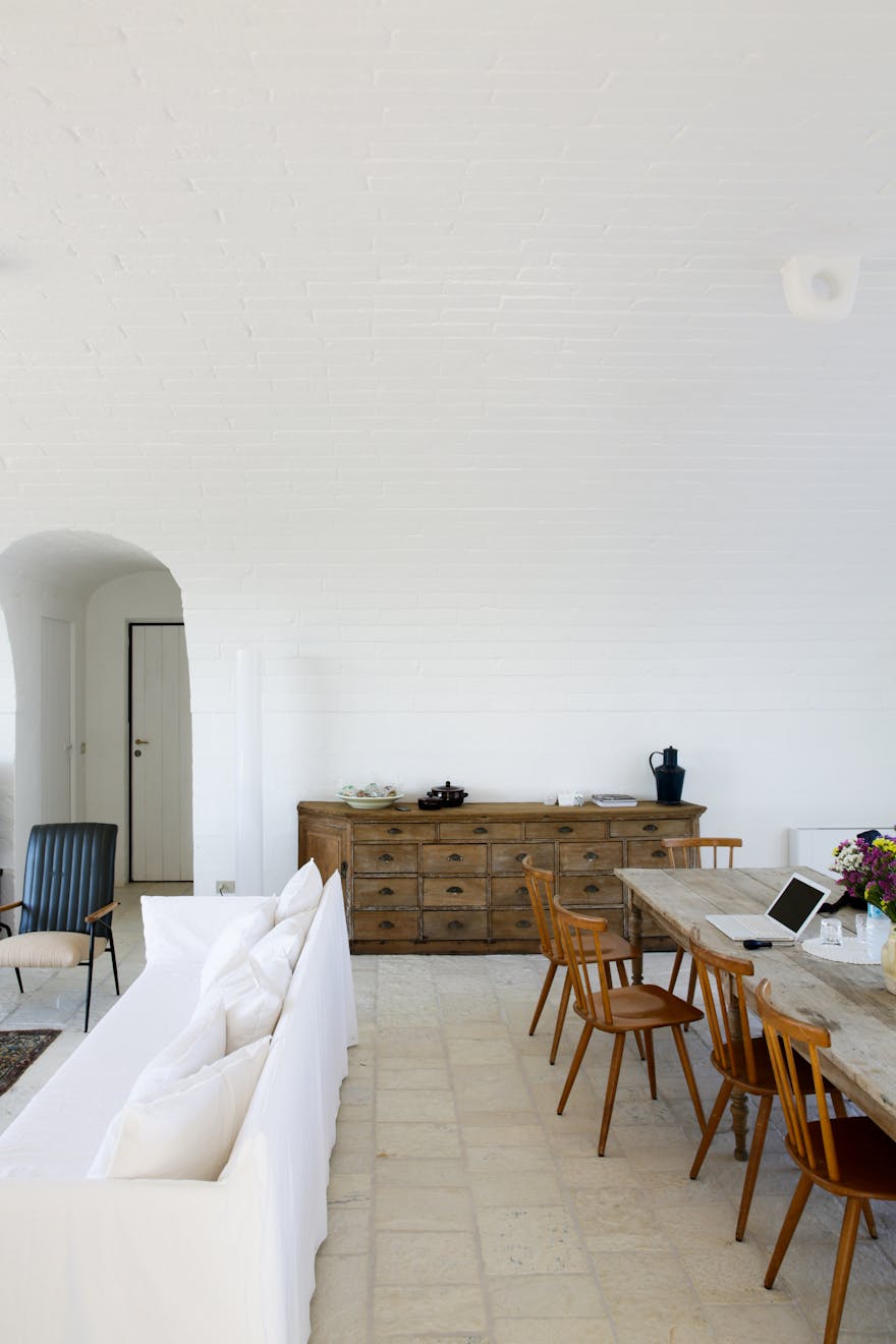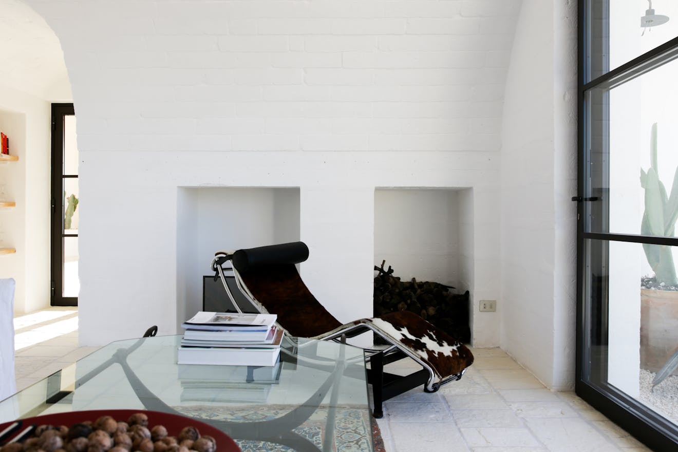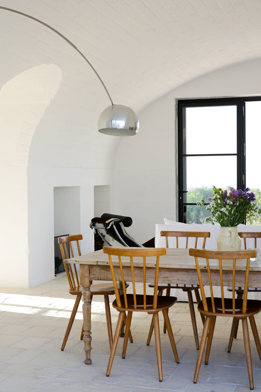 The white-washed interiors are made up of carefully selected modern design pieces mixed with finds from local markets and antique fairs. From the Le Corbusier Chaise Longue, Achille and Pier Actiglioni’s Arco lamp to the sculpted marble sinks in the bathrooms (reclaimed from an old laundry), every detail has been carefully considered to create a contemporary take on rustic luxury.