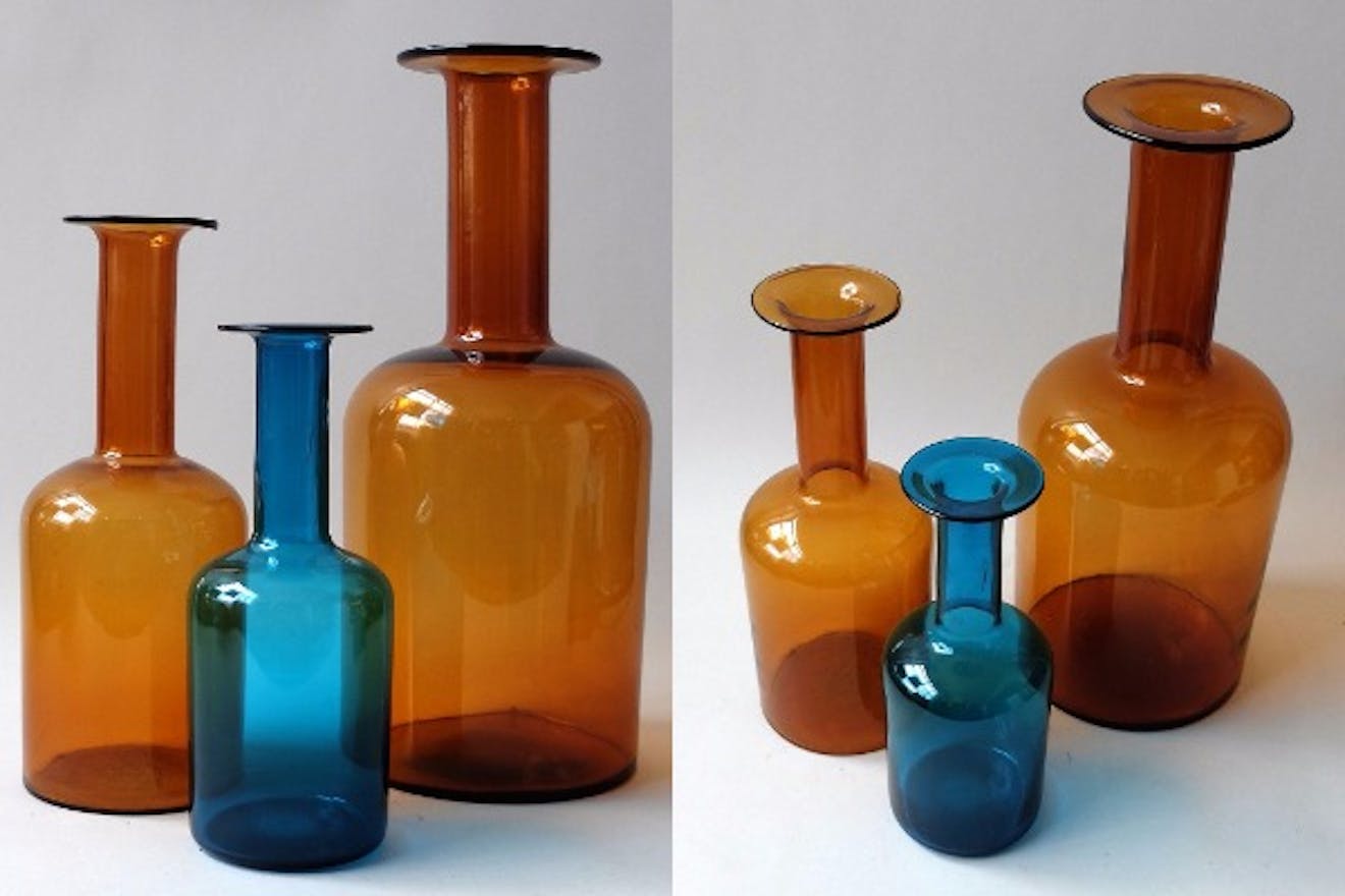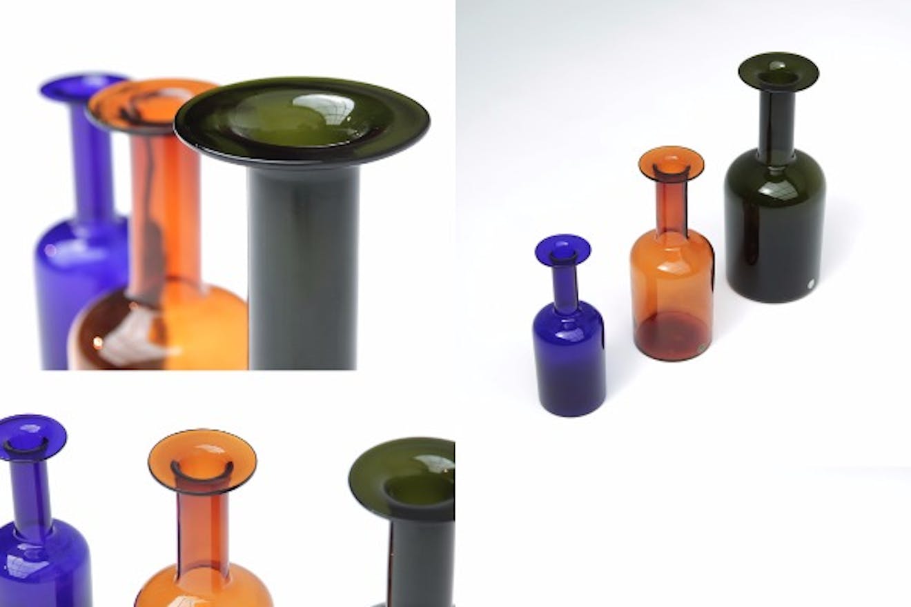 In the late 50’s the original ‘Gulvvase’ was only produced in four colours – dark green, amber, dark blue and clear. It was a bit later on, around 1963/64 when there was a trend for brighter colours, that the vase was also made in an opaque white, cased in clear glass. Around 1967 the vase was made in yellow cased in clear glass and opal cased in coloured glass. The colours were opal/blue, opal/red, opal/green and a very limited number which used Kastrup’s original dark olive green over opal glass. Around 1970/71 an opal/yellow colourway was introduced. The vase is also found in clear, light blue, grey smoke, and rauchtopaz colourways. They were made in quite large numbers by Cascade Glass of England under license from Holmegaard. There are five sizes to collect, starting at 25cm going up to 50cm.