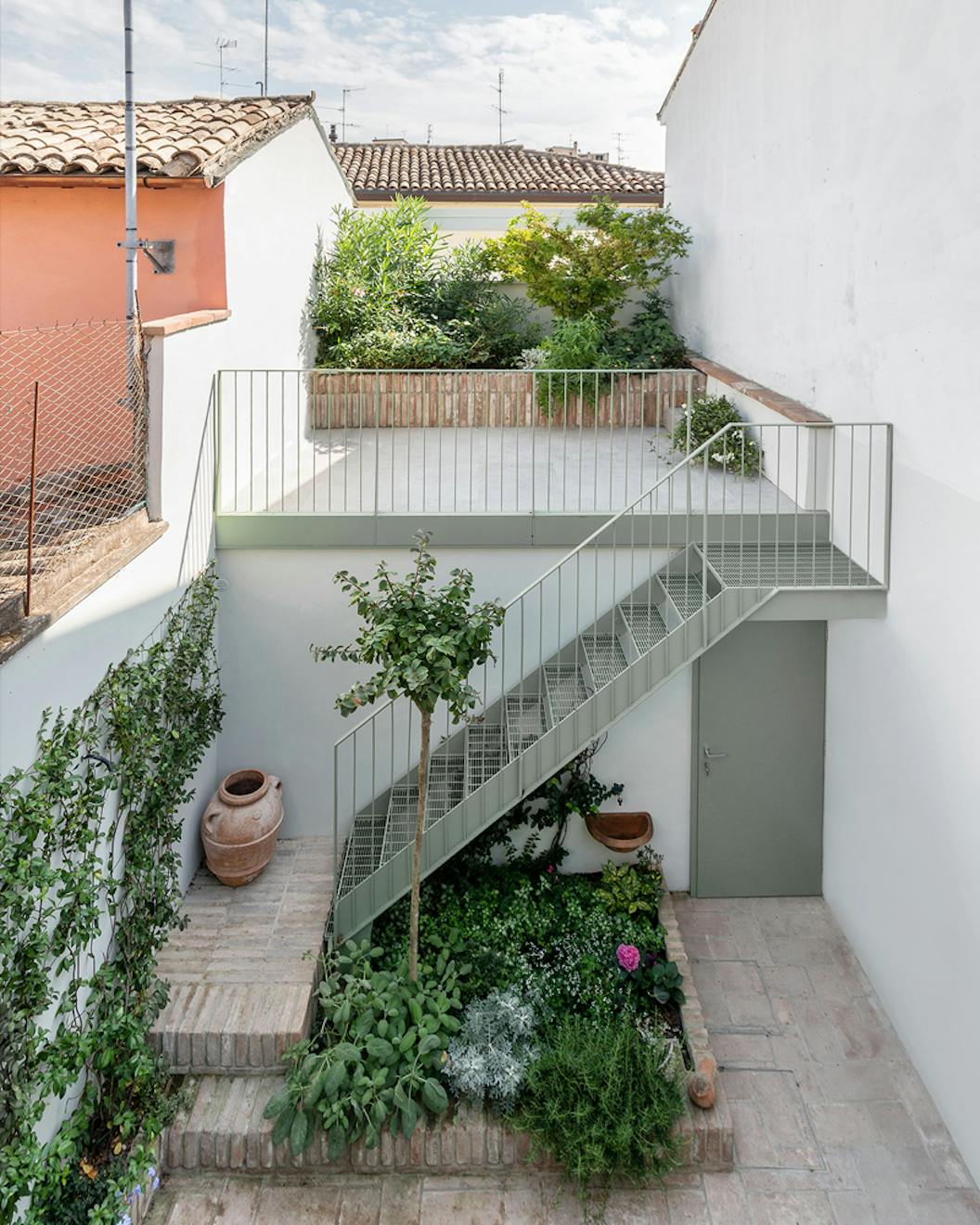 Ravenna was the last capital of the Western Roman empire and is home to no less than eight UNESCO heritage sites. Its landscape is peppered with towering Byzantine churches housing ancient monuments and magnificently lavish mosaics. The city’s rich historical fabric is knitted together with very simple two- and three-storey houses, both narrow and long, geometric in shape with private courtyards. Mirella’s plot is typical of these dwellings, built around a hundred years ago and cloistered by two buildings either side, facing two opposite streets.