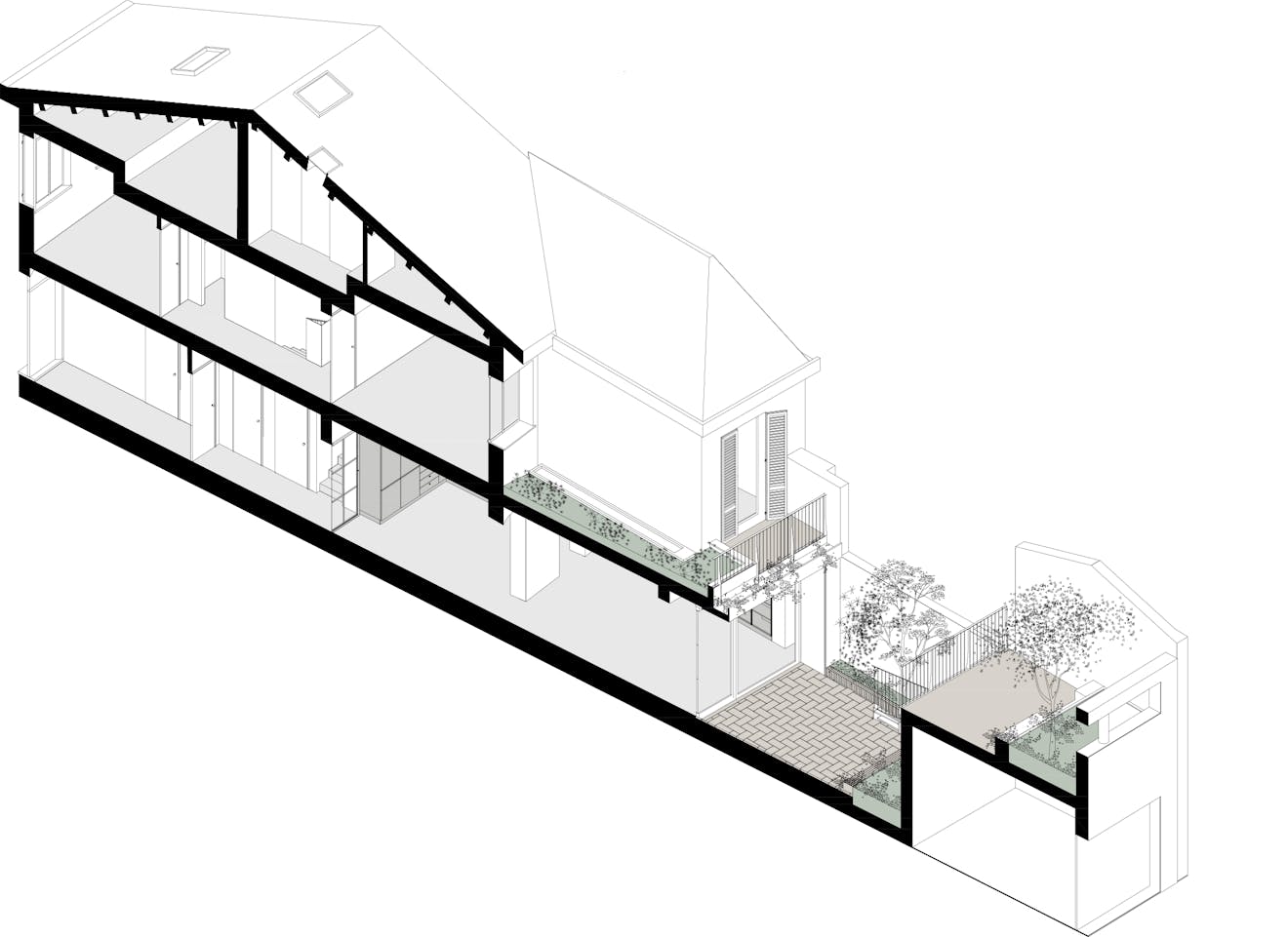 Inside, the building’s traditional long and narrow footprint is stretched tall, allowing the space to unfurl vertically, as well as horizontally, towards the slightly off-centre courtyard garden located nearer the rear. Mecozzi was intent on creating a feeling of spatial continuity between the interior and the garden, eeking out as much outside space in order to do so with the addition of two roof terraces either side of the courtyard. ‘The reinterpretation of the new living area and the construction of two terraces facing the inner courtyard create unexpected views, while the new skylights in the living room and the stairwell allow the blue sky to contrast with the oak floor of the house,’ he explains.