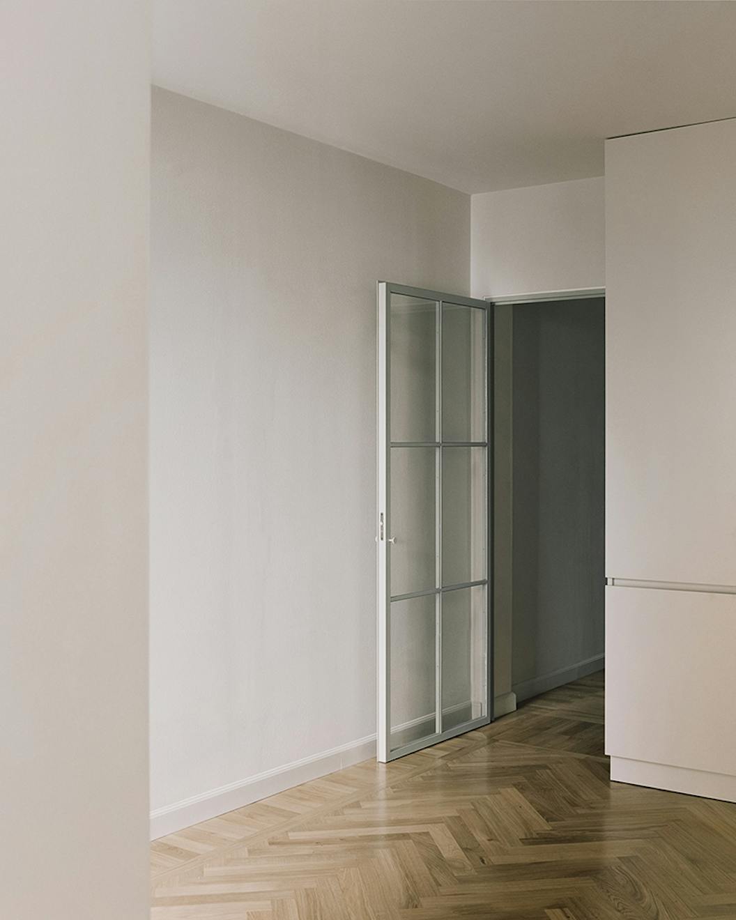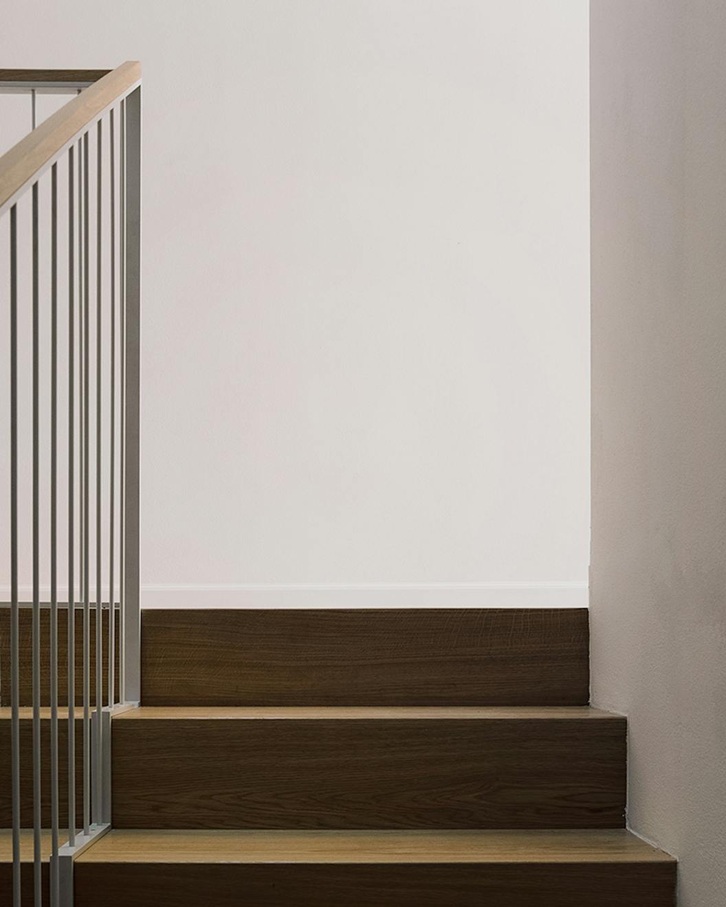The considered choice of materials further demonstrates the delicate balance struck between classic and contemporary. Lime plaster, gypsum frames and earthen terracotta tiles used to restore the garden floor coexist quite seamlessly alongside a stark modern metal staircase linking the upstairs rooms. Bedrooms are fitted out with quiet colours and simple custom-made furniture, and there is oak flooring throughout, with a herringbone pattern selected for the most classic rooms and a more contemporary pattern in the reimagined living area.