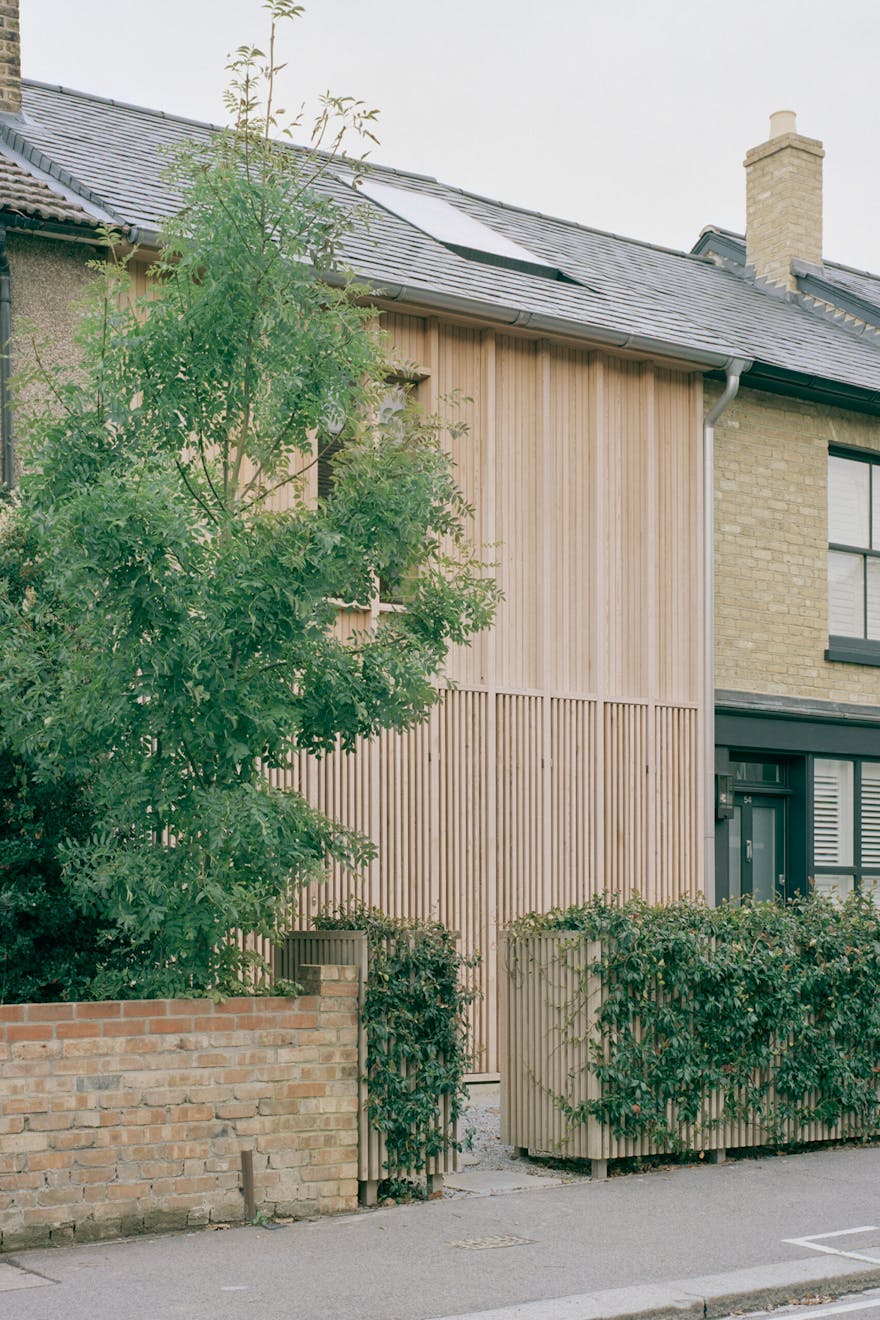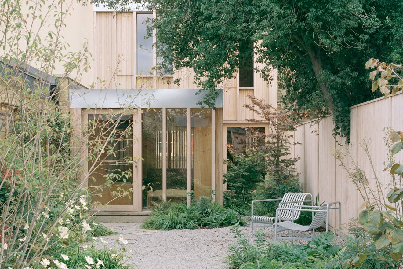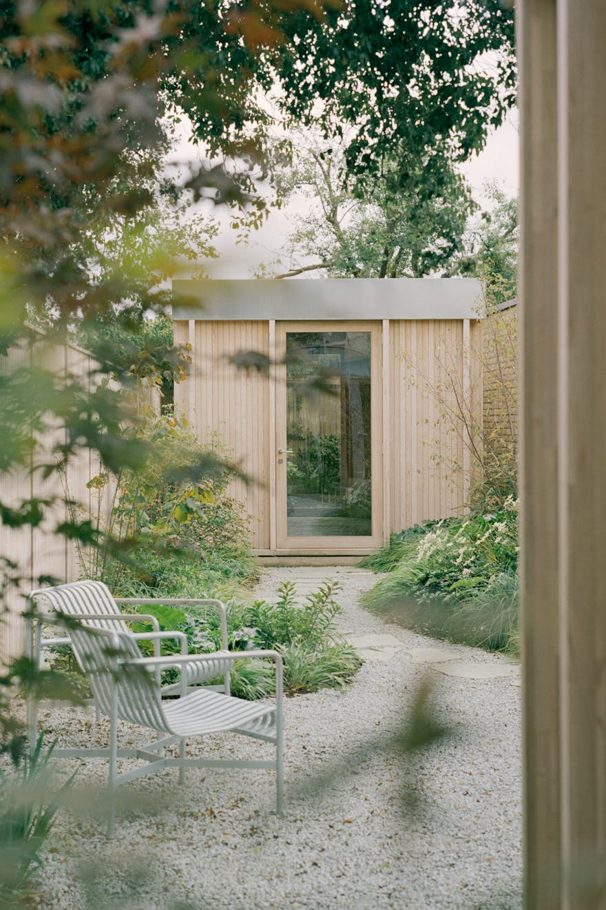 At the back of the long 12-meter garden of Spruce House stands a separate design studio that is a notable feature of the property. The studio is built using traditional timber framing and is made up of larch glulam beams on the exterior and spruce on the interior. With clerestory windows and exposed overhead rafters, the studio provides natural cross ventilation and opens up to a smaller rear garden. The garden, designed to increase biodiversity and reintroduce pollinating plants, serves as a peaceful link between the house and studio.