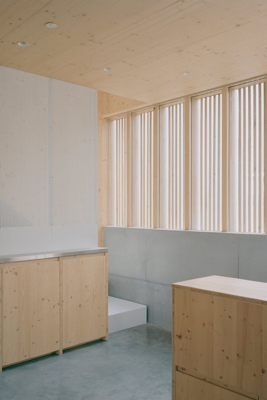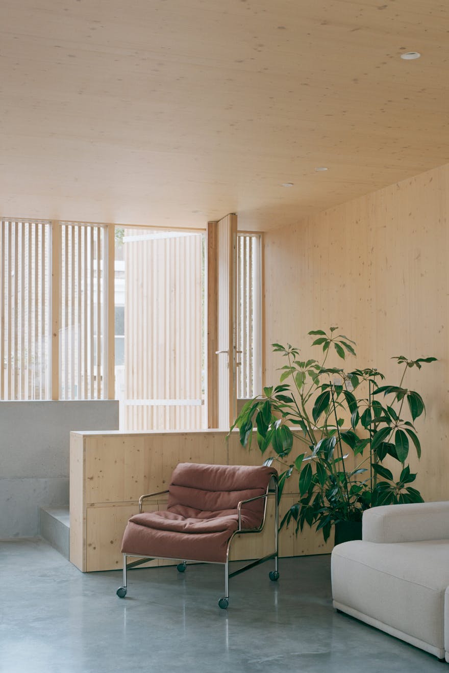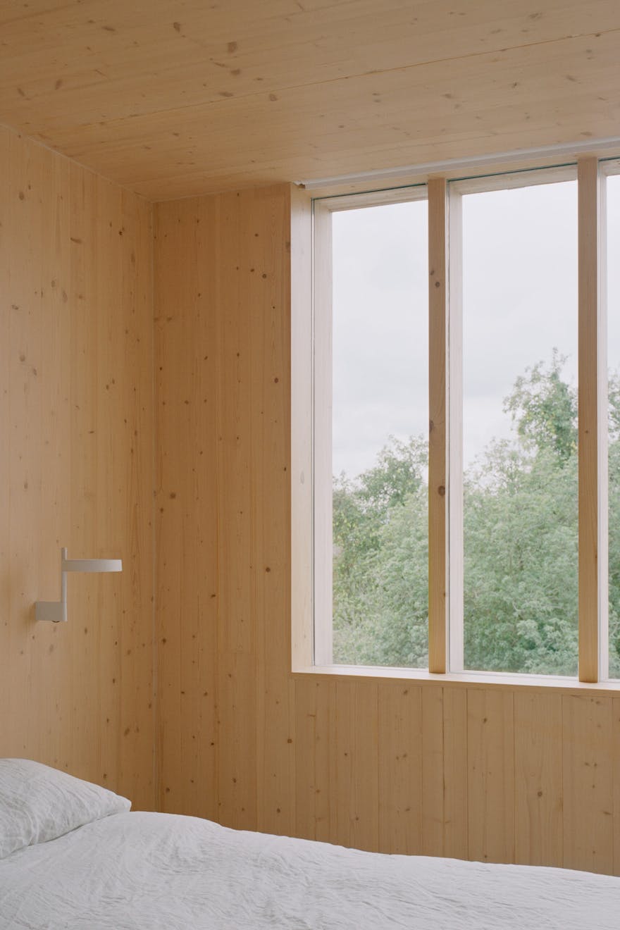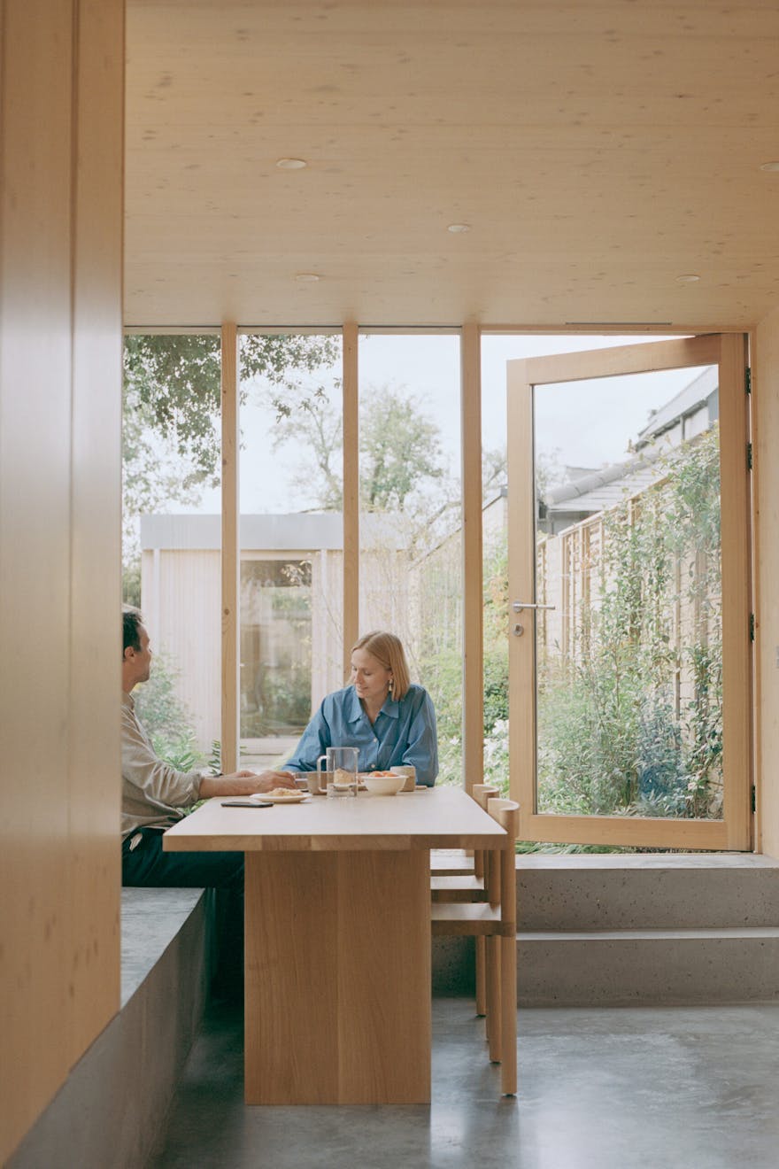 At the back of the long 12-meter garden of Spruce House stands a separate design studio that is a notable feature of the property. The studio is built using traditional timber framing and is made up of larch glulam beams on the exterior and spruce on the interior. With clerestory windows and exposed overhead rafters, the studio provides natural cross ventilation and opens up to a smaller rear garden. The garden, designed to increase biodiversity and reintroduce pollinating plants, serves as a peaceful link between the house and studio.