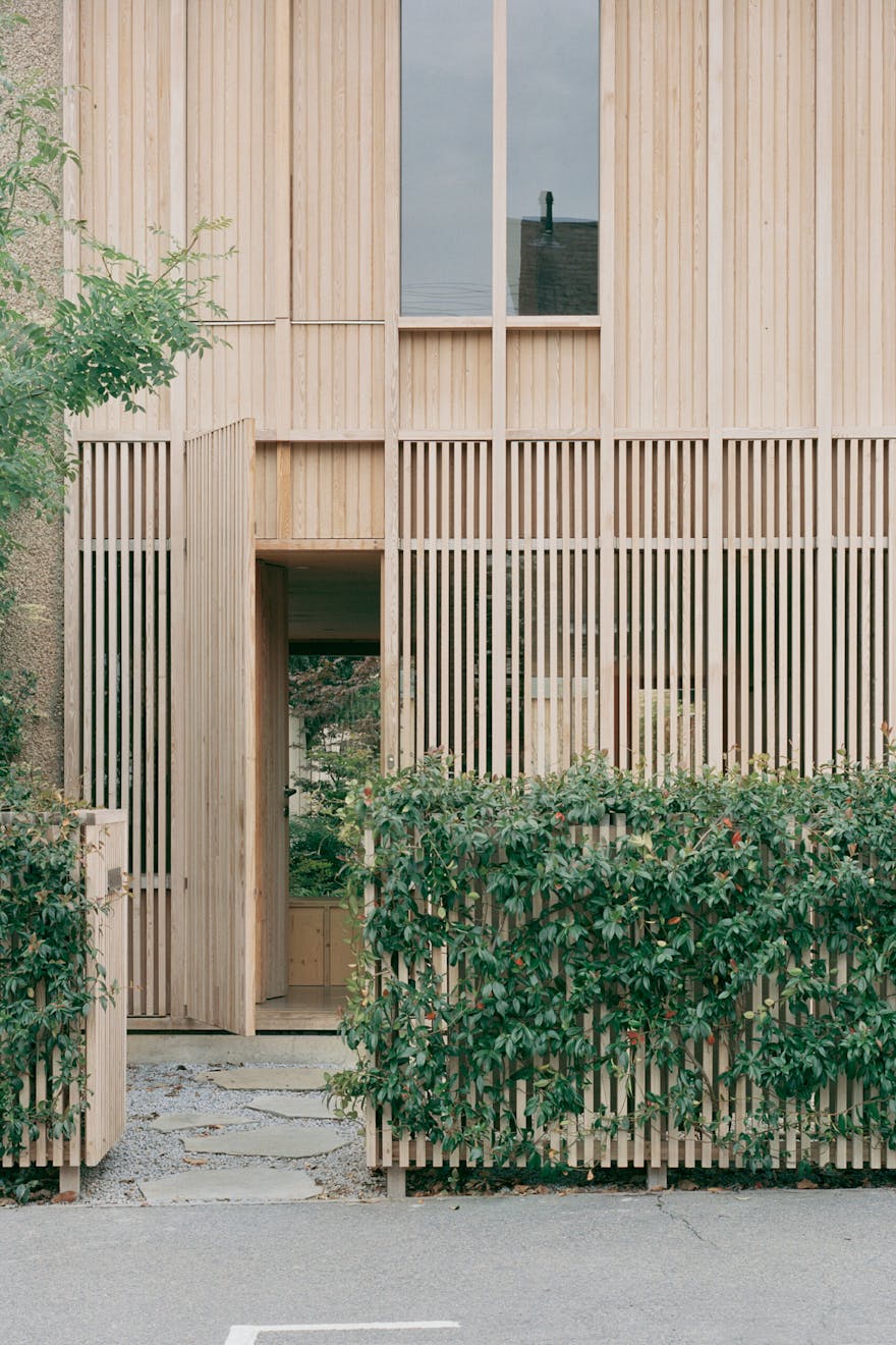 The design features an extensive use of glazing, with its width broken down by vertical timber battens and mullions. The repetition of slim timber-battens and mullions offers a vertical rhythm designed to create a contrasting facade of patterns at the ground and first floors. Layers are an important design idea of the facade, expressed through custom timber-batten privacy screens on the ground floor, offering glimpses through the house to the garden beyond.