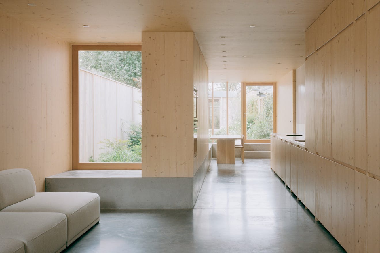 Spruce House by ao-ft architects is a modern house and self-contained design studio constructed from cross-laminated timber (CLT) on an infill site in East London. The project highlights ao-ft’s interest in sustainable construction and fabrication, resulting in a highly detailed home that prioritises wellbeing through the use of natural materials and close connections to its leafy rear garden.