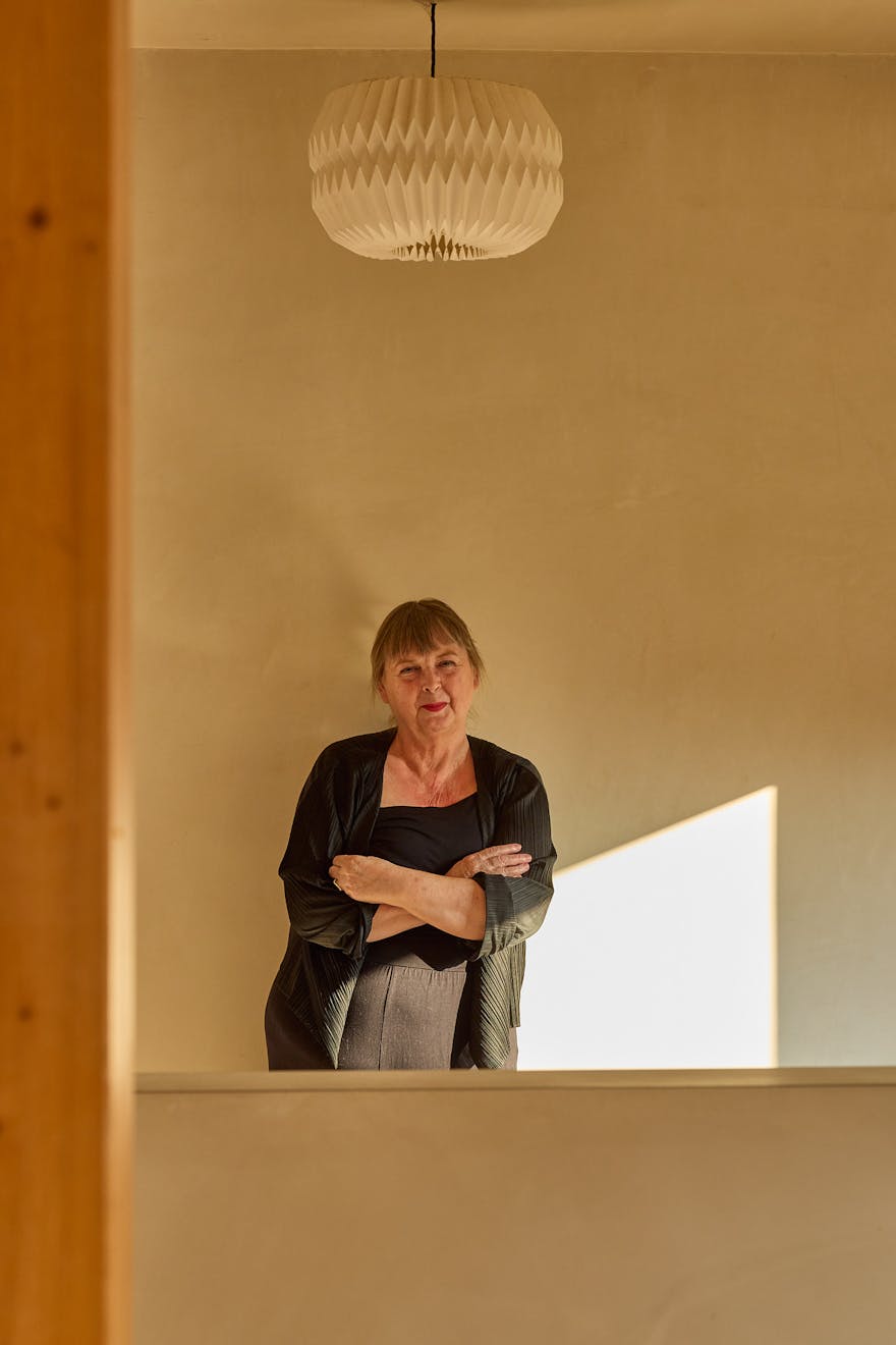Caron’s elderly cat Nelly (“she’s twenty-one!”) sits at the threshold to her home, surveying the terrace, adorned with olive trees, terracotta pots and ferns, while Caron describes her early inspiration for taking on a self build, “I had an aunt who built her house in the ‘60s.” she says, “I loved that you could make decisions about what it looked like and where things went.”