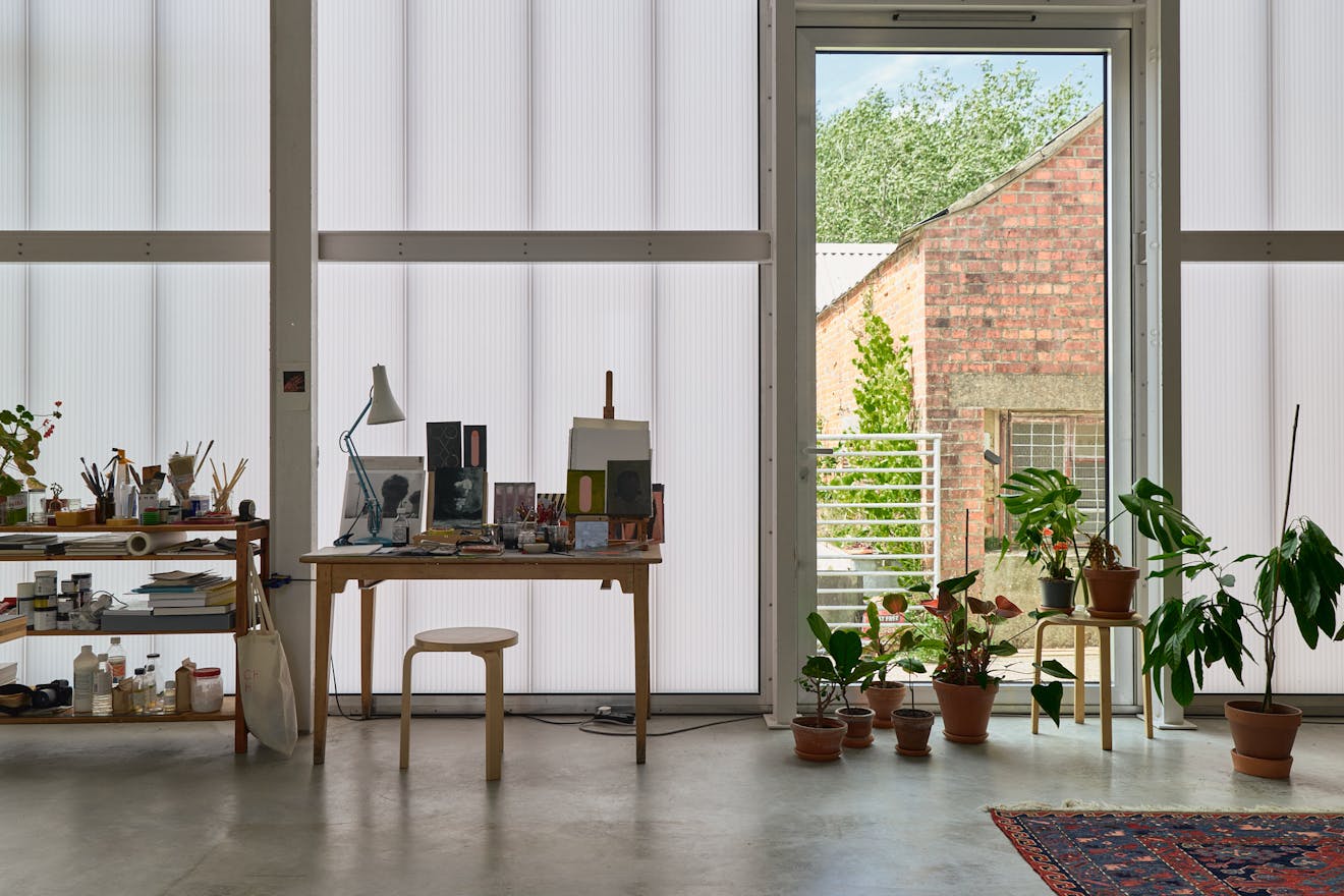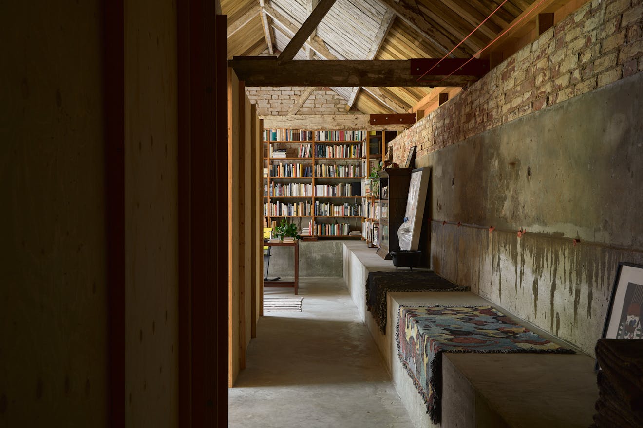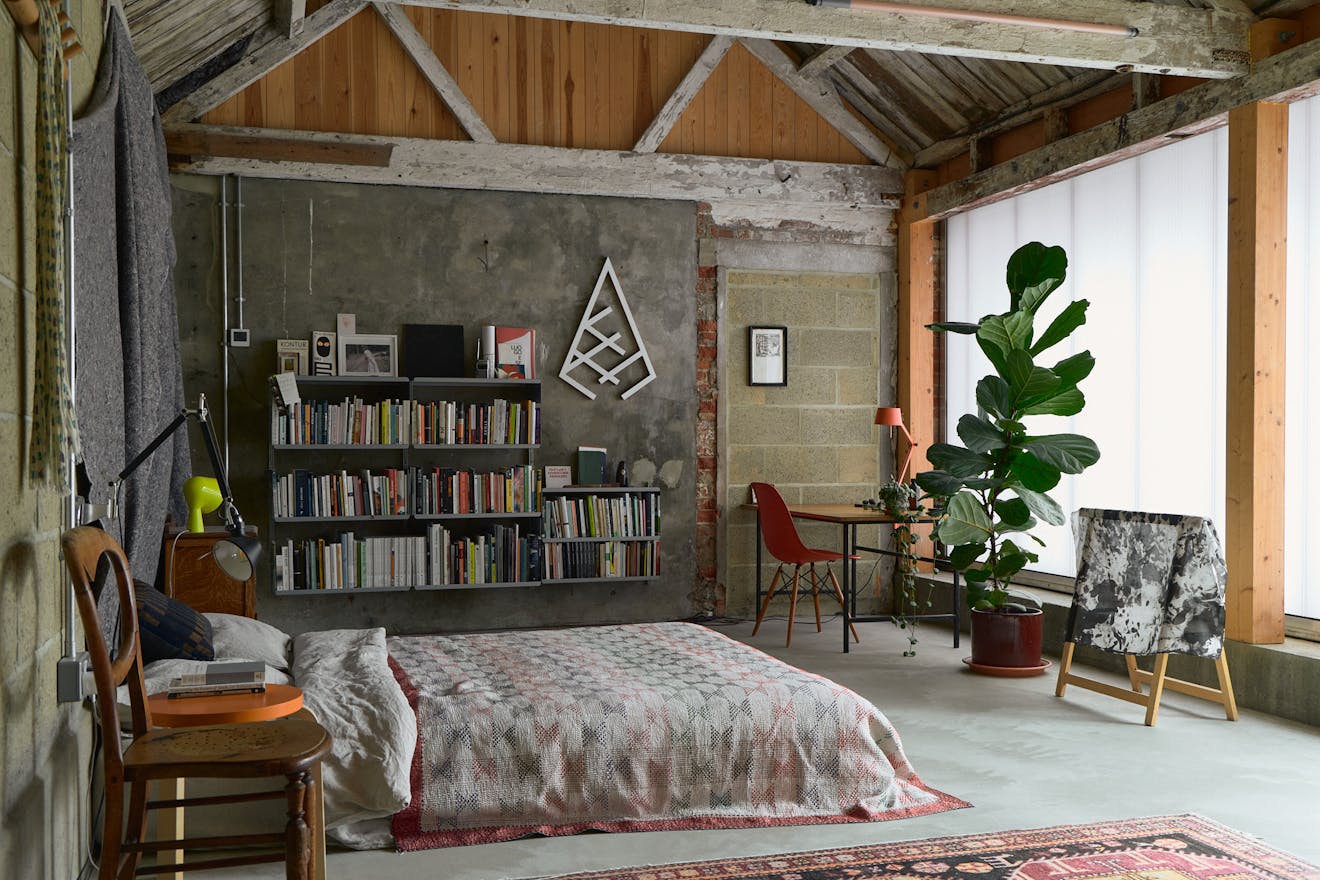 The approach to The Old Byre is as unassuming as they come. A winding country lane leads past two donkeys grazing lazily in a nearby field, before a glimpse of corrugated cement board signals the presence of an industrial building. This modest exterior nods to the ethos behind owner Joseph Kohlmaier’s long-nurtured passion project and is the result of a fruitful collaboration with architect Gianni Botsford, whom he first met decades ago. Inside, the building’s philosophy unfolds: two barns renovated to form a domestic space along with an open-door policy for fellow artists, its vernacular character demonstrated by the pocketholed brickwork yet enriched by modernist touches, from polycarbonate panels wrapping the barns to soaring glazed doors.