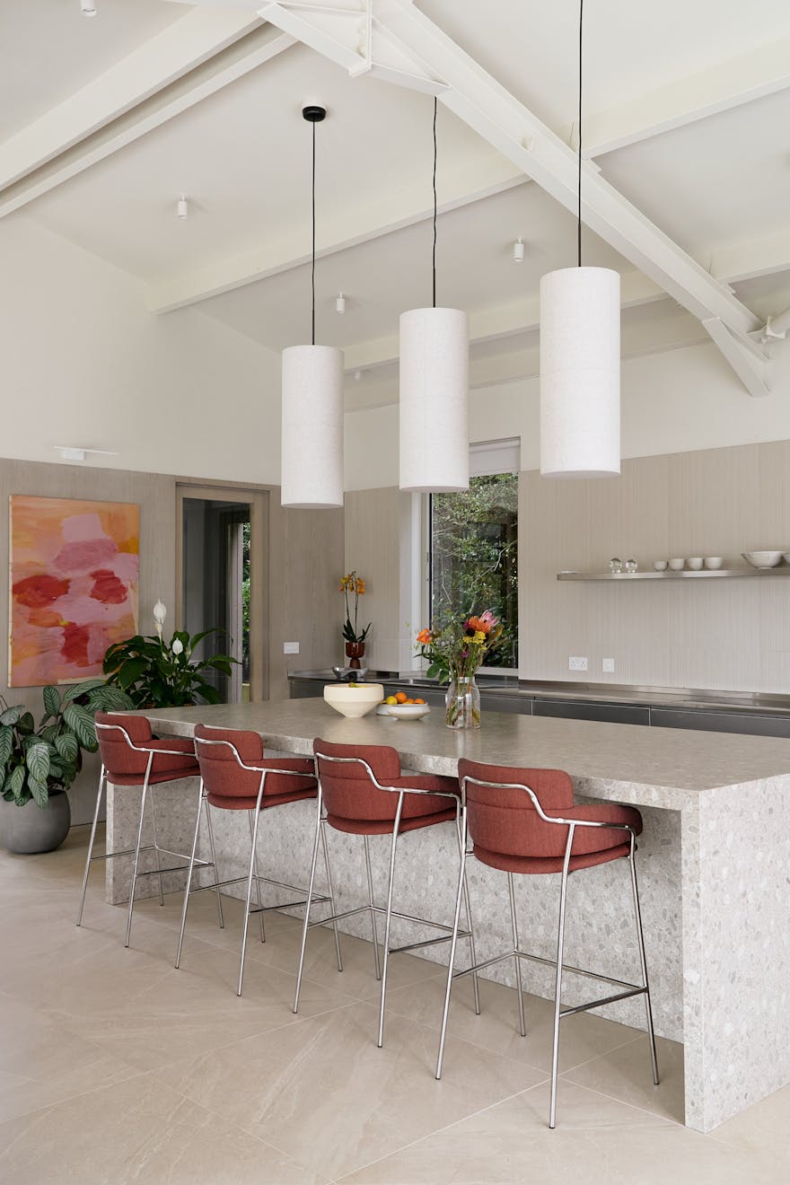 That same sense of conviction carried into their next project, Gibbs Barn. Amanda approached the home with care and a deep connection to its setting. “Under here is all sandstone,” she says, pointing to the Mandarin Stone pavers encircling the house. “Amanda’s choices around colours and furniture have a lot to do with the landscape,” Sean notes. “That palette is being brought into the building.”