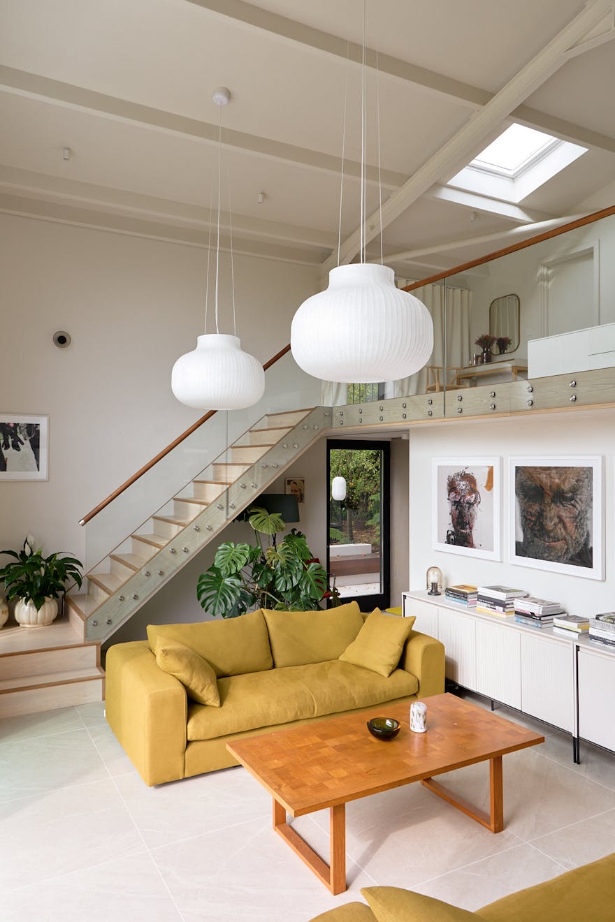 As anyone who’s tried to pick the right white paint knows, it’s a time-consuming task. “It took a long time to get the right colour because of the light changing all the time,” Amanda explains. To soften the building’s sharper angles, she installed a datum line of light wood that also serves as a backdrop to Sean’s large abstract paintings.