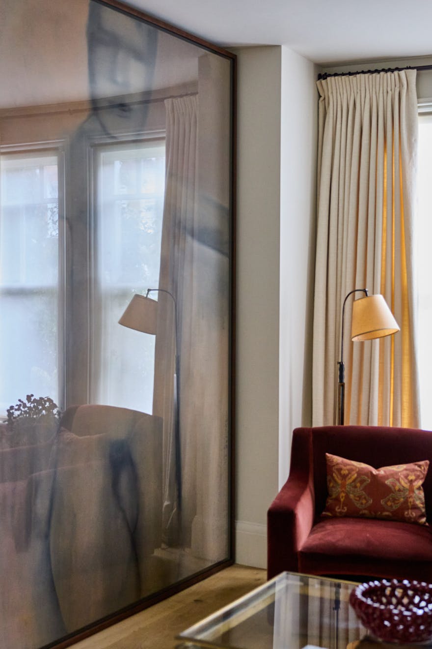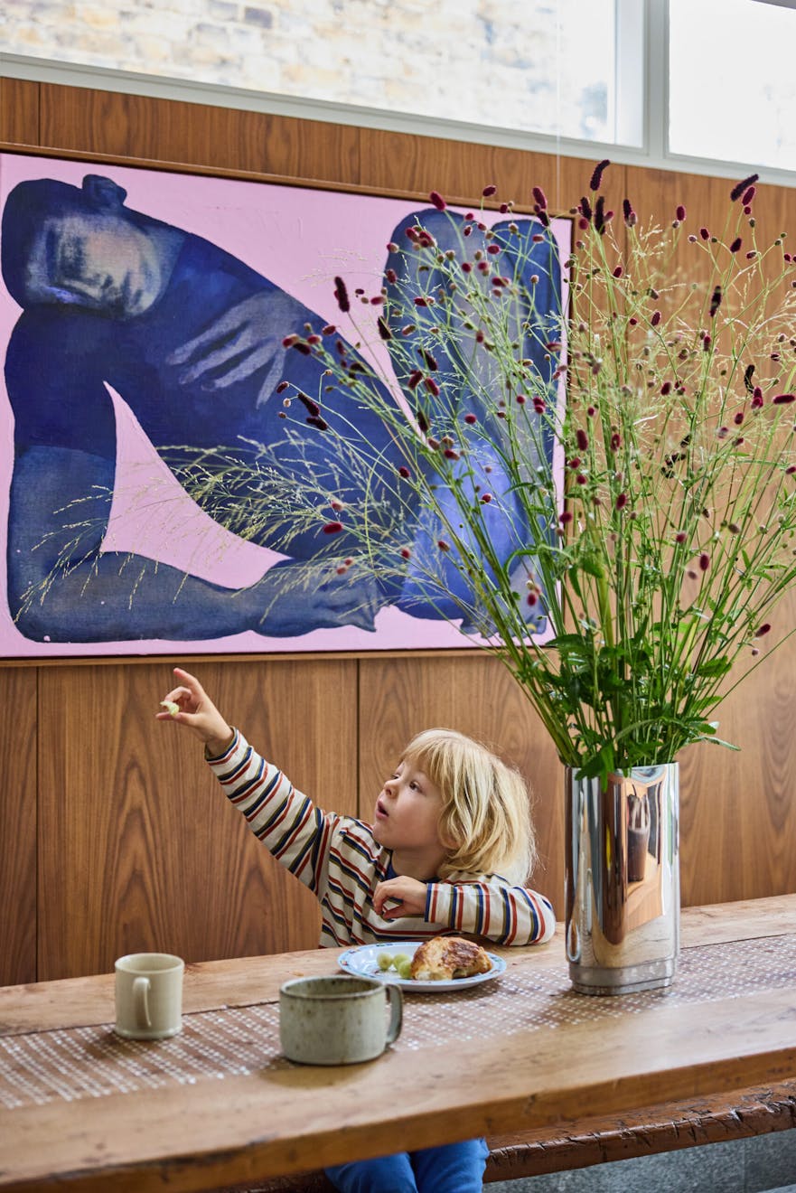 When we visited on a bright September day, it was immediately clear how integral art is to the family’s life. A vast figurative painting leans against the living room wall, commanding attention yet never overwhelming the space. “I was worried it would take over the wall, but it’s almost like a wall colour,” reflects Joss. One can’t help but wonder how such a monumental piece found its way into the room.