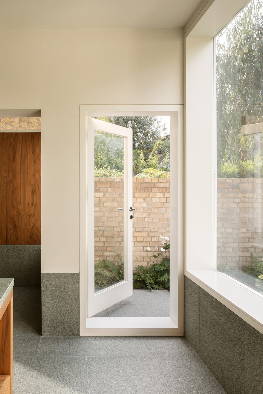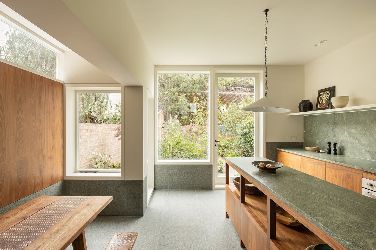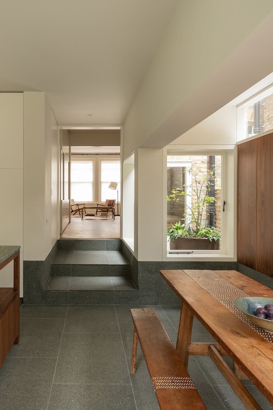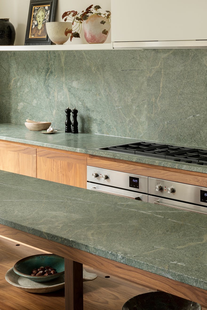In the reimagined kitchen and dining space, green granite runs underfoot and across the worktops, bringing visual harmony and grounding the room in a soft, natural hue. Amalia remembers the thinking behind the elongated steps that lead down into the space: “We wanted a central axis from the living room, three steps down. Those steps became almost like a plinth; deep, generous, and inviting.” The green tones subtly echo the garden beyond, a view the family delights in daily. “We love stepping down into the kitchen and seeing the garden framed from the living room,” says Joss.