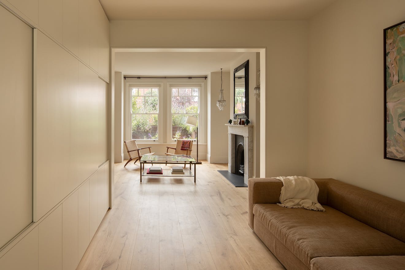 To complement the overall palette, walnut introduces a layer of warmth and refinement to the sociable living area, providing a rich backdrop for a pink abstract painting, which was a wedding gift from Lucy to Joss.