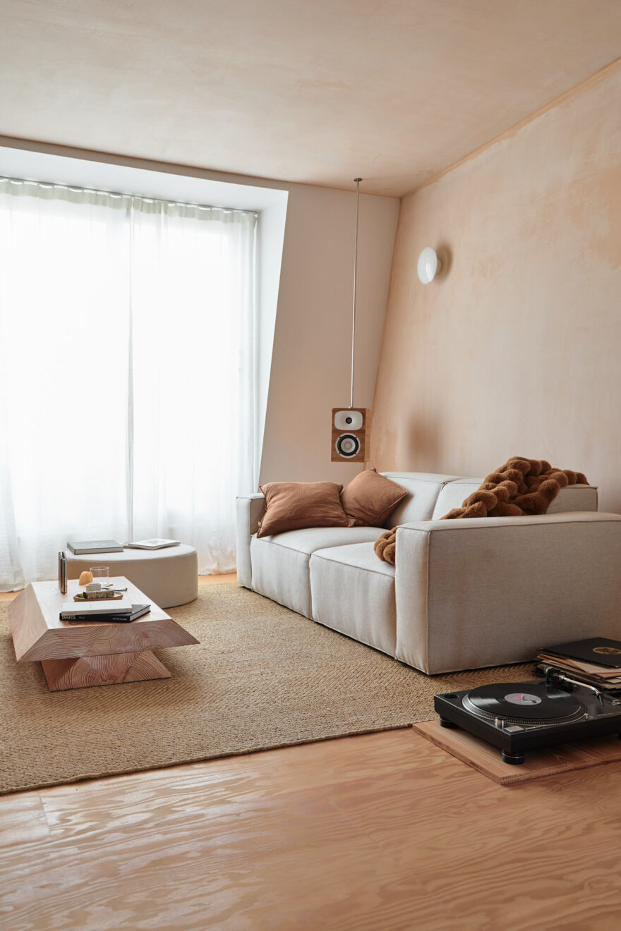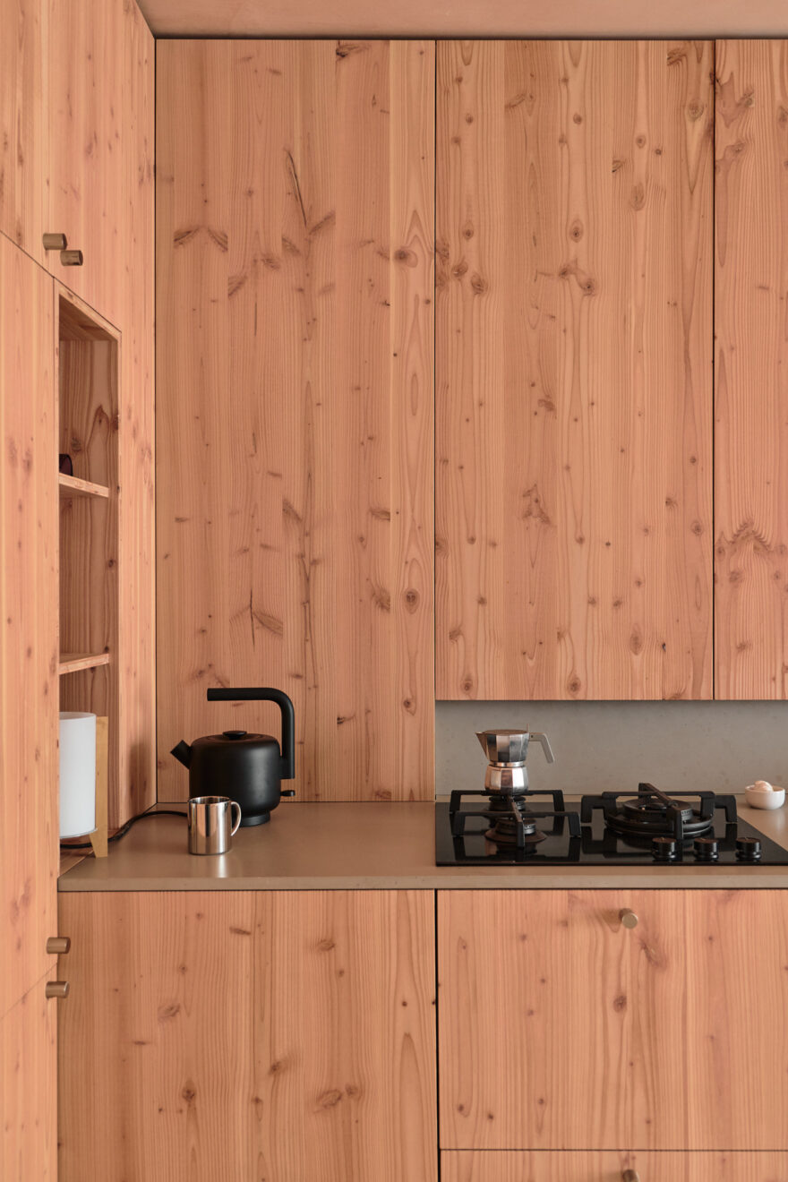 I’ve always wanted to create a space that celebrates the use of timber, hence the name “Living with Timber”. I also like the idea of having spaces that feel quite raw. So we’ve kept the raw plaster on the walls. We’ve also enhanced the tone of the timber, so it has this sort of soft, pink quality.