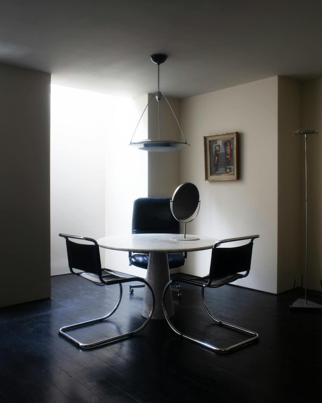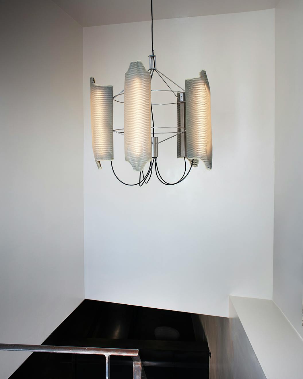 Max: It’s a bespoke pendant from LS Gomma. He’s someone we’ve worked with at the gallery for quite some time and we commissioned this double stack pendant for the space. Karen collected a few of his pieces before and was a fan. It’s polyurethane with wire mesh running through it and the framing is stainless steel. All the framing is by the same fabricators in the Midlands he’s been using for the past 10 years. They’re all in the 70s now and they do all the rubber and mesh work themselves. The wire mesh is dipped in liquid polyurethane as it’s curing and shaped, so there’s still some movement.
