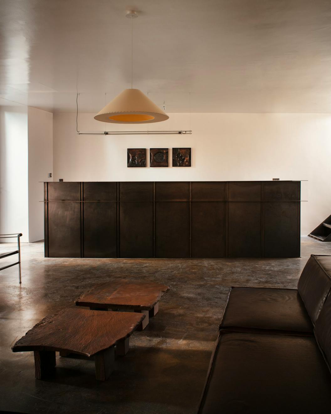 Max: We tried to tonally mix up the leathers a bit, so the chairs are in black leather and then the sofa is in a dark brown. The floor is just a cast concrete floor. We are sort of blessed with it being quite patchy. We were aiming for a fully formed space when it dropped rather than something that needed to age in.