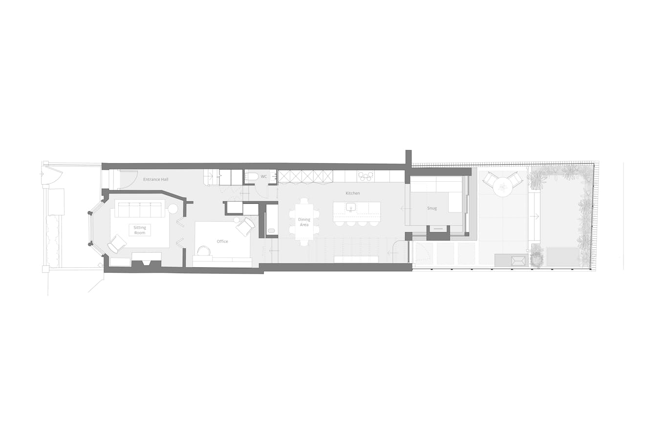 Choosing not to place a dining room at the edge of the garden was a deliberate decision, one Matthew recalls was guided by questioning conventional thinking. “Having a comfortable seating area at the edge of the garden felt far more appealing than a dining table,” he explains. “That’s where they spend most of their time now, sitting against the glass, gazing out into the garden or back towards the house. It’s a place of comfort. A dining table would have you sitting upright, looking down. We wanted a space where you can look around, not just down.”