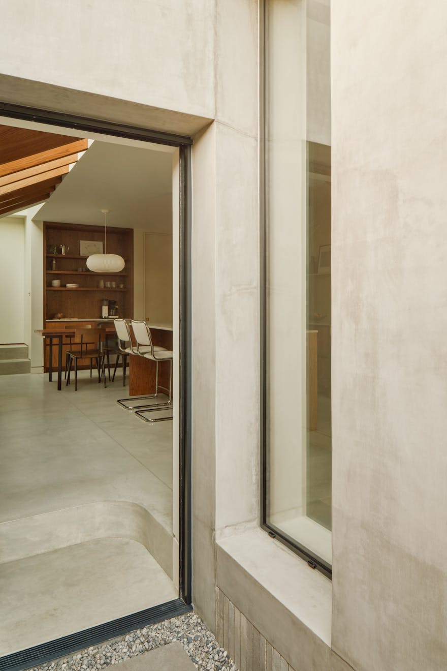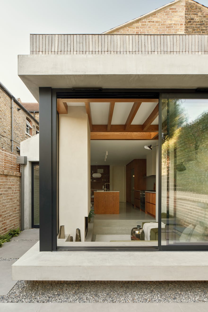The loggia’s material language is anchored in concrete, poured in-situ by their builder. “The contrast between the geometry at the back and the Victorian detailing at the front was important,” Anthony recalls. “We didn’t want to recreate the past.” Instead, the design creates a dialogue between indoor and outdoor living. When the glazing is fully drawn back, the loggia evokes not only Roberta’s Brazilian heritage but also the relaxed 1970s “conversation pits,” reshaping how the family uses the space. “In the summer, we want to be outside,” Roberta explains. “It can get a bit late for the kids, but they still want to hang out with us, so we’re having a drink outside while they watch a film on the sofa.”