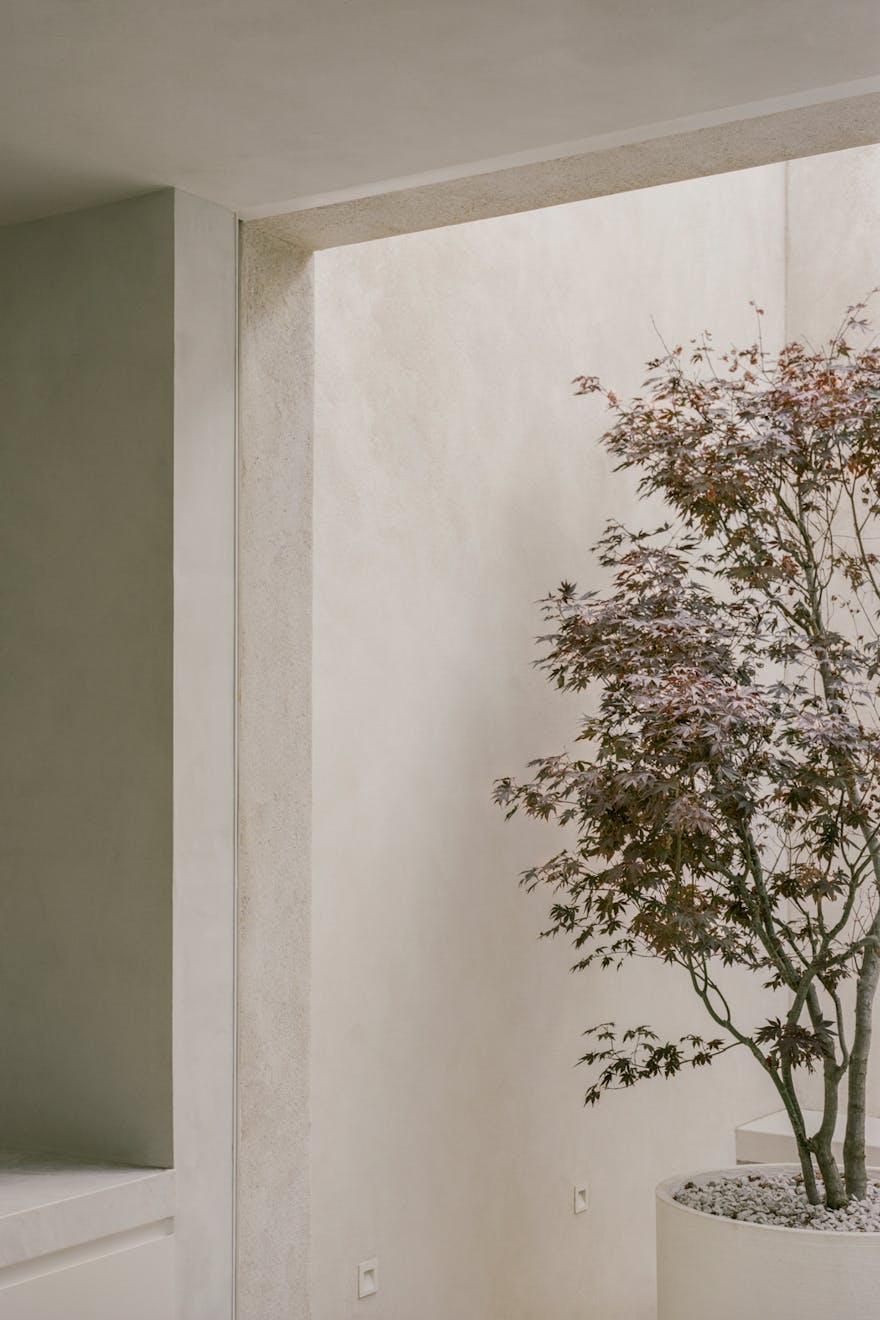 The design team also paid close attention to the exterior space, creating a lightwell drawing in daylight to the rear of the property. The space is loosely structured by a pair of simple geometric forms: a planar bench and cylindrical pot. The bespoke pot is handmade from Ecocrete, a recycled cementitious based material, in a bone white finish with lightly brushed strata and topped with white limestone chippings. Low-level wall lights are discreetly recessed and powder-coated to match the plaster.