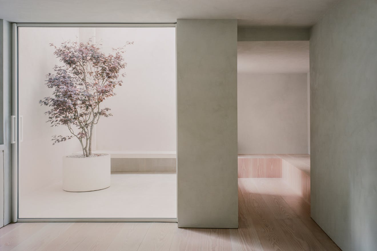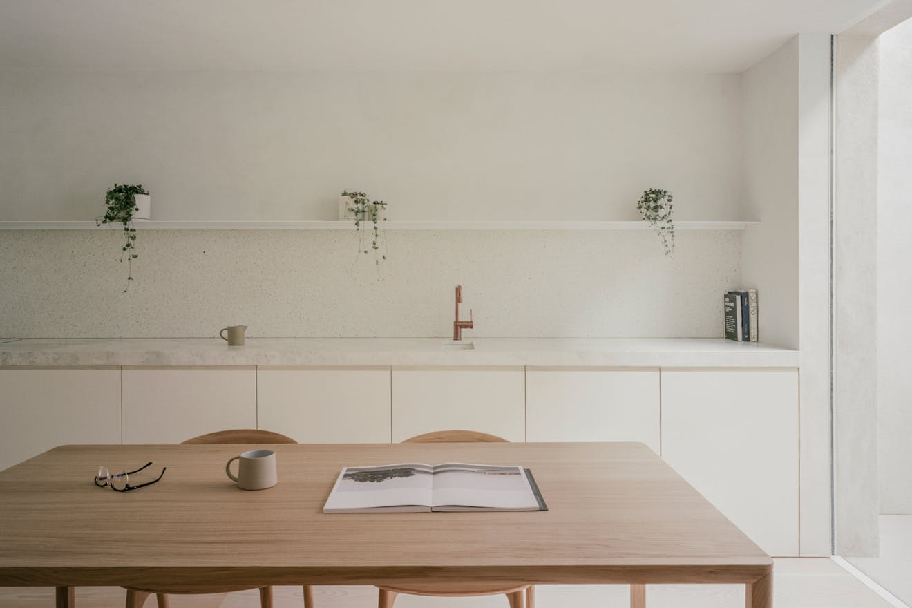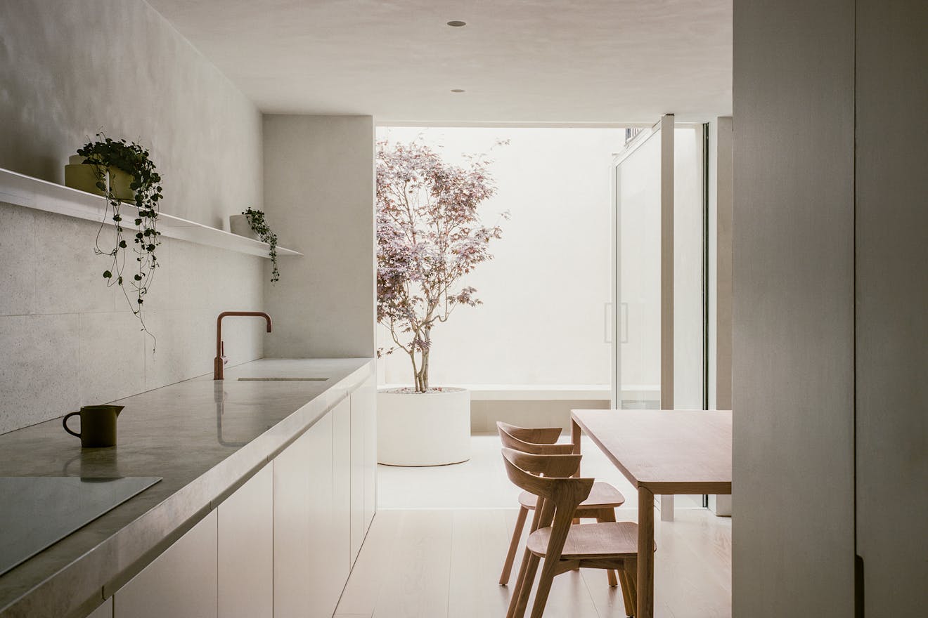The interior of Elizabeth Mews is just as impressive as the exterior. The minimalist spirit runs through a calm, contemplative interior defined by tonal and textural nuances that help the space to read as a uniform whole. Central to this is a specialist Danish plaster, which unifies walls and ceiling with a fabric-like surface suggesting undefined textiles. The galley kitchen expands into a dining area, before contracting into a snug beyond, creating a flow that is both functional and visually appealing.