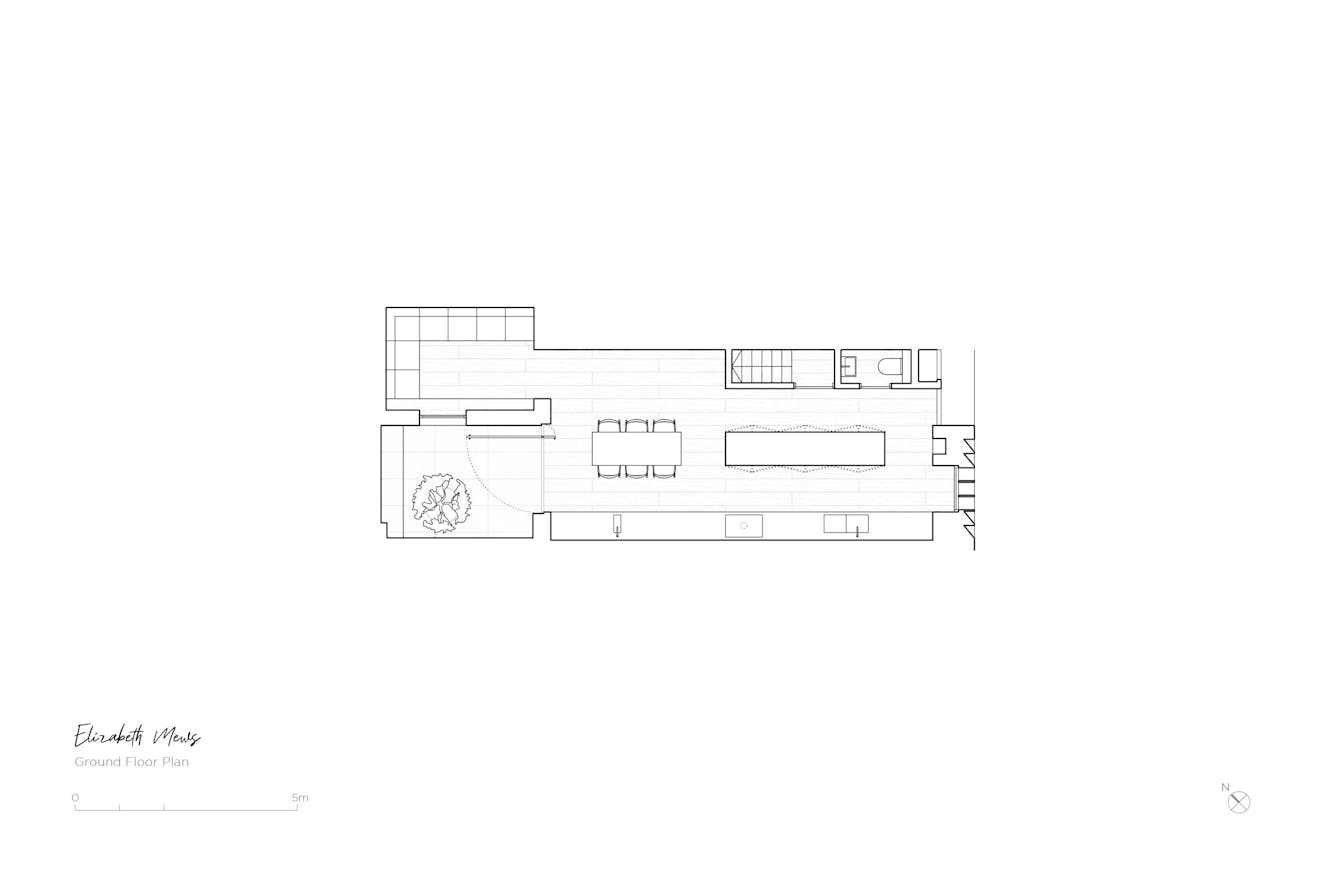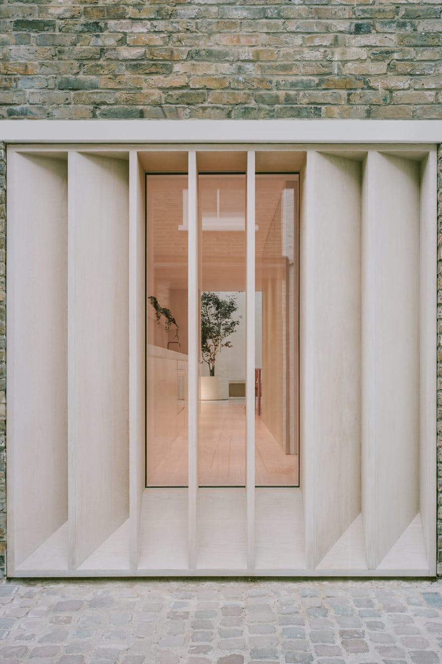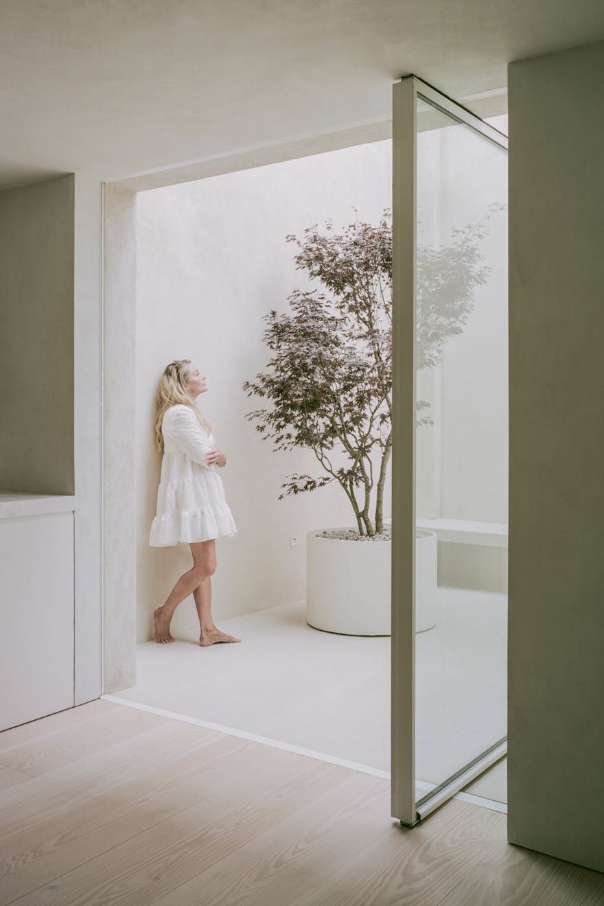 The interior of Elizabeth Mews is just as impressive as the exterior. The minimalist spirit runs through a calm, contemplative interior defined by tonal and textural nuances that help the space to read as a uniform whole. Central to this is a specialist Danish plaster, which unifies walls and ceiling with a fabric-like surface suggesting undefined textiles. The galley kitchen expands into a dining area, before contracting into a snug beyond, creating a flow that is both functional and visually appealing.
