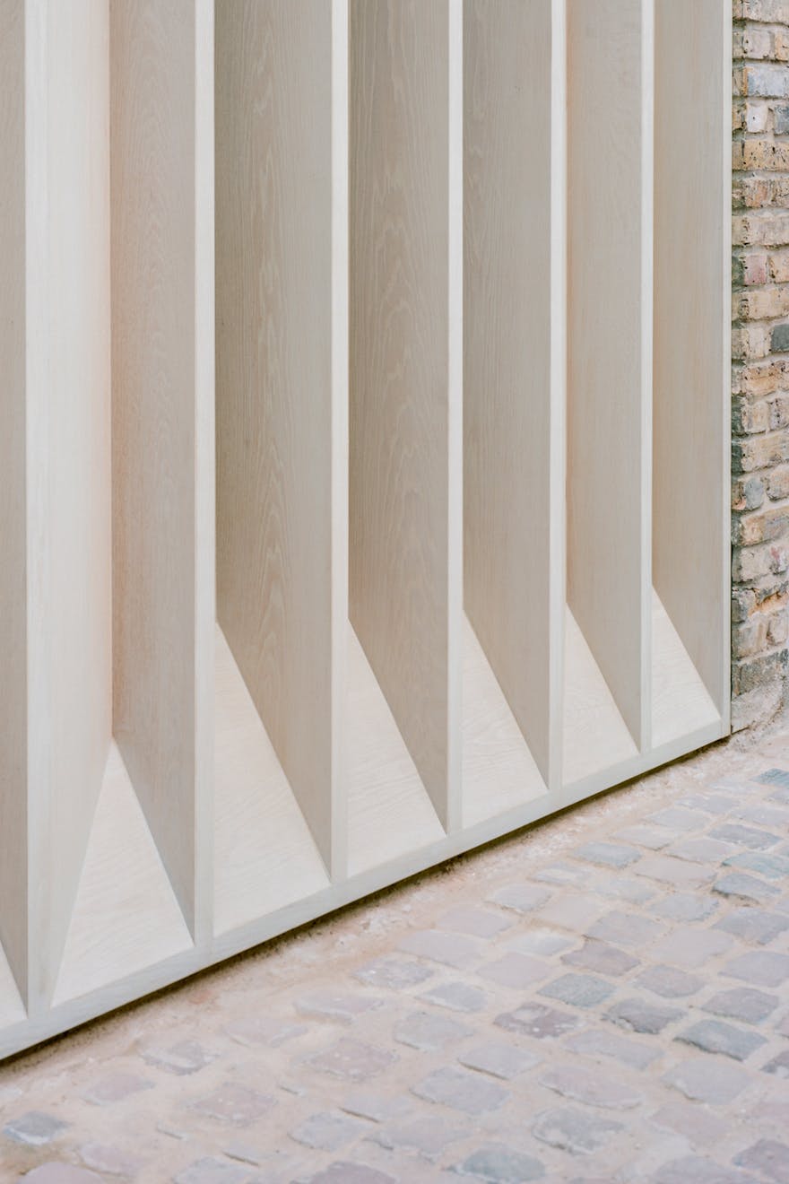 One of the standout features of the house is the former garage door, which has been reimagined as a finely crafted oak-finned composition. The chamfered finned arrangement serves a functional role in reconciling the competing considerations around daylight and privacy screening. The detailed design resolution was developed through a series of workshops with the woodworking team, resulting in a sculptural simplicity that evokes the wood sculptures of artist Donald Judd.