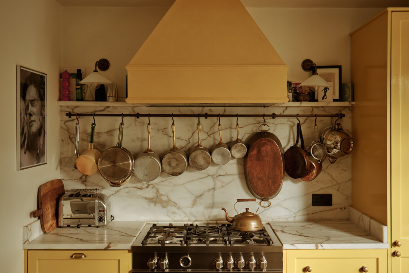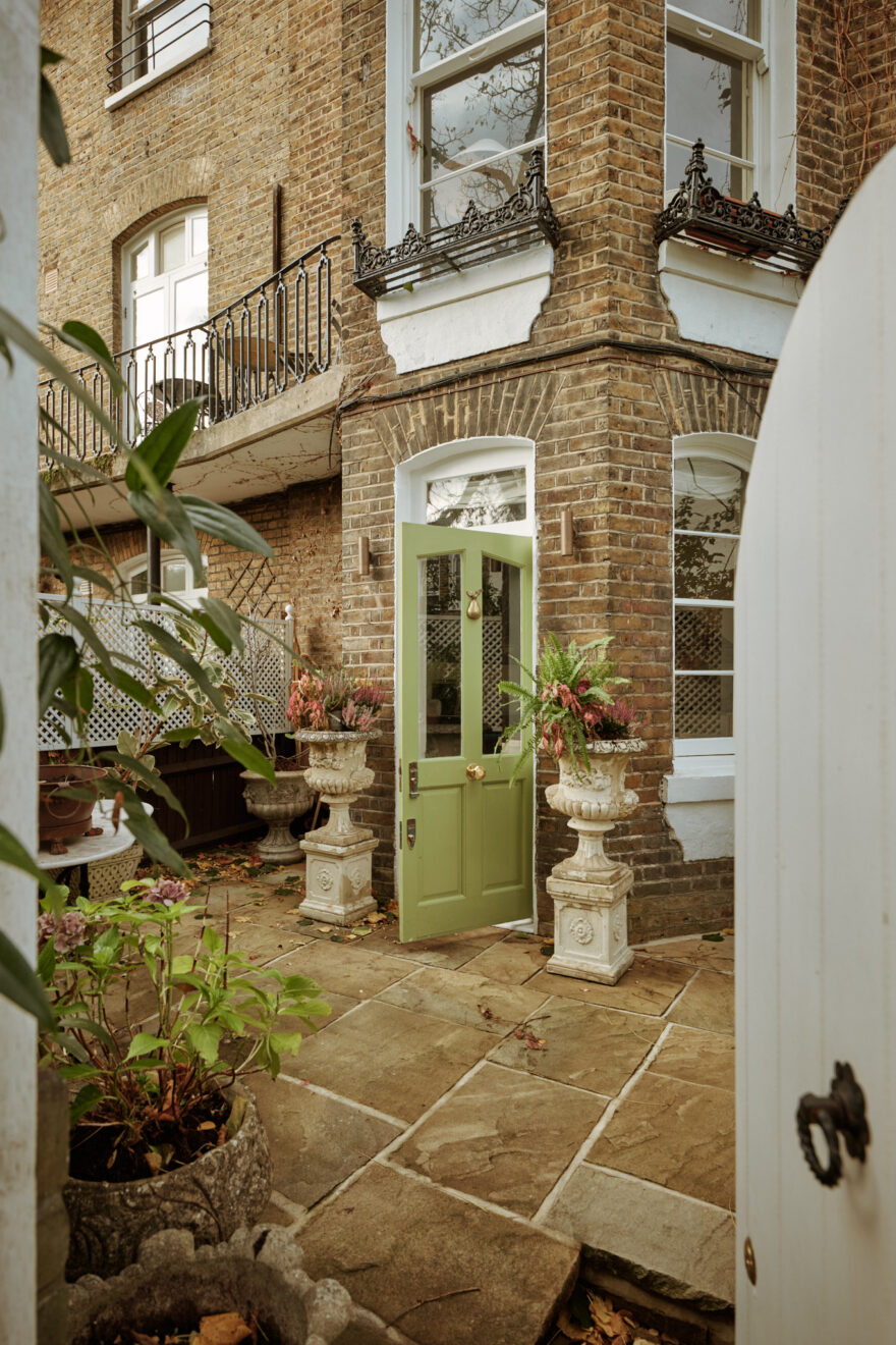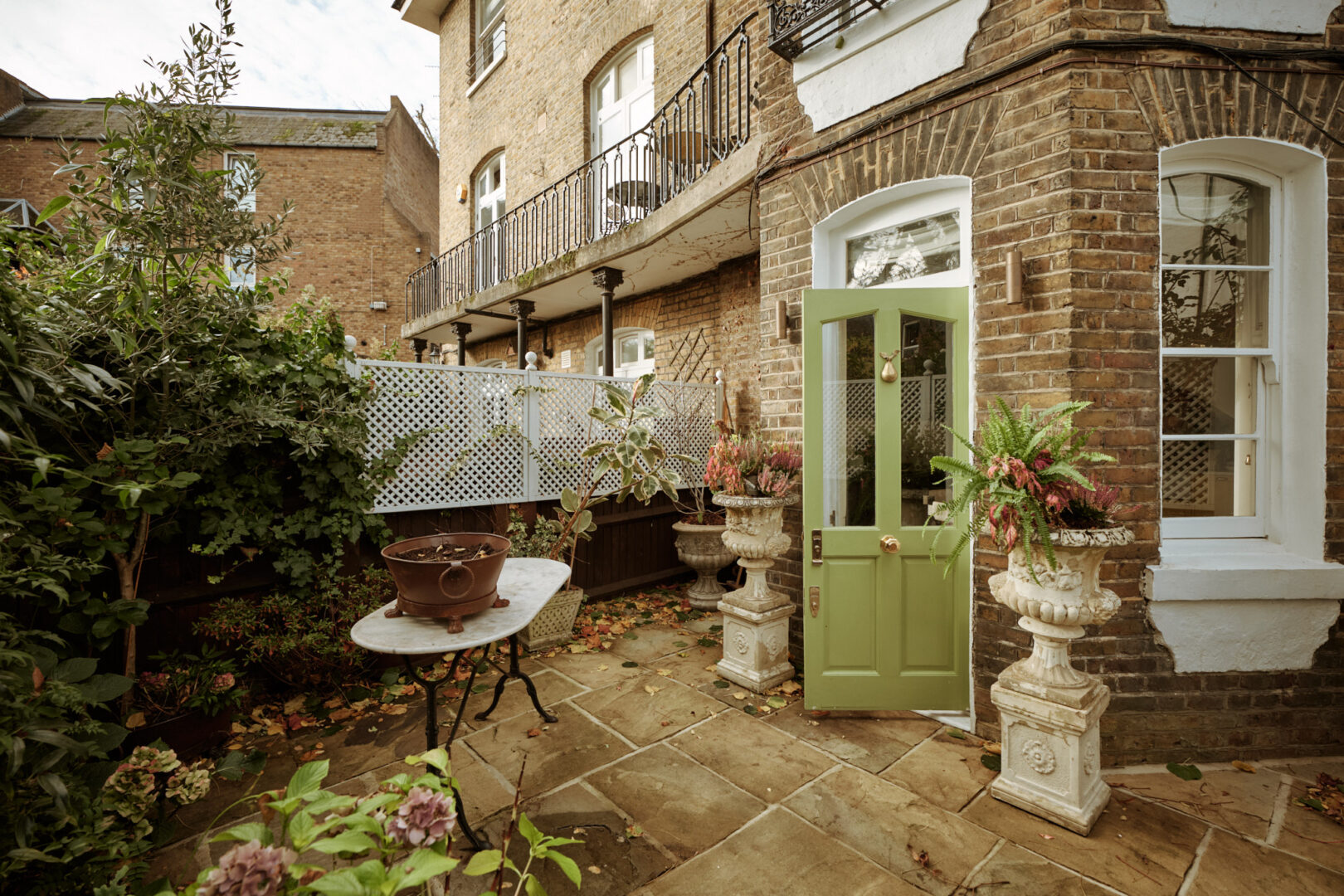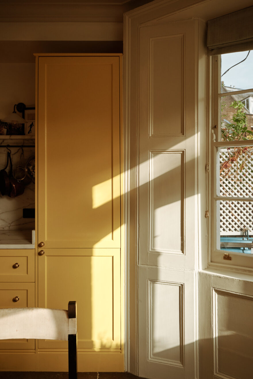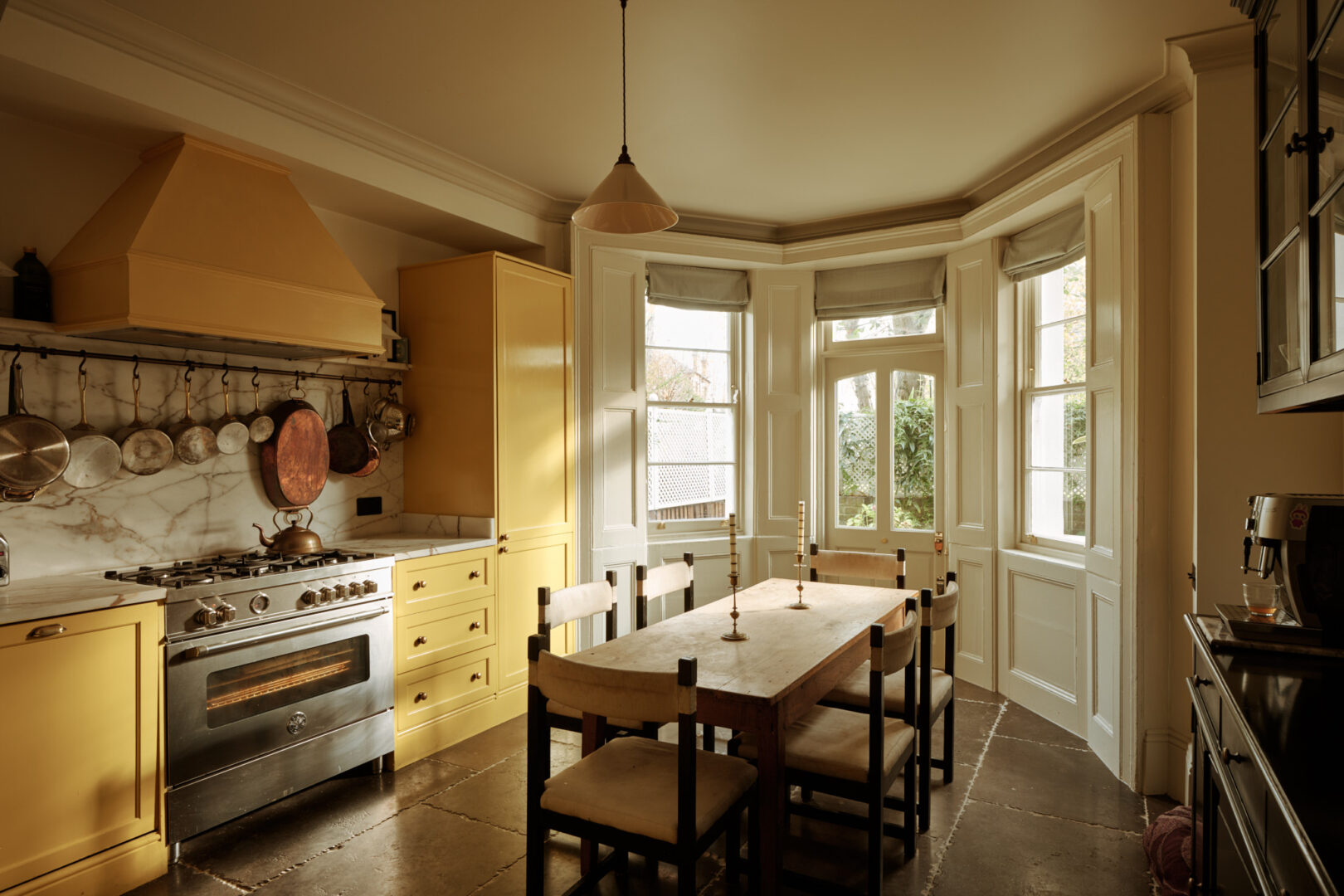 At the rear of the layout sits a cheerful yellow kitchen, painted in ‘Babouche’ by Farrow & Ball and finished with a bespoke Calacatta Mocha marble worktop, backsplash, and open shelving. A Bertazzoni Italia range oven and Miele appliances complete the space, along with the Corston Architectural fittings which have been smartly positioned at waist-height, emblematic of the impeccable attention to details throughout the home. Restored sash windows frame a French door that opens onto a paved courtyard garden, with a wooden gate providing direct access to the residents’ park.