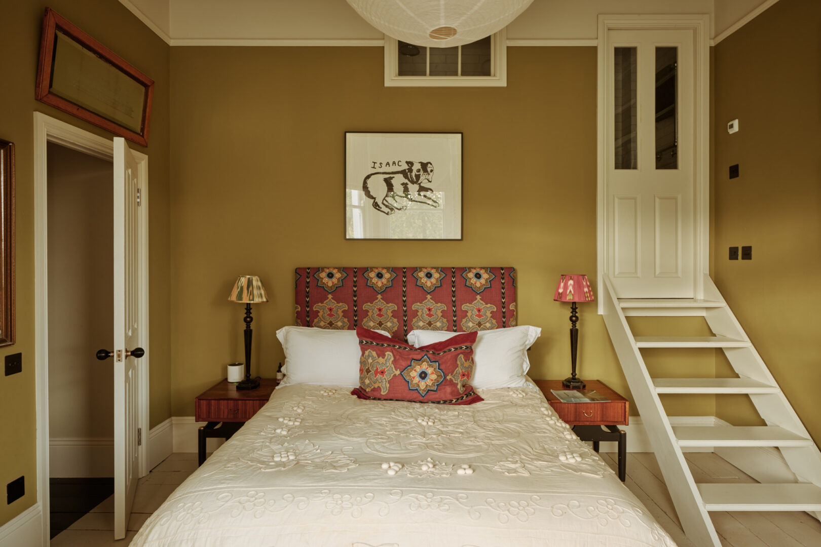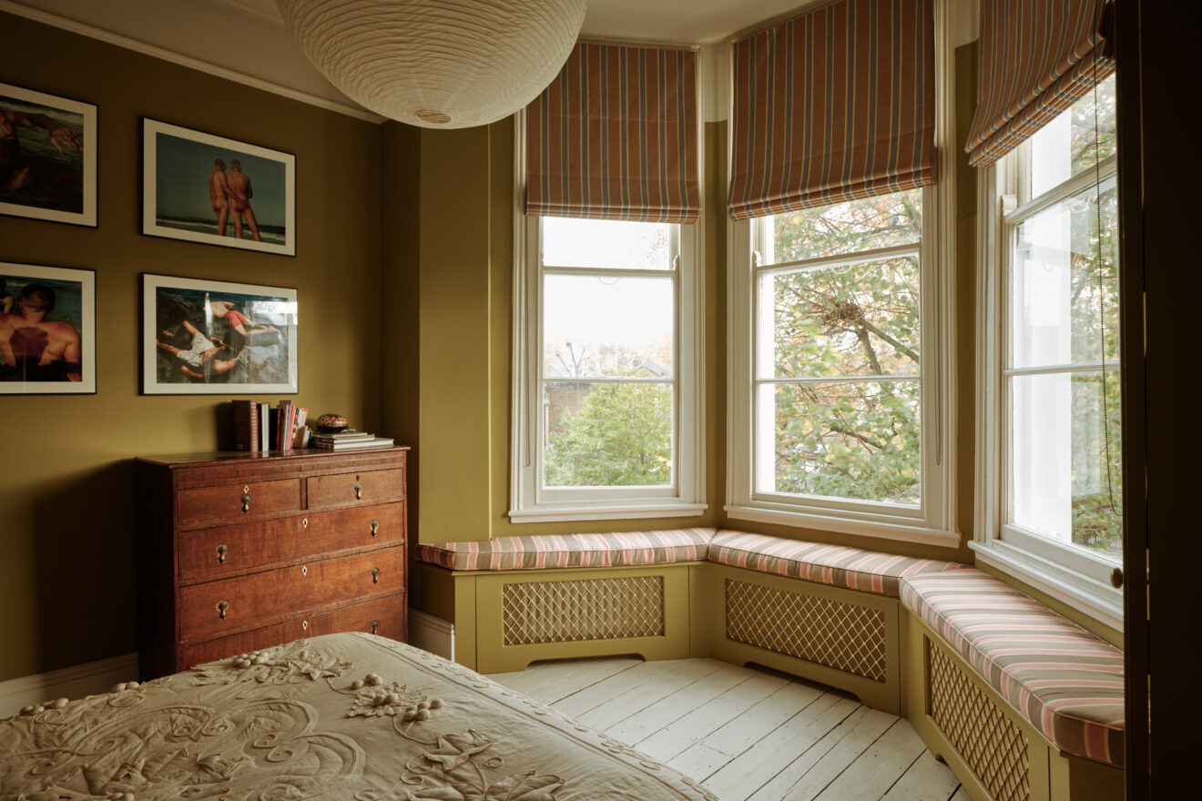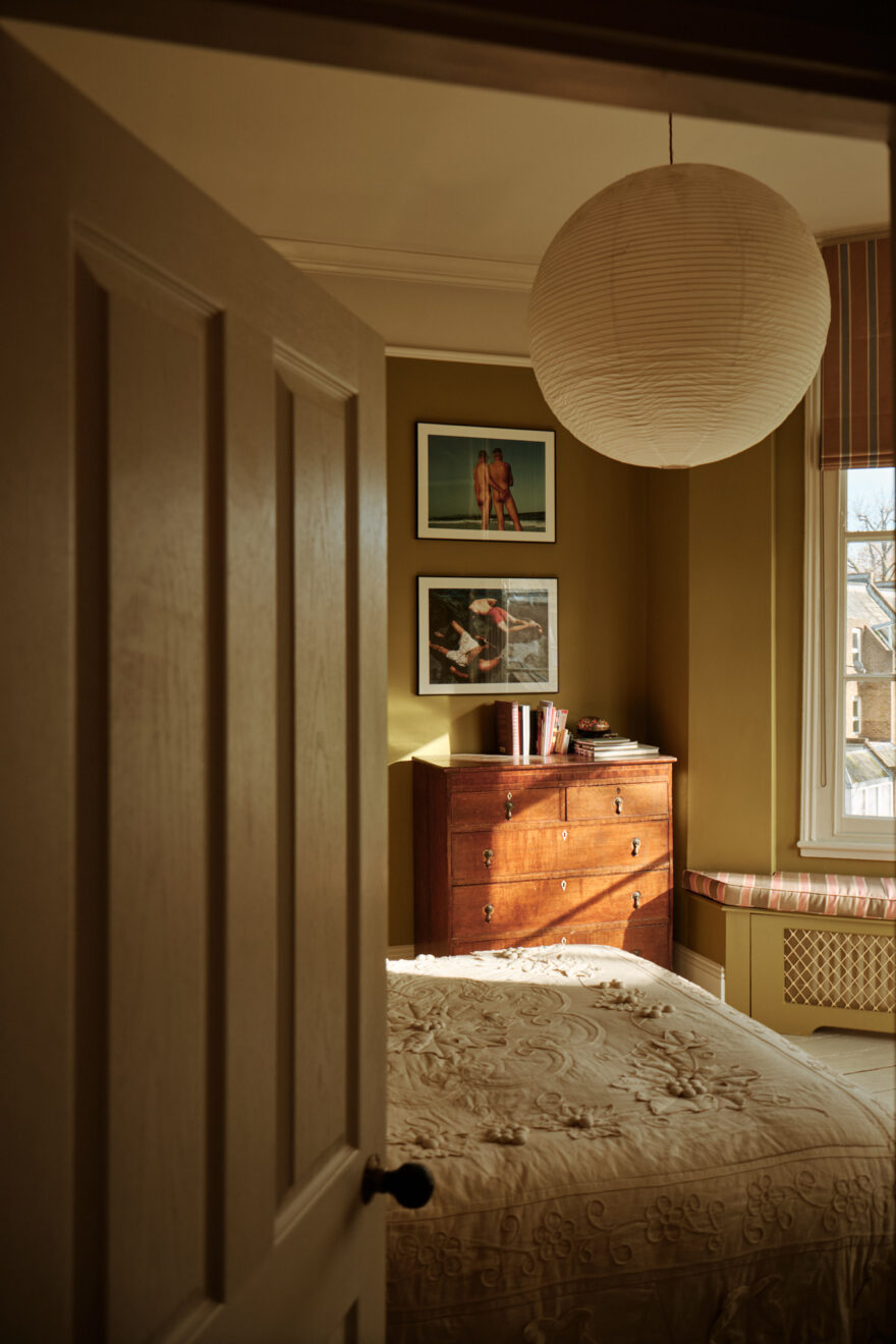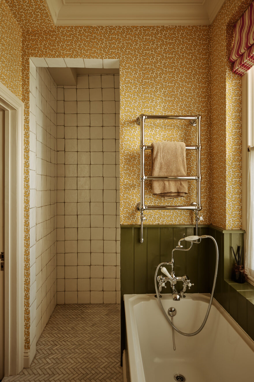 On the second floor, the principal suite boasts impressive ceiling heights, built-in storage, and an en suite adorned with bespoke marble tiling by Mandarin Stone. Two additional bedrooms extend across the width of the building, while the family bathroom features a glossy olive-green palette complemented by yellow Colefax and Fowler wallpaper, and includes a separate walk-in shower.