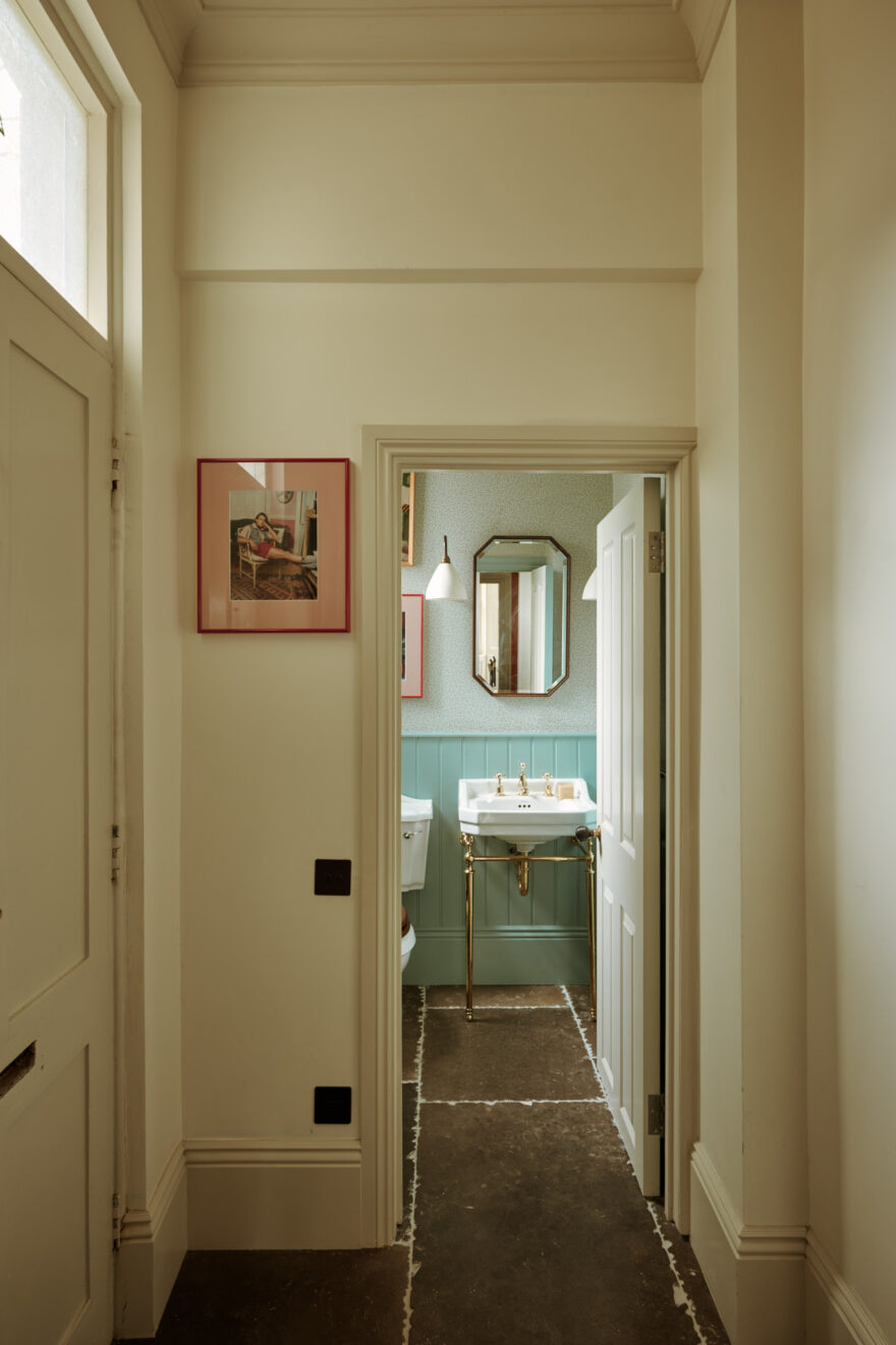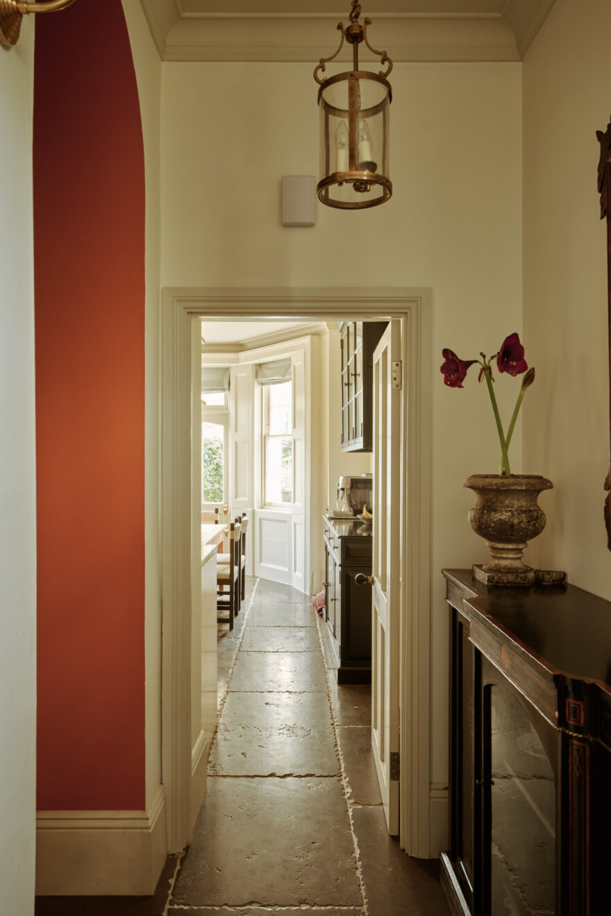 Accessed via a private entrance, the apartment opens onto a hallway laid with slate flagstones and underfloor heating. As part of a comprehensive renovation completed two years ago, a guest W/C, decorated with wallpaper by Colefax and Fowler, and boot room were intelligently incorporated, alongside a full rewire and the installation of a new heat pump and water pressure system. The harmonious paint palette was mostly sourced from Paper and Paints by Patrick Baty which specialises on historically accurate colours.