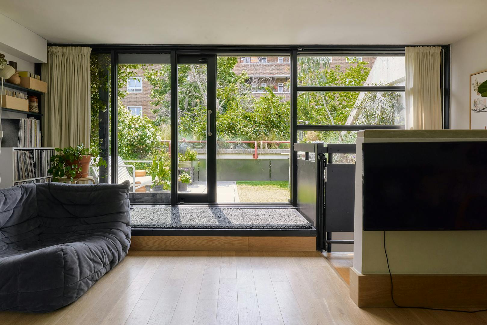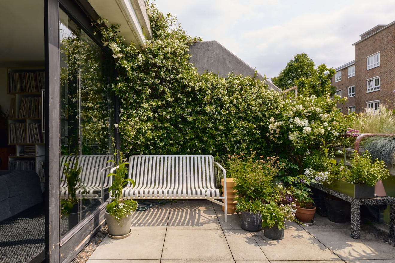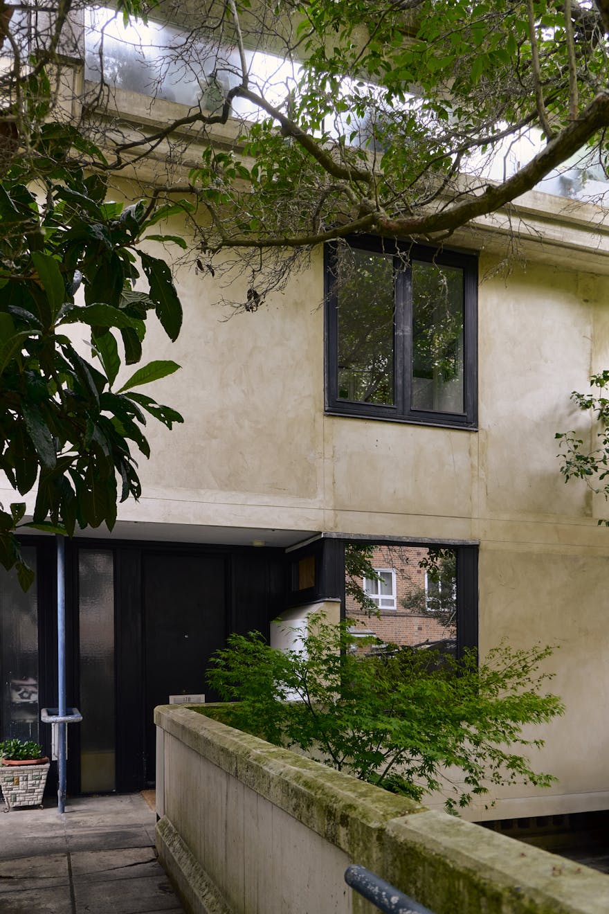 The upper level holds a large open-plan living and dining room, bookended by a deep terrace overlooking the estate’s planting scheme. Sliding glass doors dissolve the threshold between inside and out, while a monochrome palette draws attention to original architectural details, steel balustrades, exposed frames, crisp geometry. The top-floor terrace offers a generous space for outdoor dining and is screened by mature climbers and jasmine. The front garden is similarly inviting, paved and partially shaded by established trees.