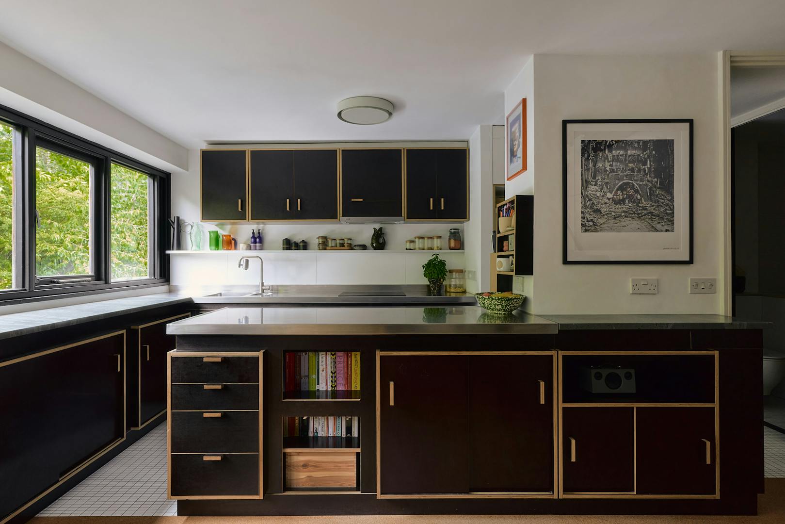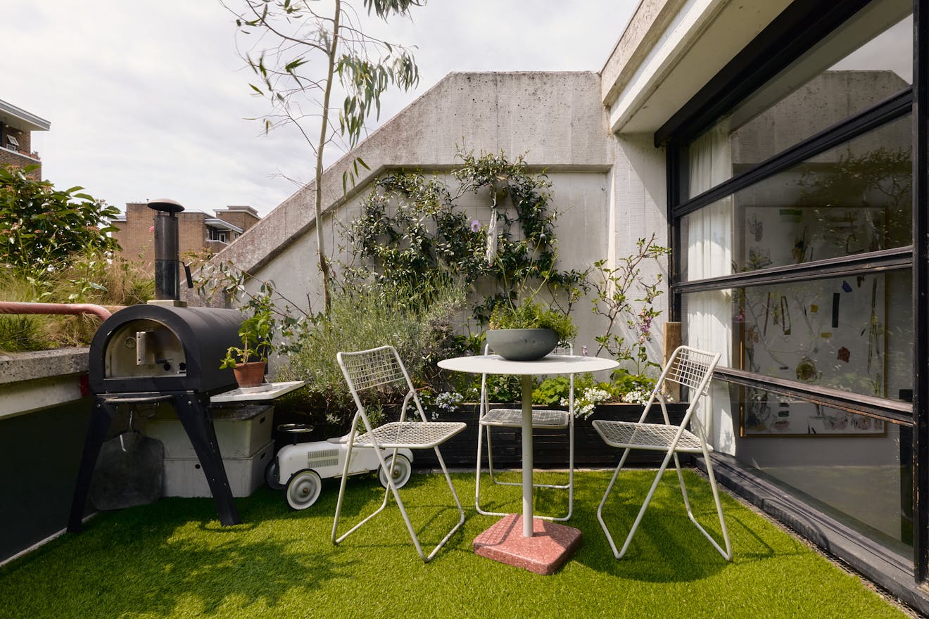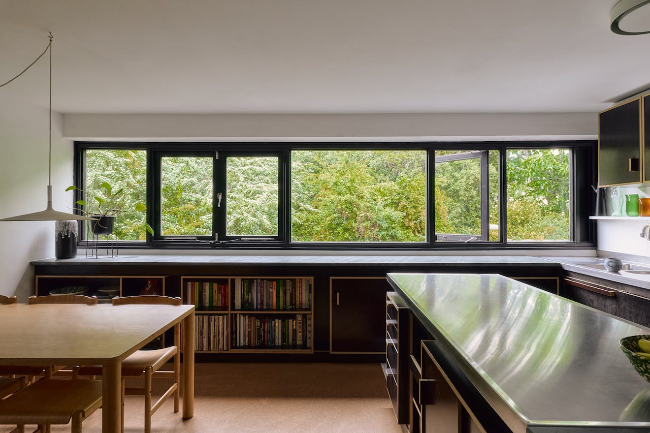 The upper level holds a large open-plan living and dining room, bookended by a deep terrace overlooking the estate’s planting scheme. Sliding glass doors dissolve the threshold between inside and out, while a monochrome palette draws attention to original architectural details, steel balustrades, exposed frames, crisp geometry. The top-floor terrace offers a generous space for outdoor dining and is screened by mature climbers and jasmine. The front garden is similarly inviting, paved and partially shaded by established trees.