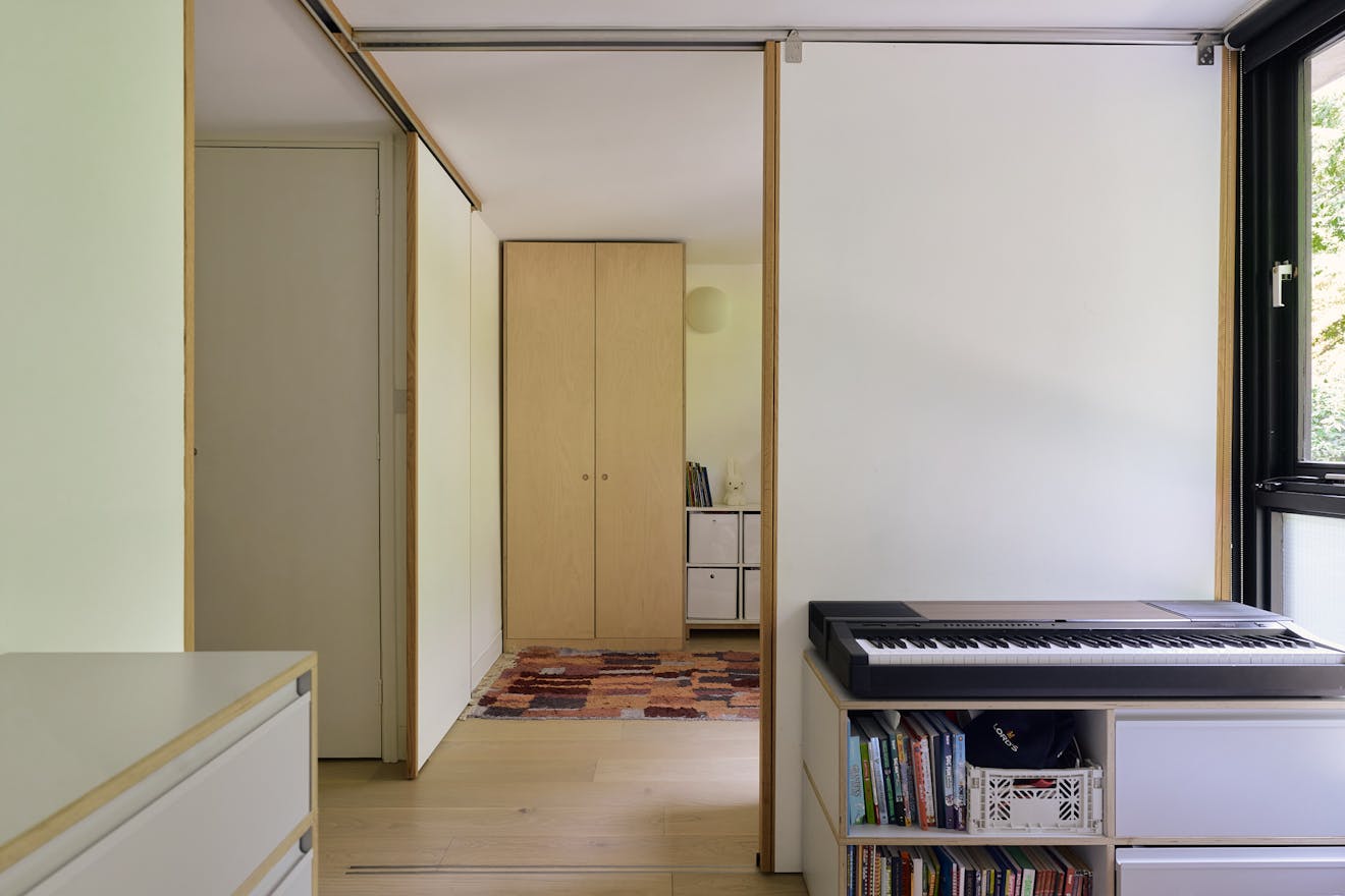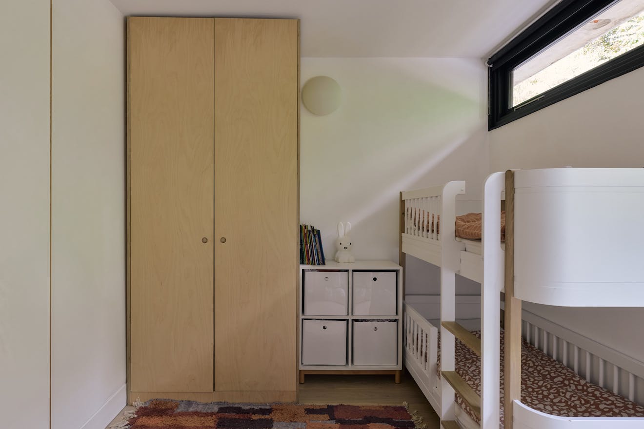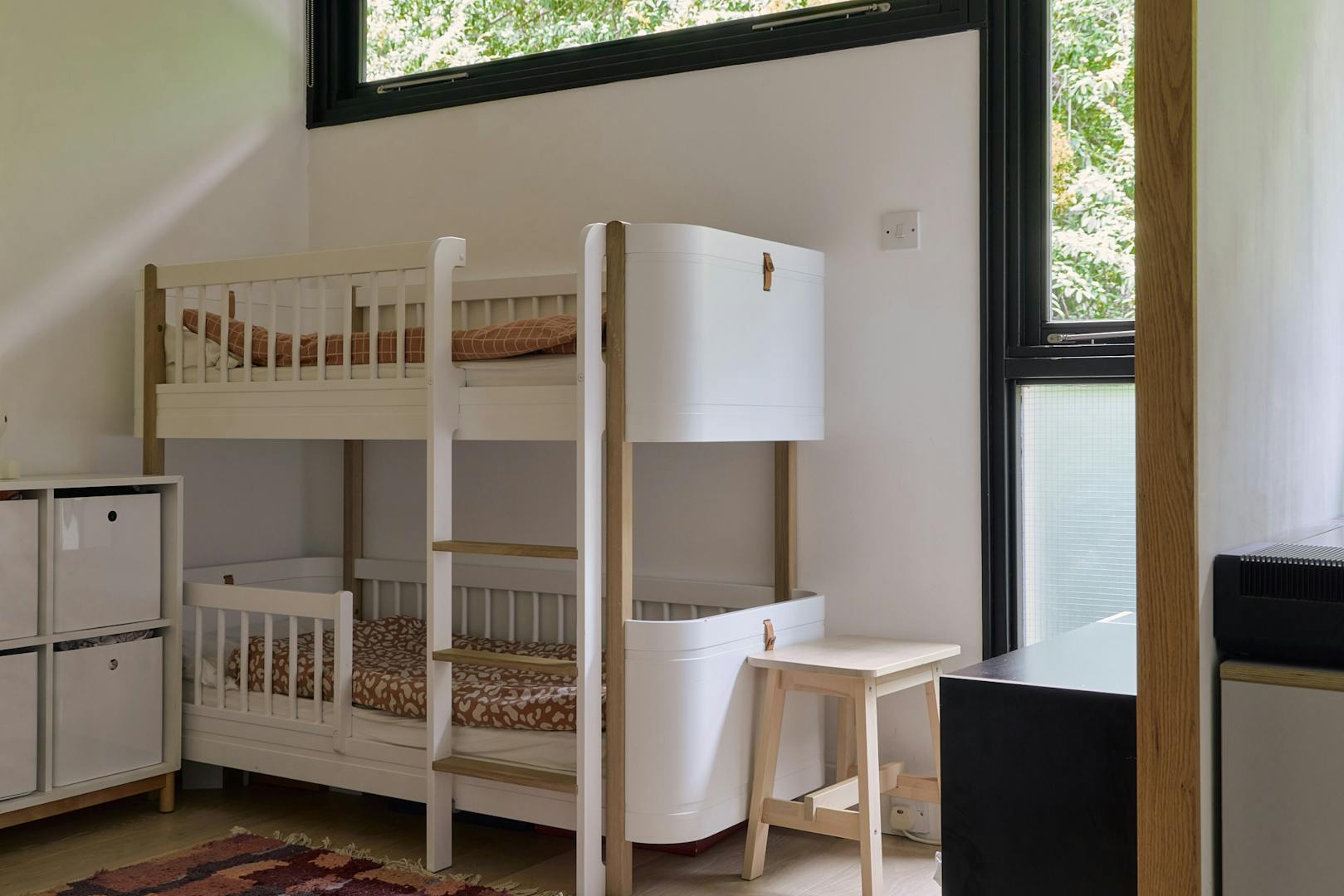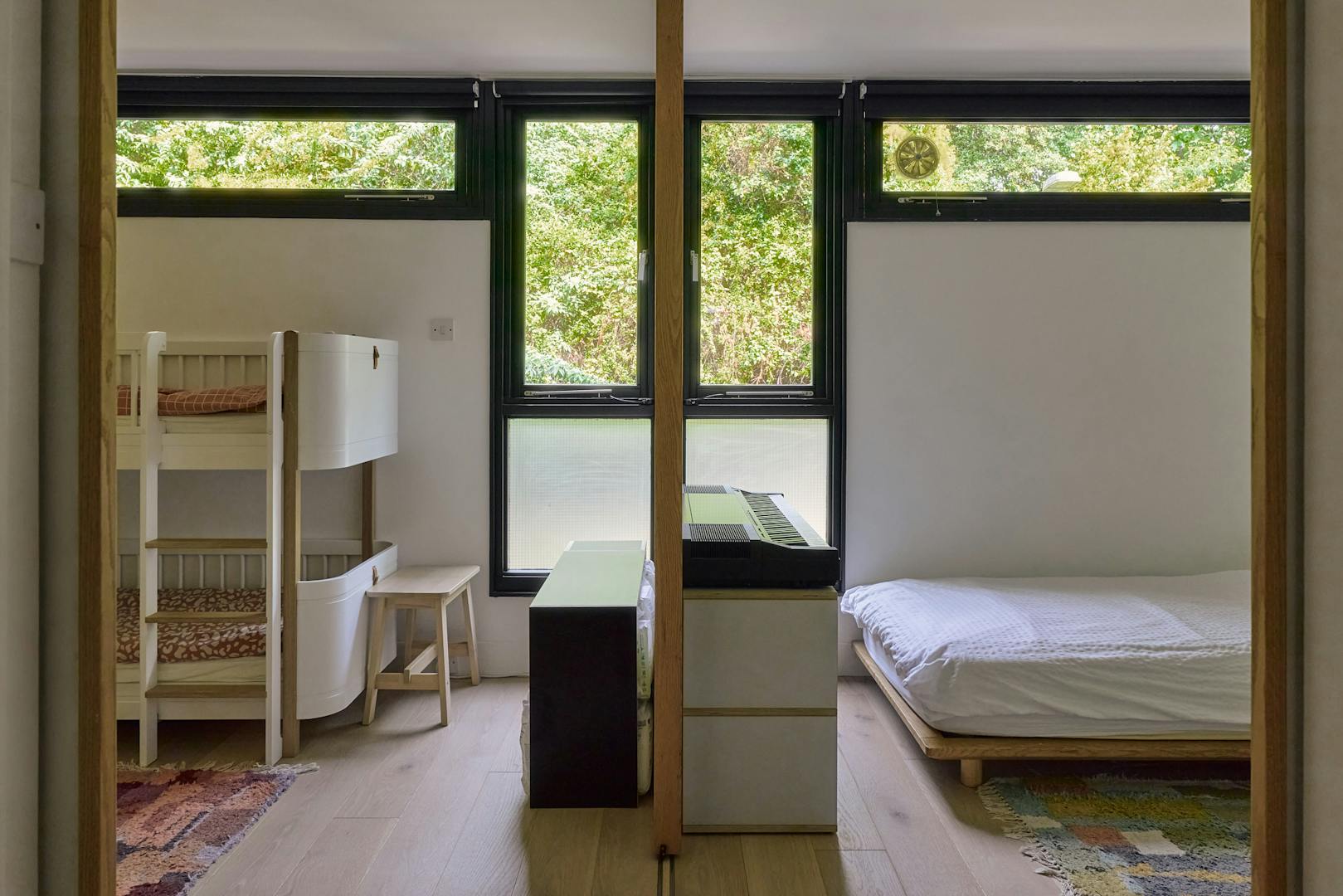 On the ground floor are three further bedrooms, one with bespoke built-in storage and two with sliding partitions that allow for flexible layouts. A shower room, echoing the materials of the bathroom above, completes the plan.