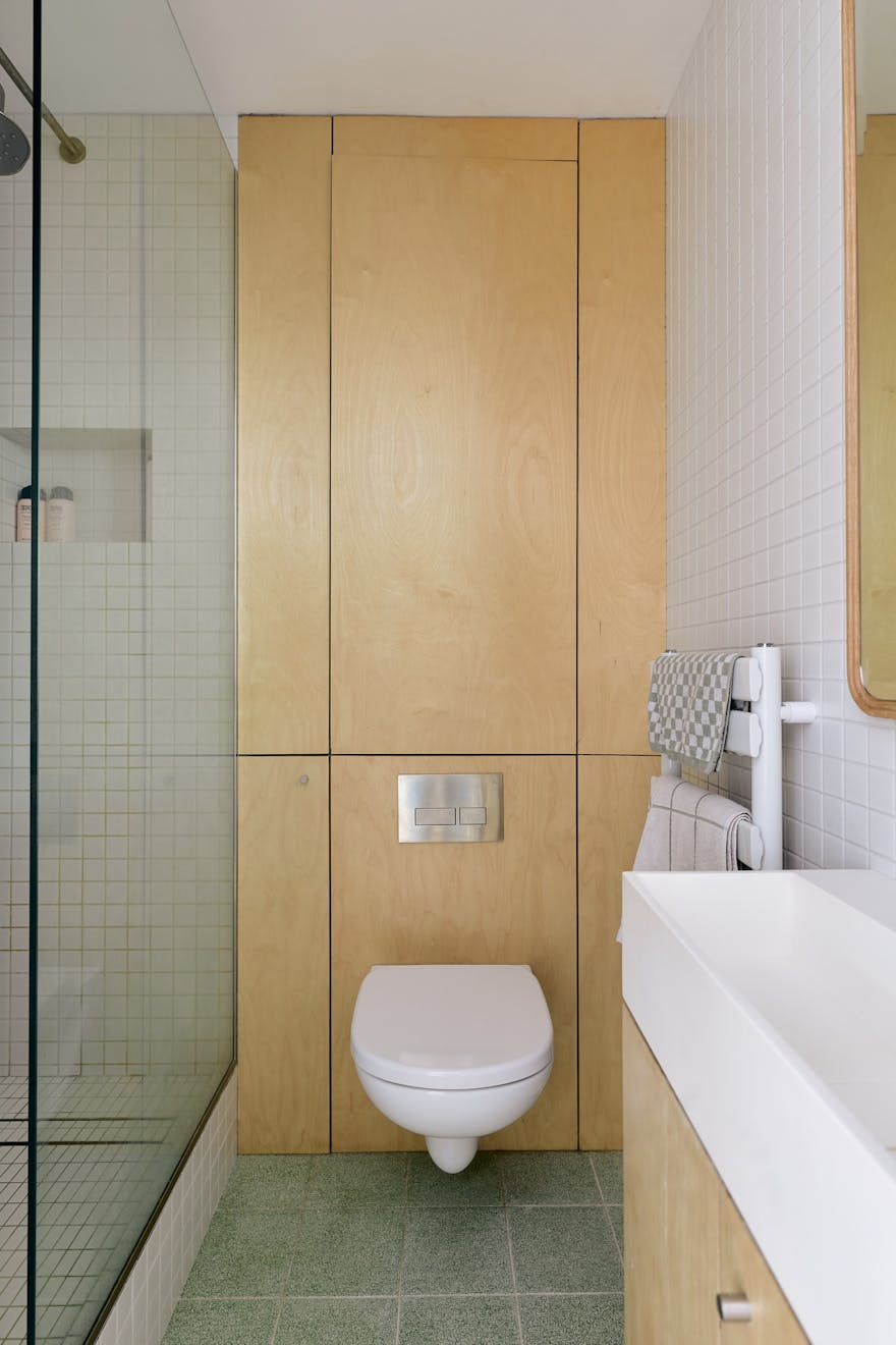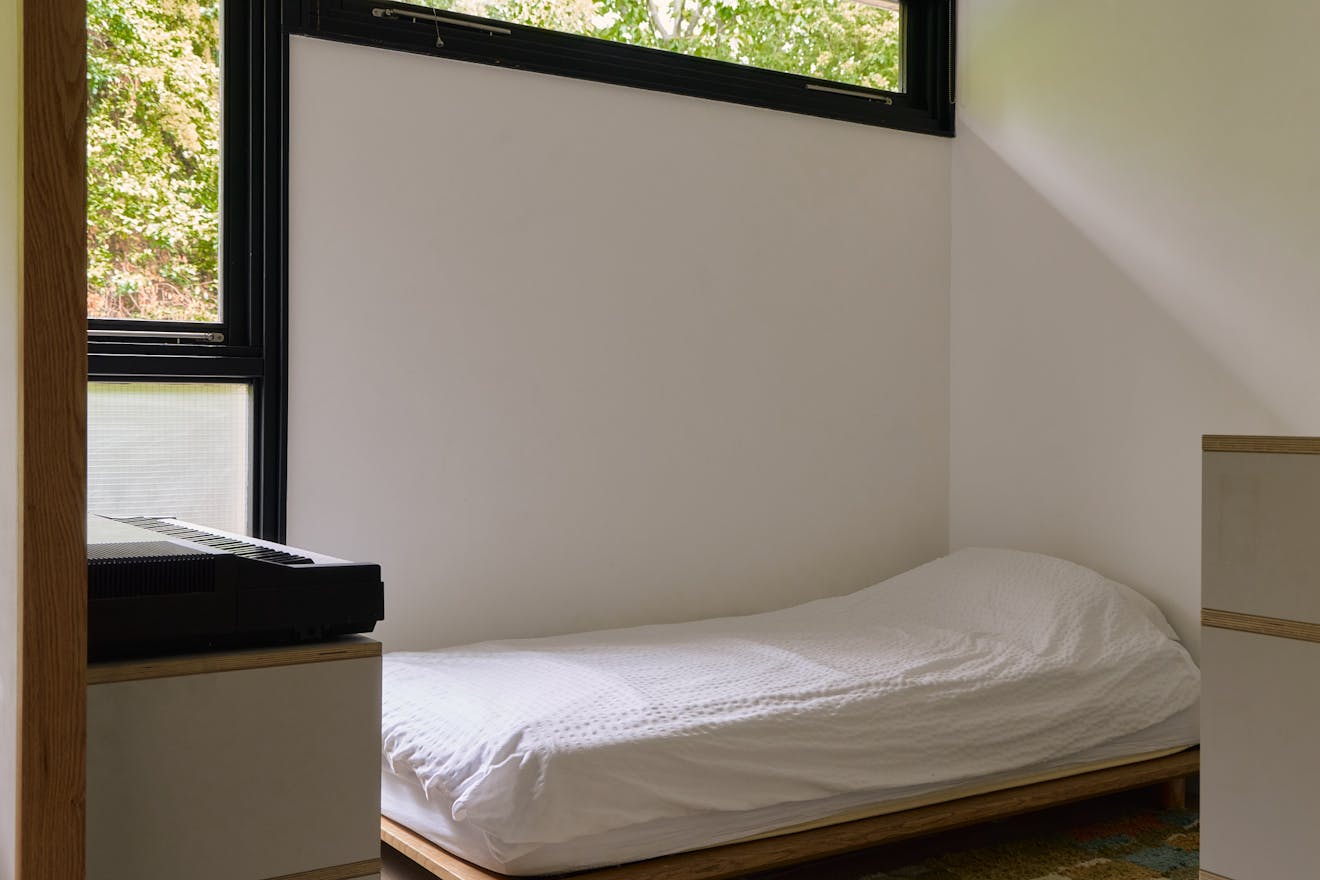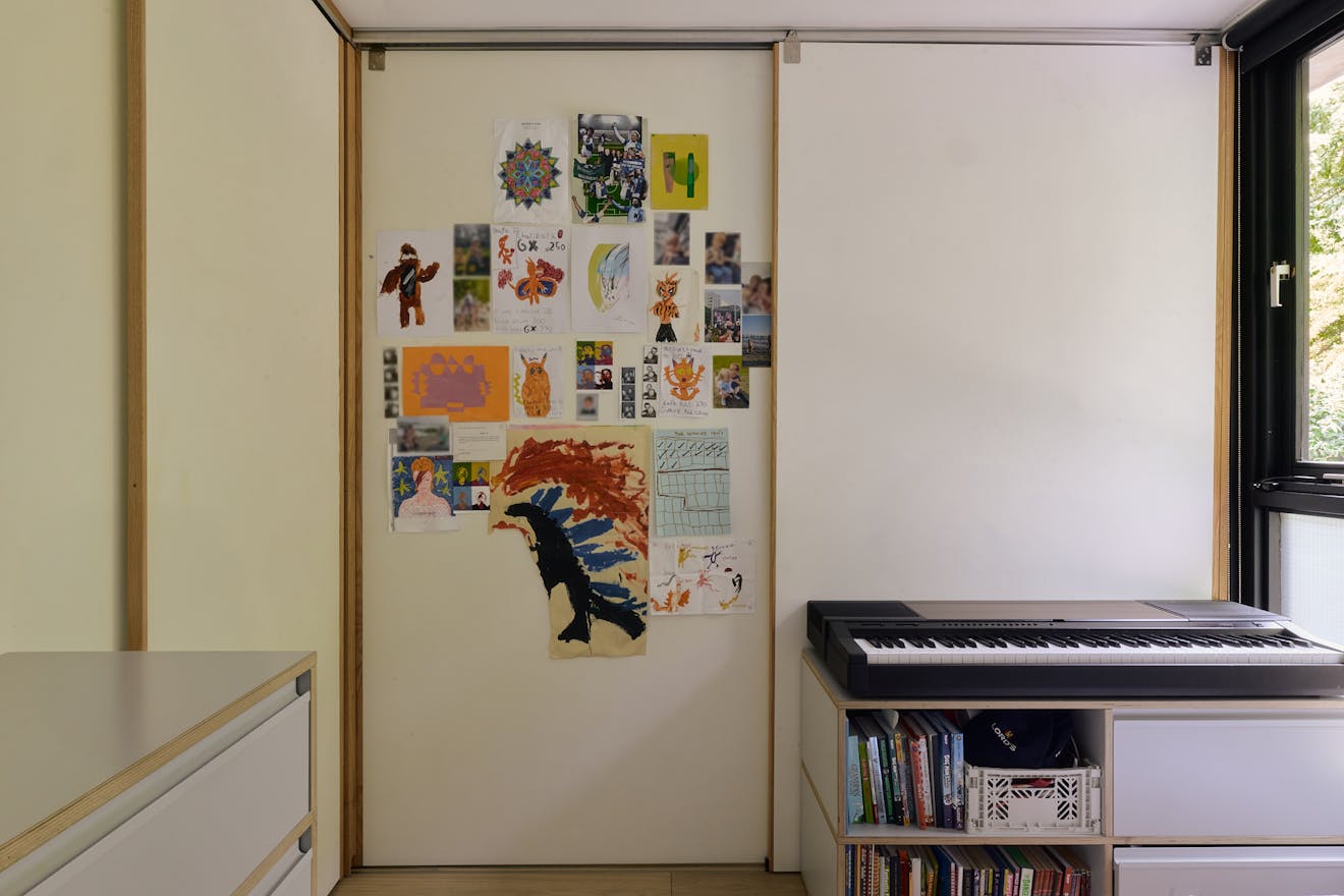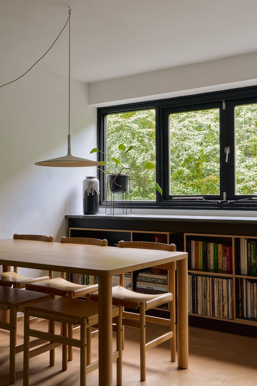 On the ground floor are three further bedrooms, one with bespoke built-in storage and two with sliding partitions that allow for flexible layouts. A shower room, echoing the materials of the bathroom above, completes the plan.