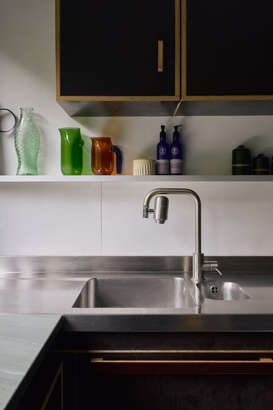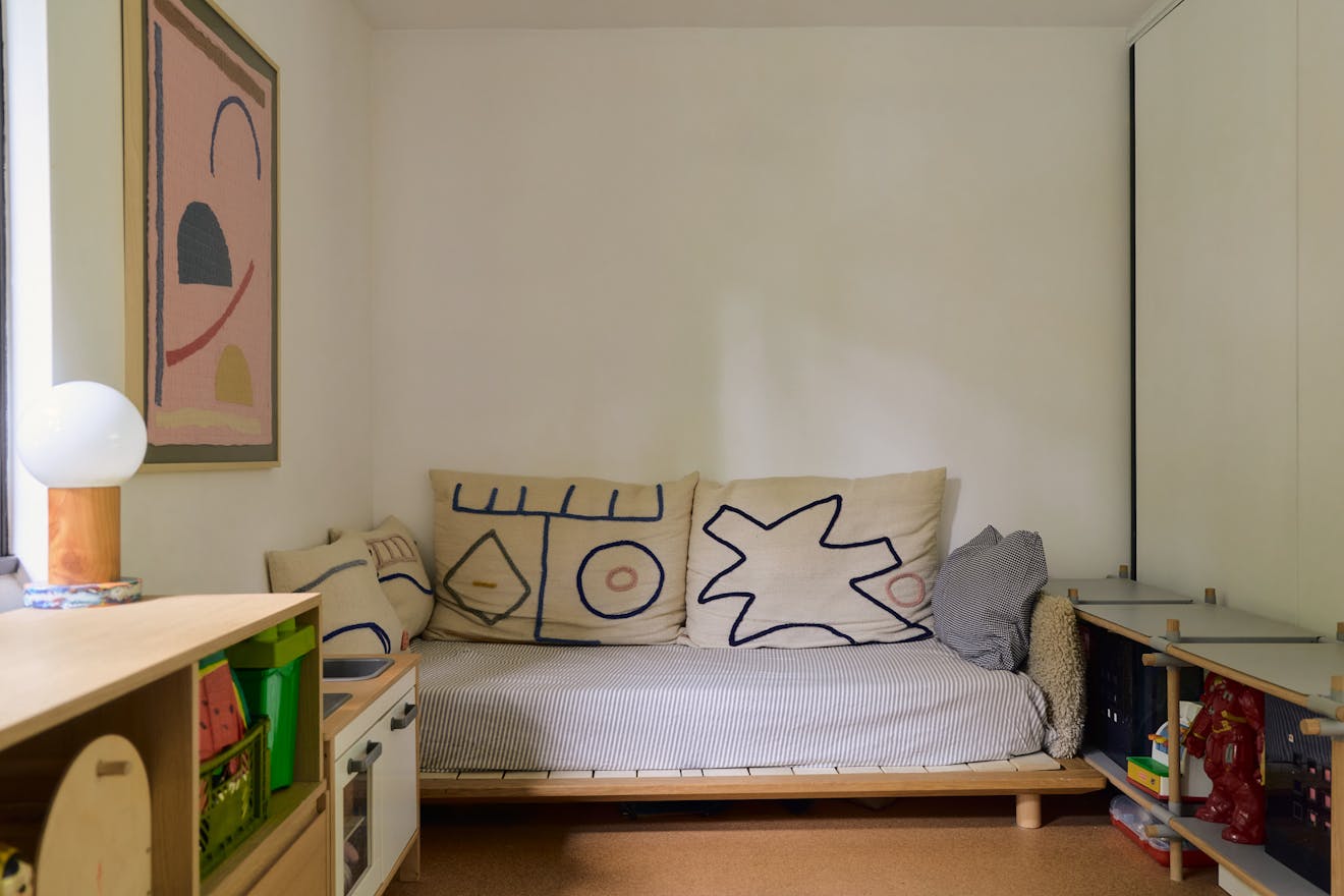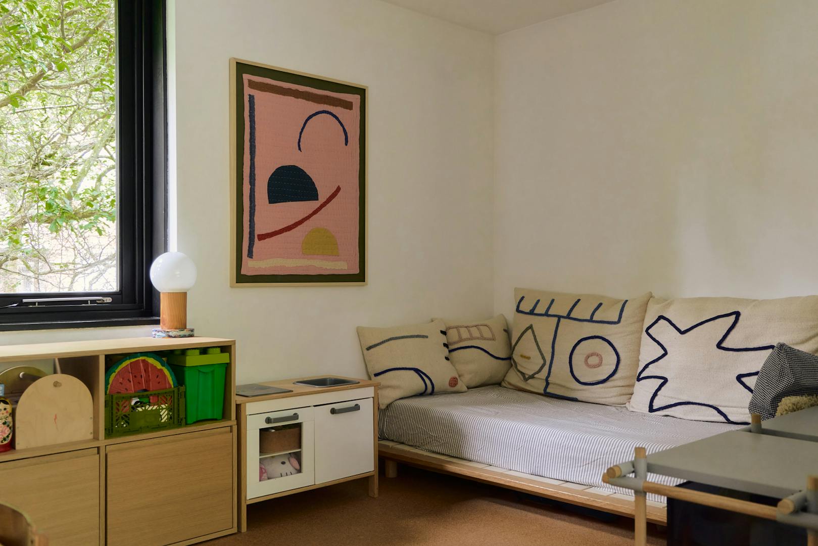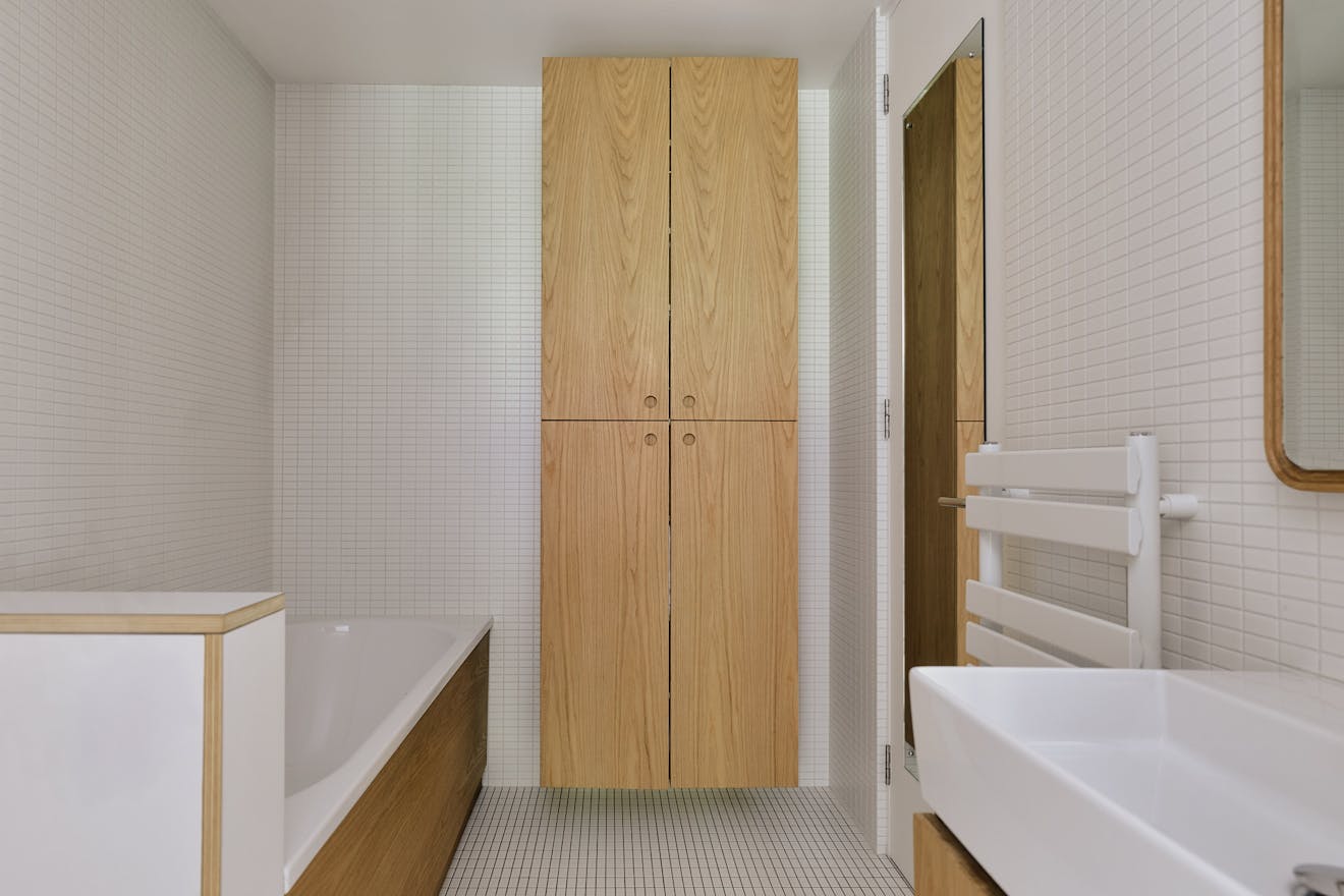 On the ground floor are three further bedrooms, one with bespoke built-in storage and two with sliding partitions that allow for flexible layouts. A shower room, echoing the materials of the bathroom above, completes the plan.