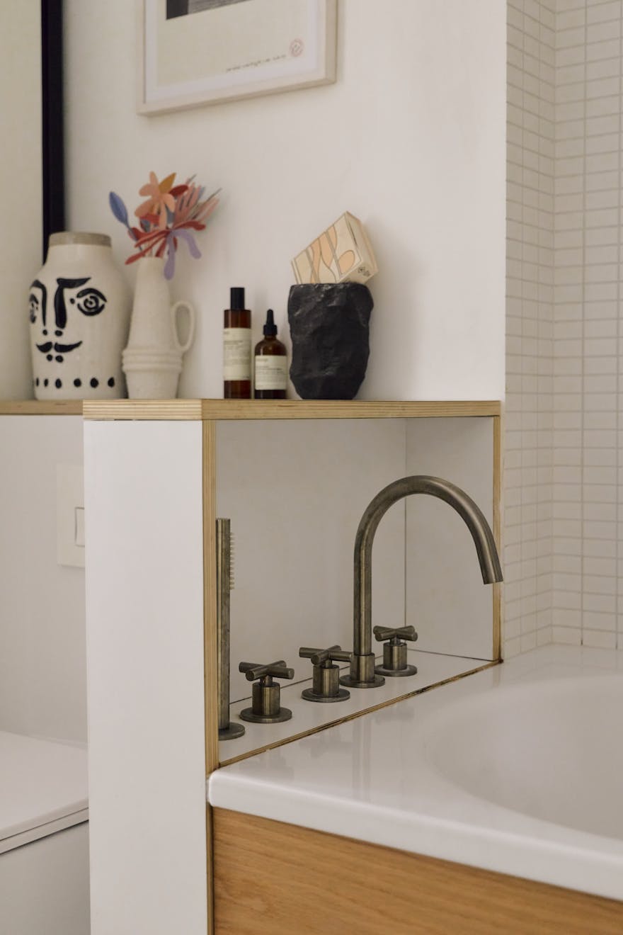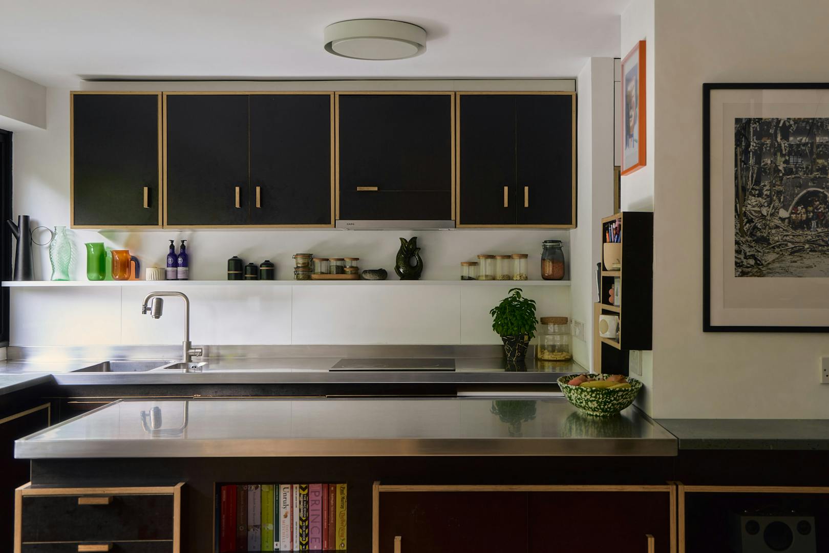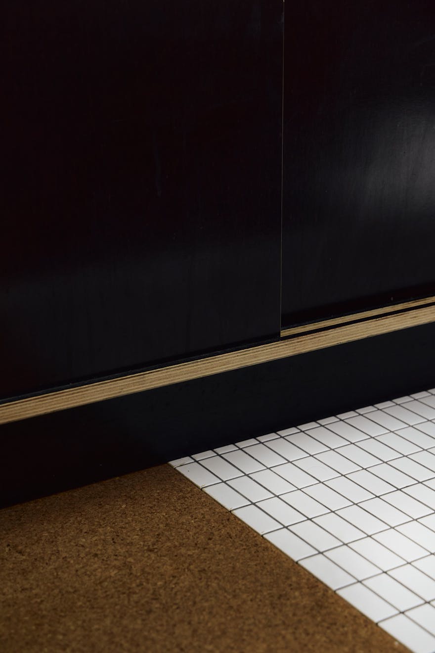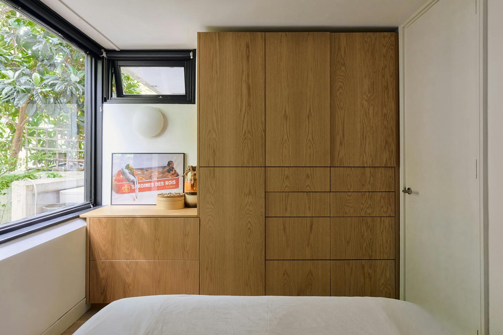 On the ground floor are three further bedrooms, one with bespoke built-in storage and two with sliding partitions that allow for flexible layouts. A shower room, echoing the materials of the bathroom above, completes the plan.