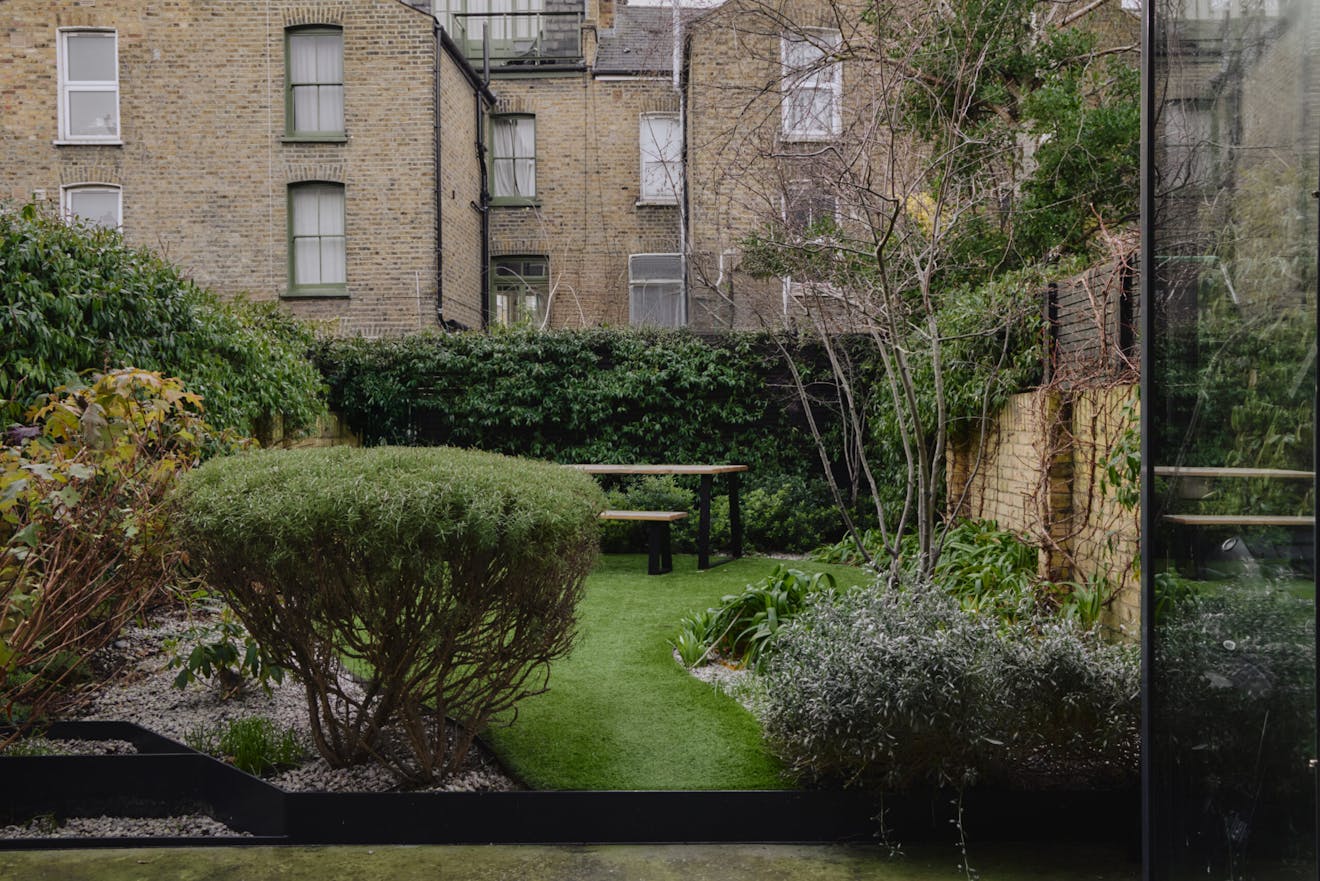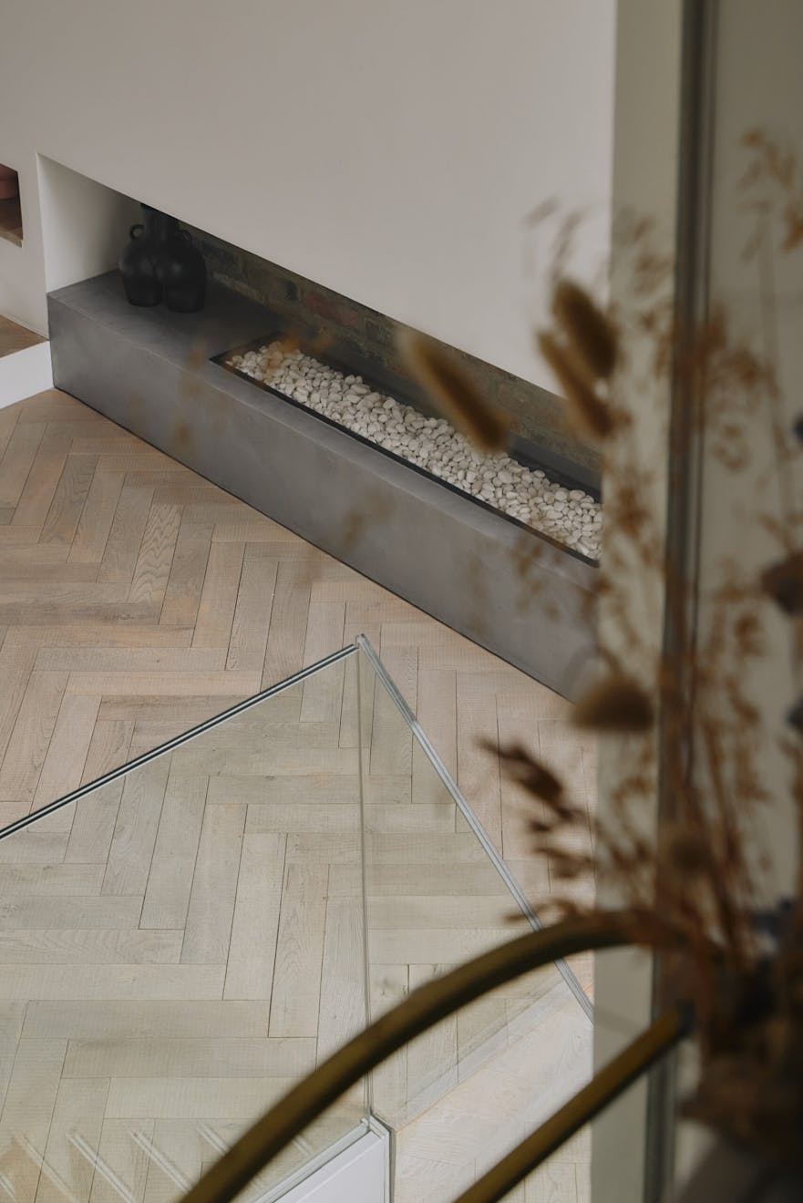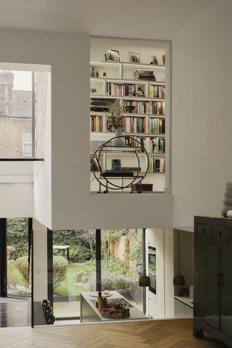 The home’s striking interiors are a celebration of light and proportion. Elegant parquet flooring flows through the double reception room, which is visually anchored by a glass wall that frames views of the landscaped garden, while interior glazing creates a visual connection between the lounge and a ‘floating’ mezzanine library. The ground floor unfolds effortlessly into a kitchen and dining area, both sculptural and practical. At the far end of the kitchen, a thoughtfully positioned seating nook invites moments of quiet reflection. Bathed in natural light, it offers the perfect vantage point to watch birds flit through the garden in the summer months or to listen to the gentle rhythm of rainfall on the glass while immersed in a book. Outside, the landscaped garden with lighting is a tranquil extension of the home and has been designed to be enjoyed all year-round.