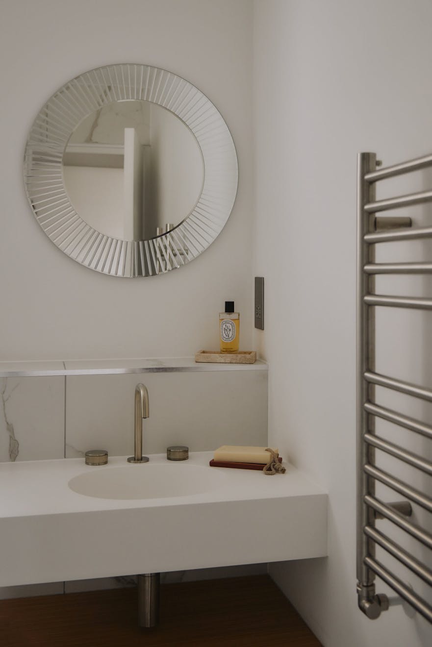 On the first floor, the principal suite is complete with a bespoke dressing room and an en-suite where sculptural double sinks, bath and shower form. Additional double bedrooms on this and the upper floor maintain the home’s exacting standards, blending functionality with whimsy in equal measure.