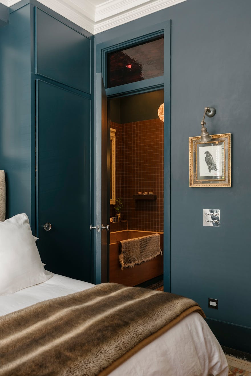 The bedroom sits quietly at the front of the plan, wrapped in bespoke cabinetry that echoes the detailing found throughout the apartment. Built-in wardrobes flank the bed, while soft, integrated lighting adds to the atmosphere. An en-suite bathroom lies beyond, centred around a bespoke Teak bath and finished with mosaic tiles and a hand-painted mural — a tranquil, hotel-like retreat.