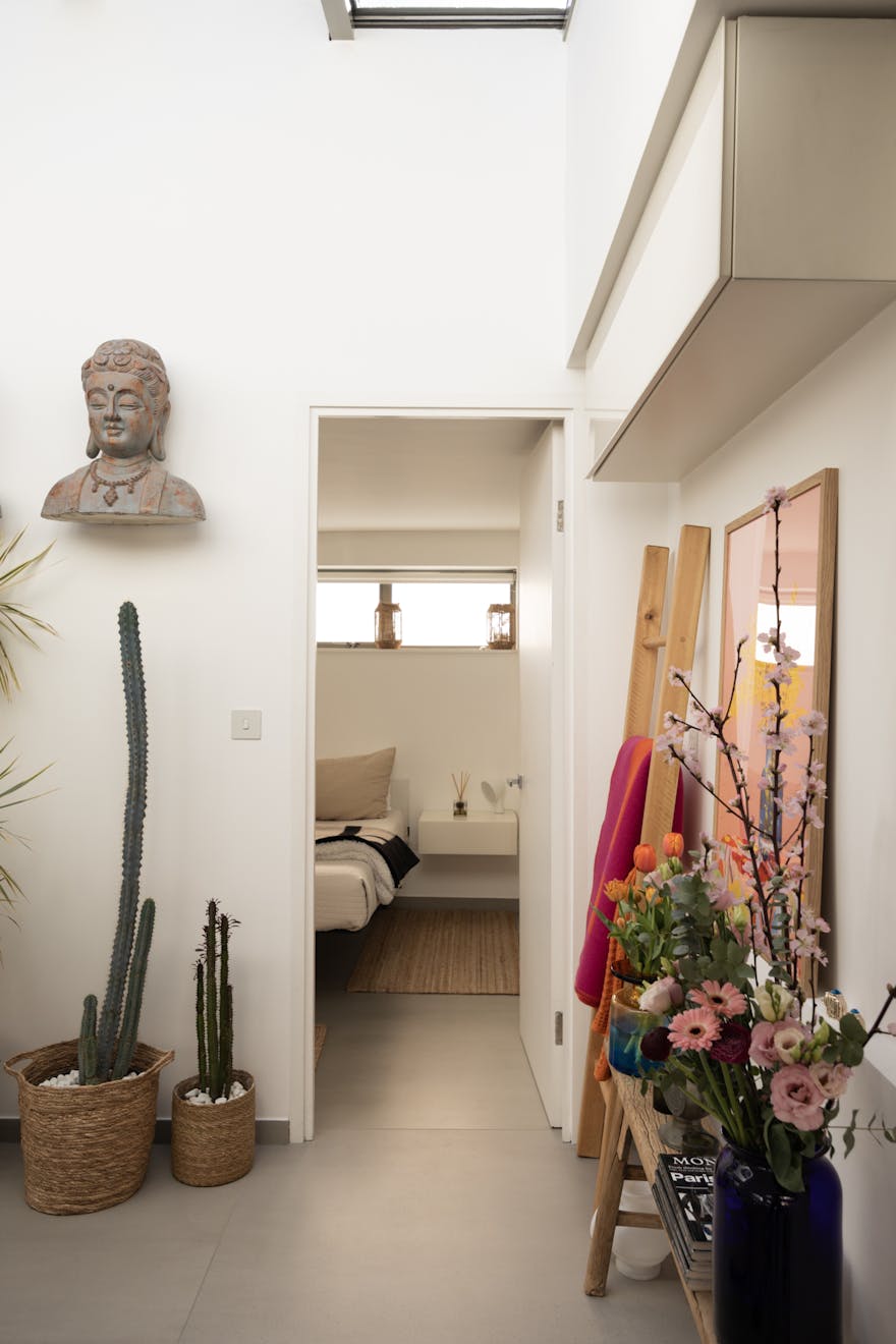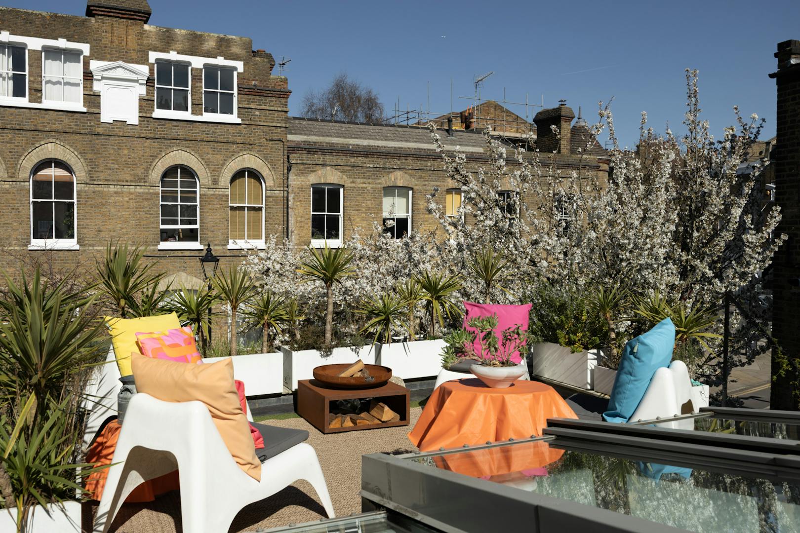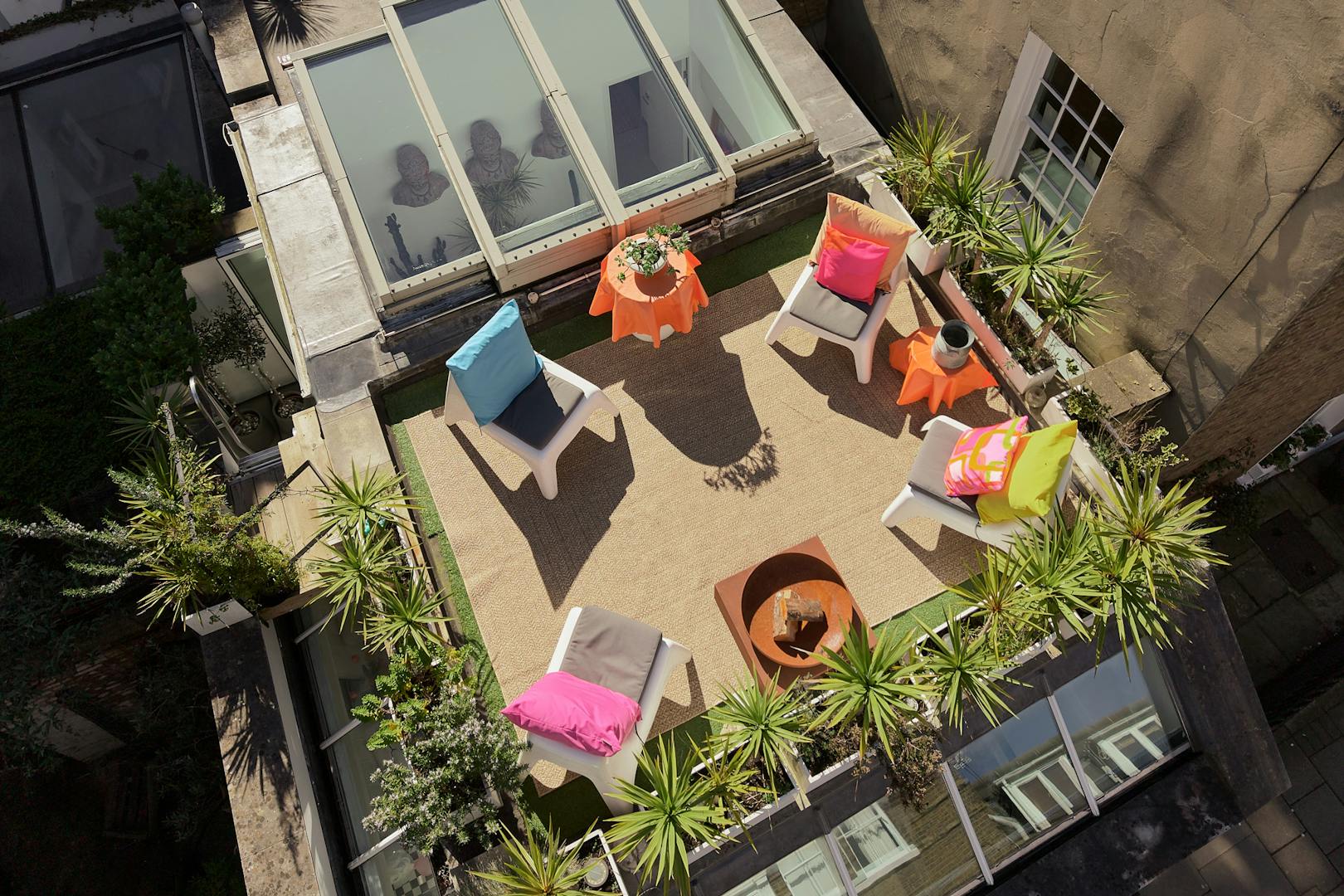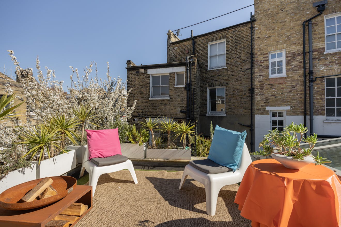 The roof terrace, not formally demised yet intuitively used as part of the home, offers an additional outdoor setting. A layer of all-season artificial grass softens the surface, with potted planting creating a natural border. From here, there are open views across neighbouring gardens, providing a quiet, elevated outlook.