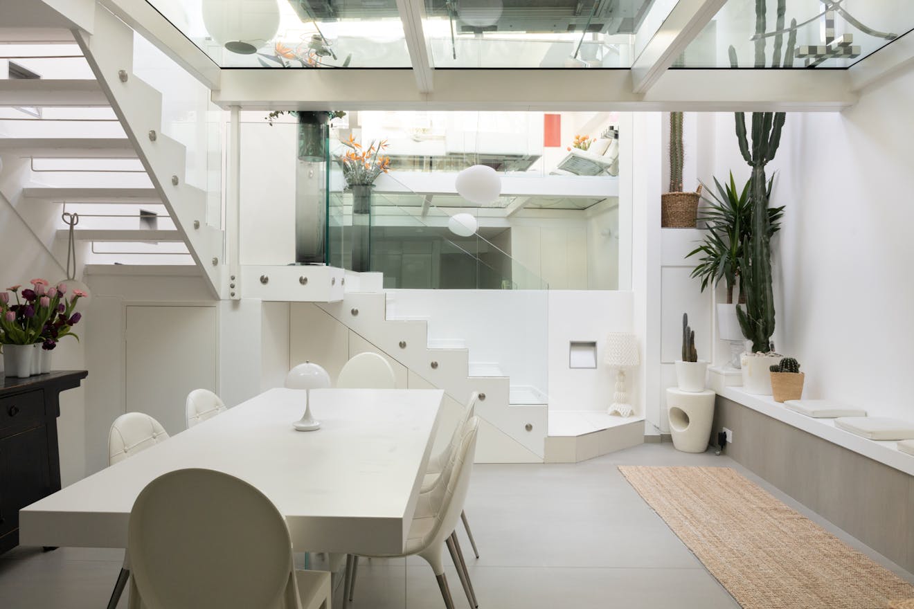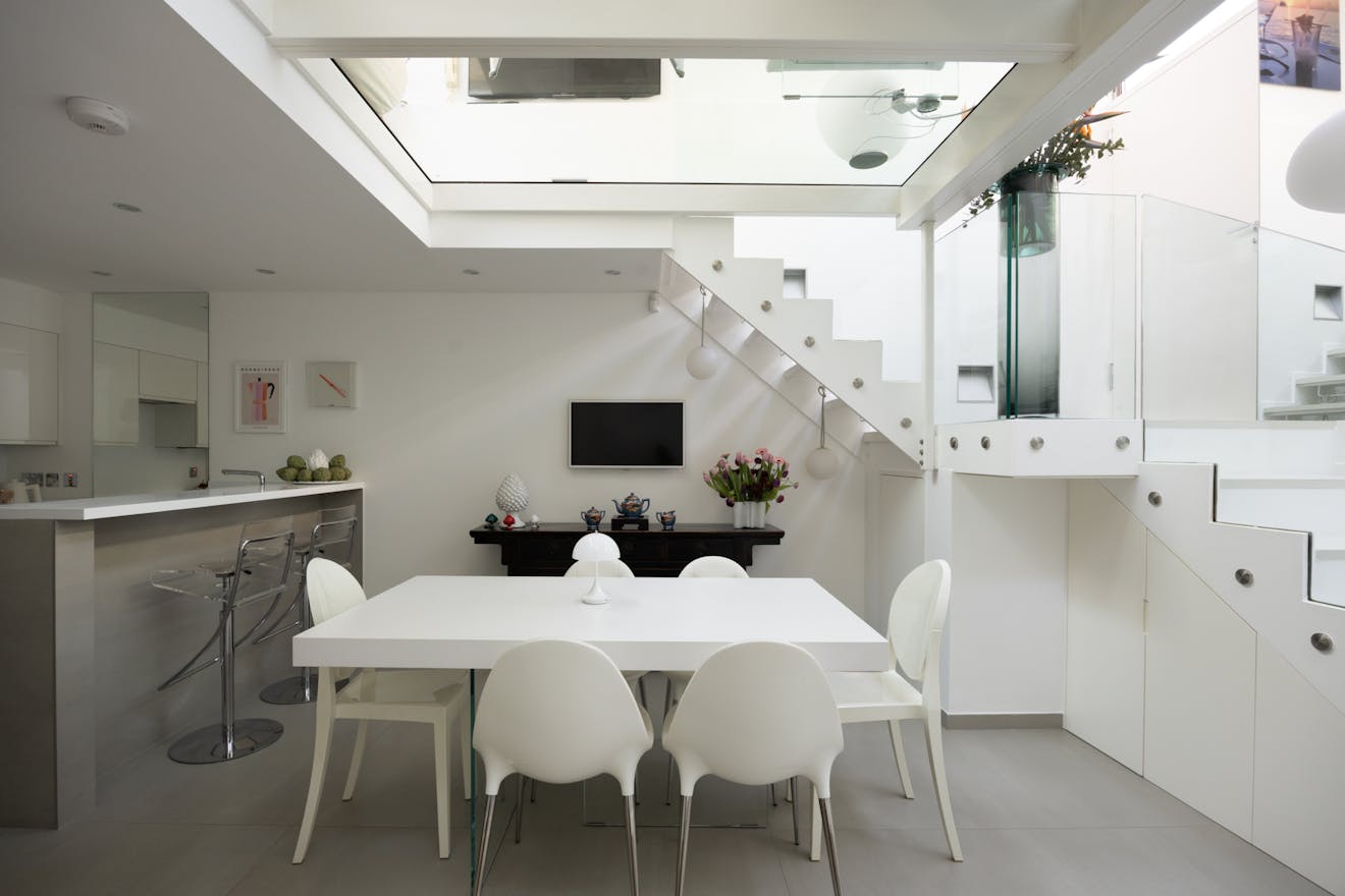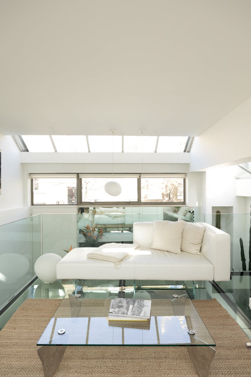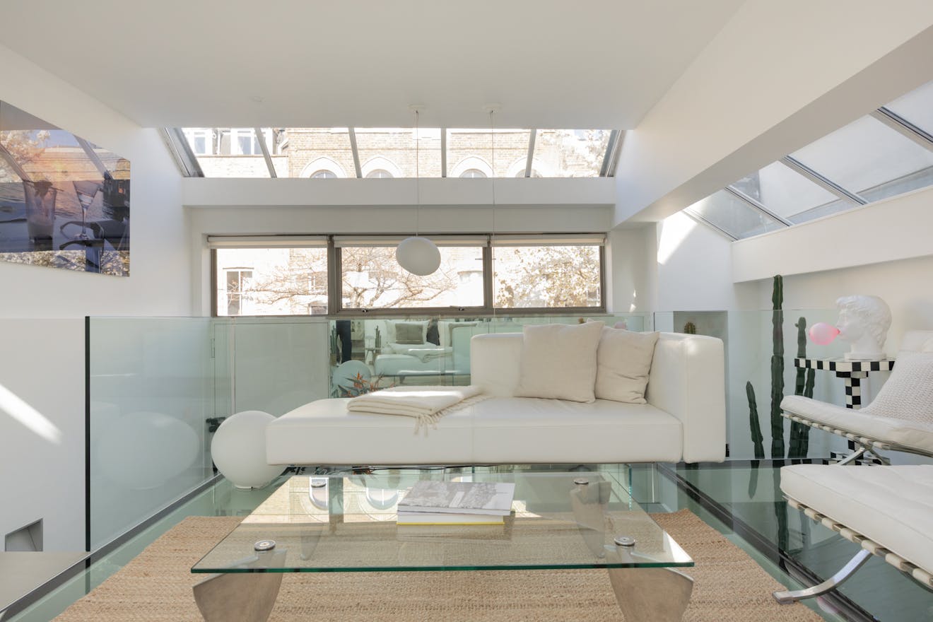 Ascending up the stairs, which has cleverly positioned storage integrated underneath, and the day-to-day living unfolds across the raised ground floor, where the current owners have introduced a finely engineered internal extension - a steel structure with walk-on glass that expands the existing mezzanine and fundamentally reshapes the volume of the space.
