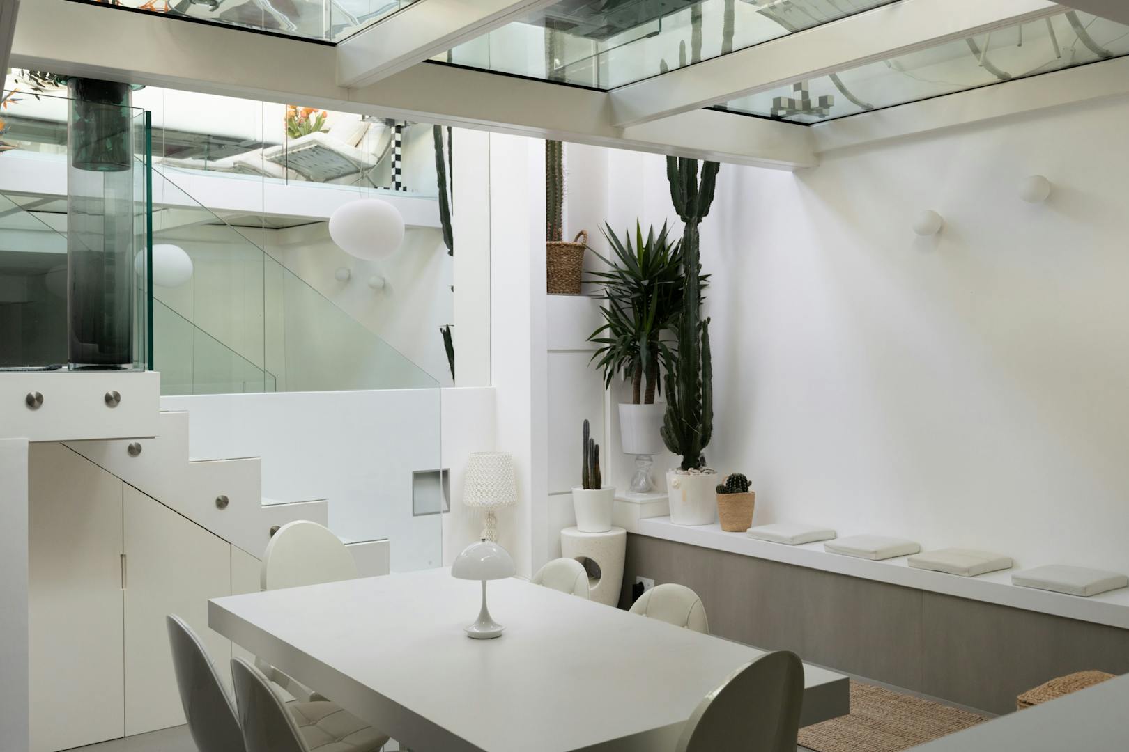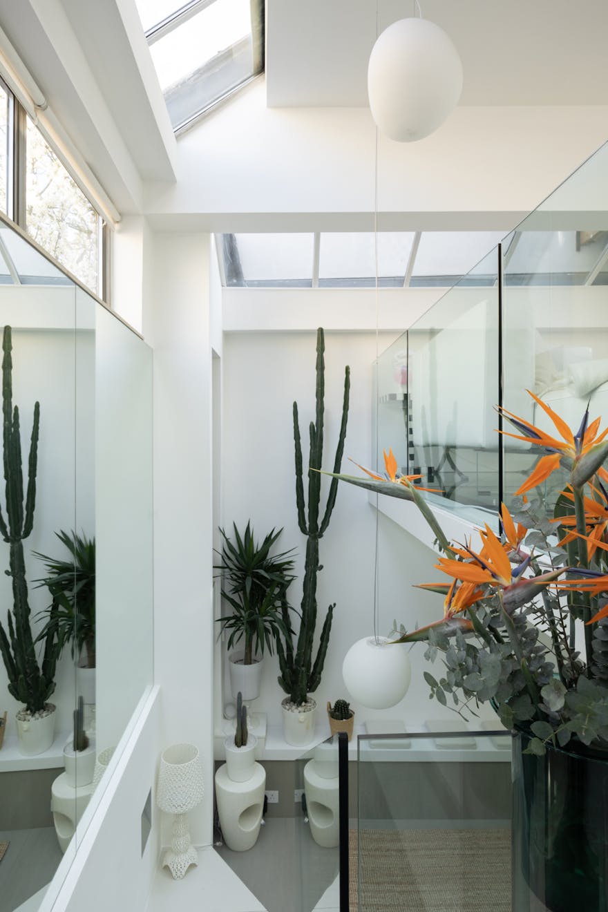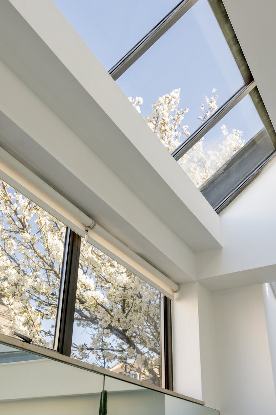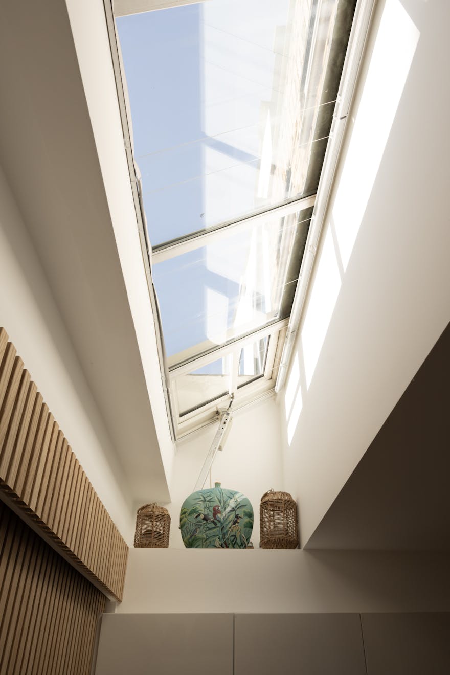 Stepping inside, natural light is drawn deep into the plan, lending a sense of openness to a sequence of free-flowing spaces that feel both expansive and inviting. A semi-open staircase leads down to the kitchen and dining room, where a dramatic interplay of volume and light defines the space. Double-height proportions and glazed ceiling panels pull daylight in from above, creating an atmosphere that shifts gently throughout the day. A considered storage wall was introduced at ground level, designed with intent. Every item is quietly accommodated within, allowing the space to remain composed, uncluttered, and visually calm