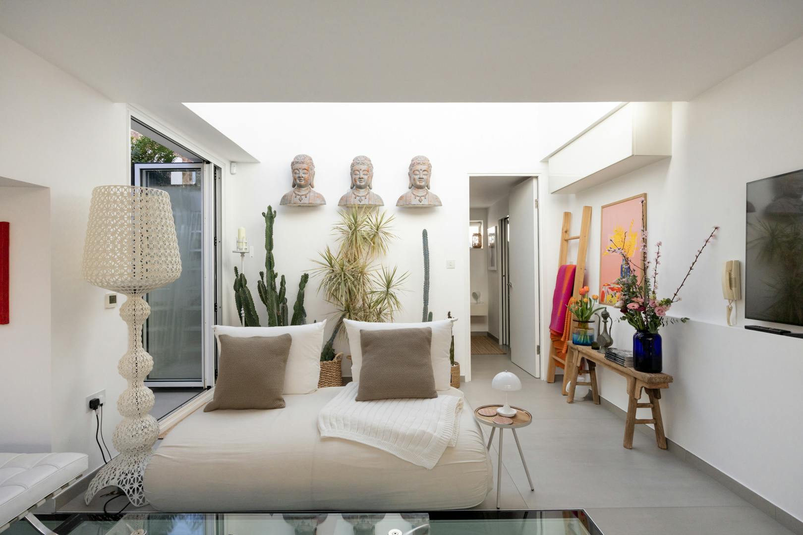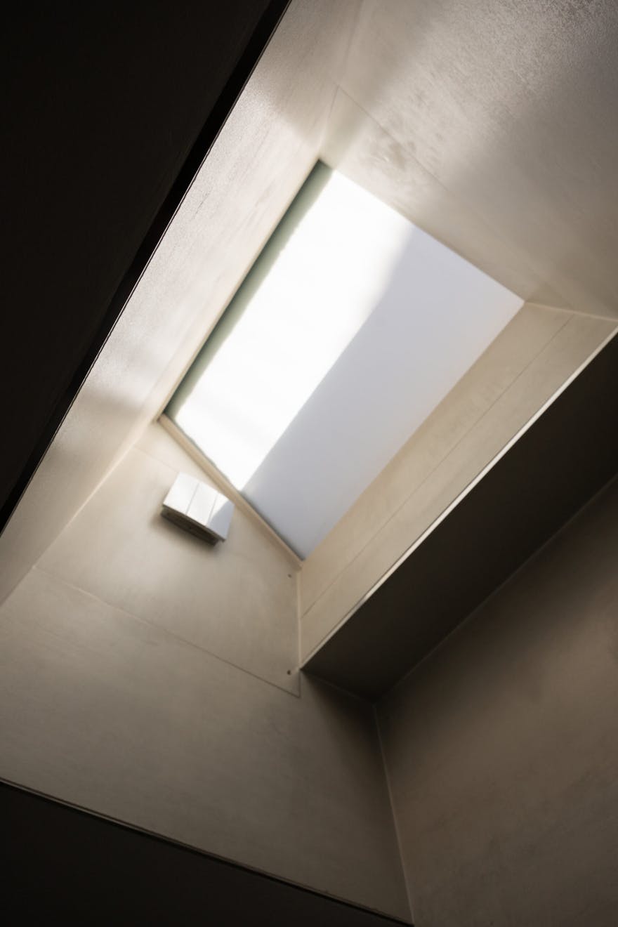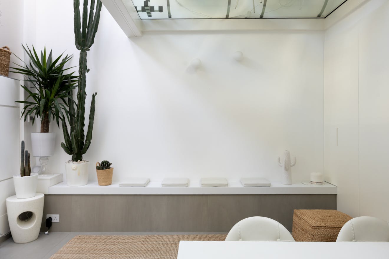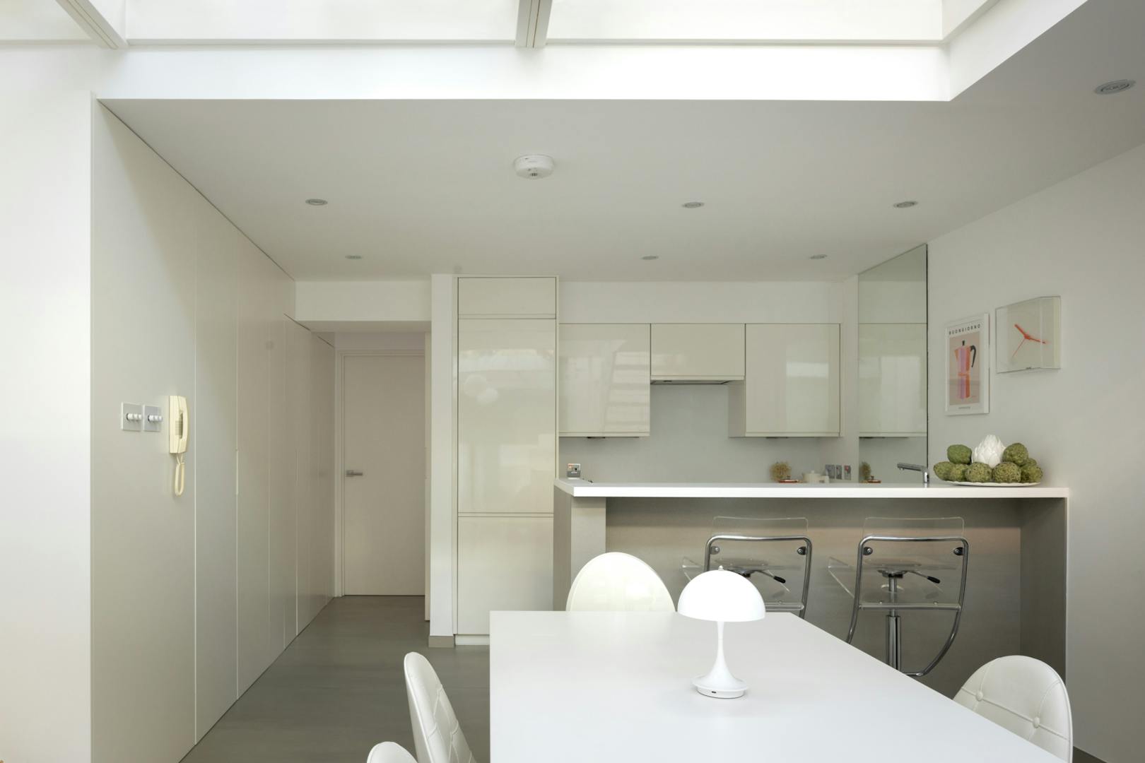 Stepping inside, natural light is drawn deep into the plan, lending a sense of openness to a sequence of free-flowing spaces that feel both expansive and inviting. A semi-open staircase leads down to the kitchen and dining room, where a dramatic interplay of volume and light defines the space. Double-height proportions and glazed ceiling panels pull daylight in from above, creating an atmosphere that shifts gently throughout the day. A considered storage wall was introduced at ground level, designed with intent. Every item is quietly accommodated within, allowing the space to remain composed, uncluttered, and visually calm