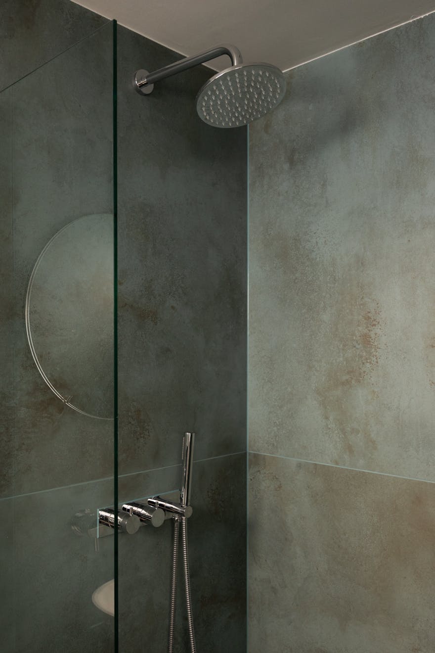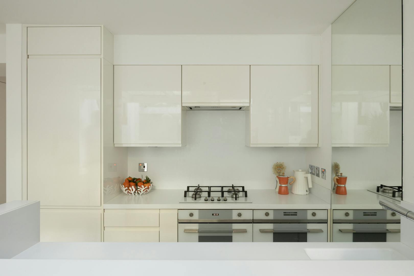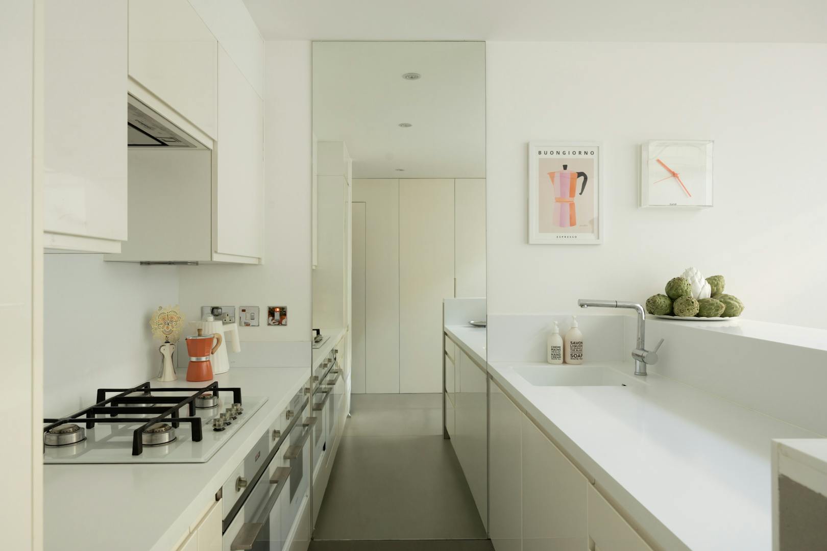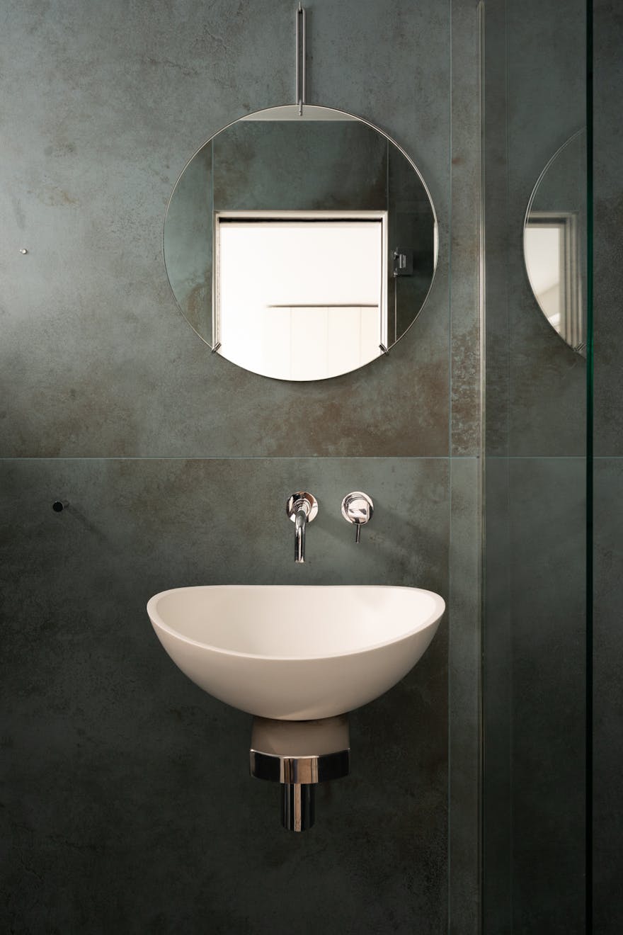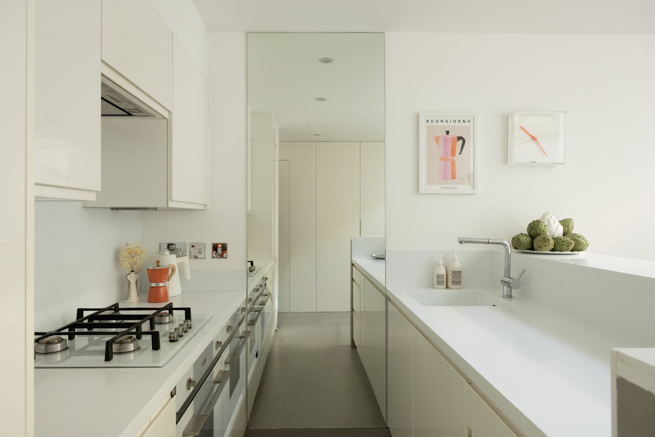 Underfoot, oversized concrete-effect tiles by Caesar Ceramics, imported from Italy are carried throughout the house. The kitchen itself is deliberately pared back, with handleless cabinetry sitting beneath seamless Corian worktops and backsplash. Integrated appliances include a SMEG oven and microwave, alongside a Bosch fridge.