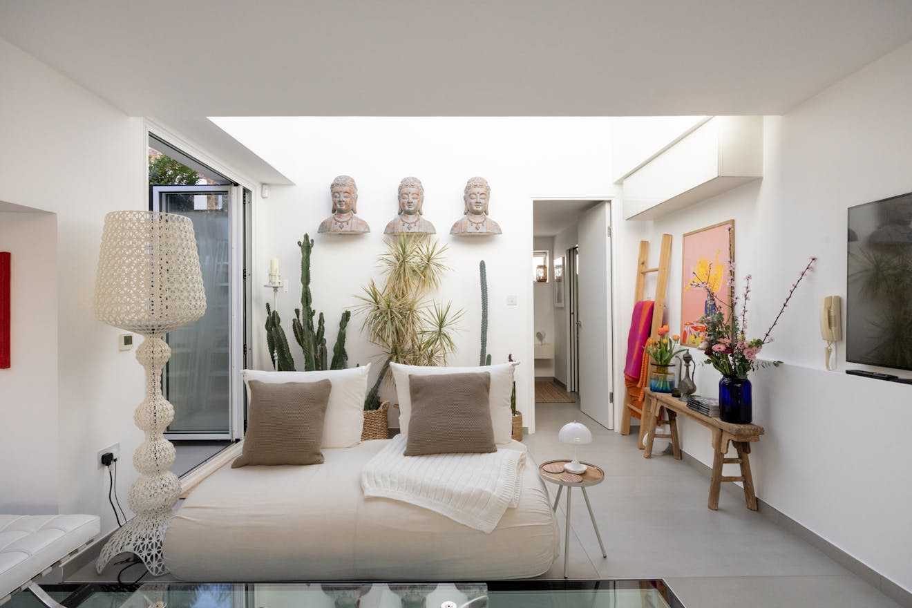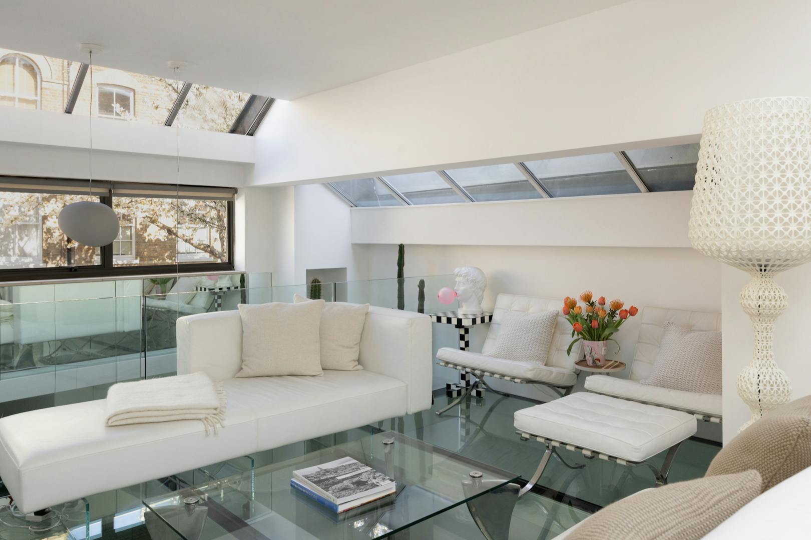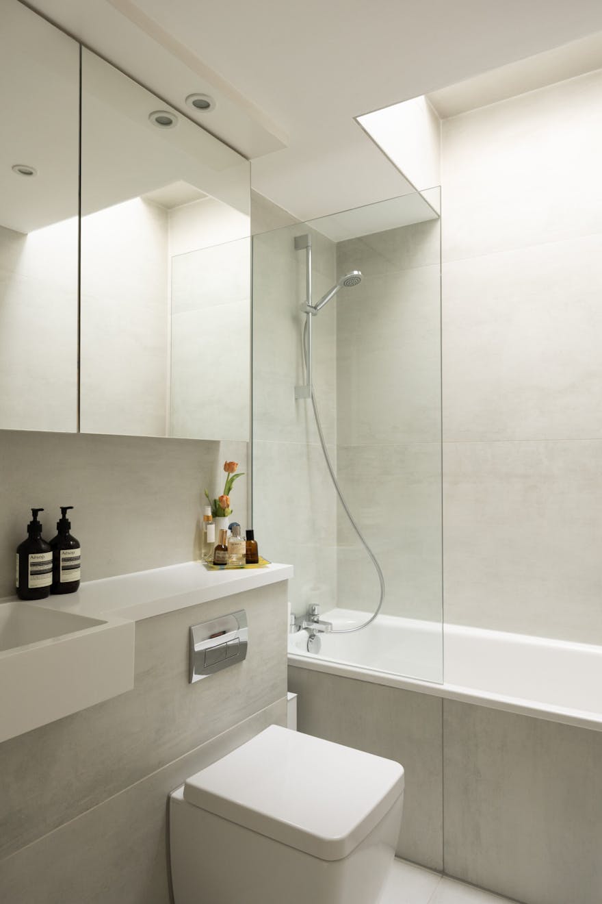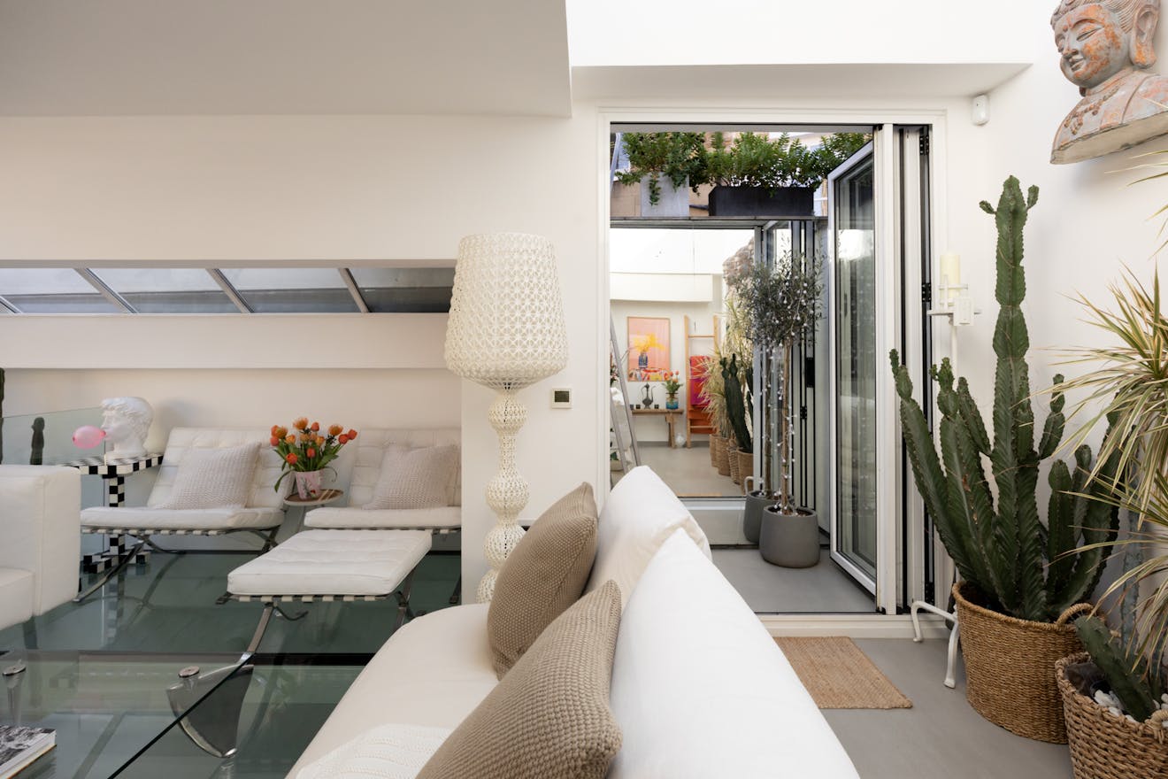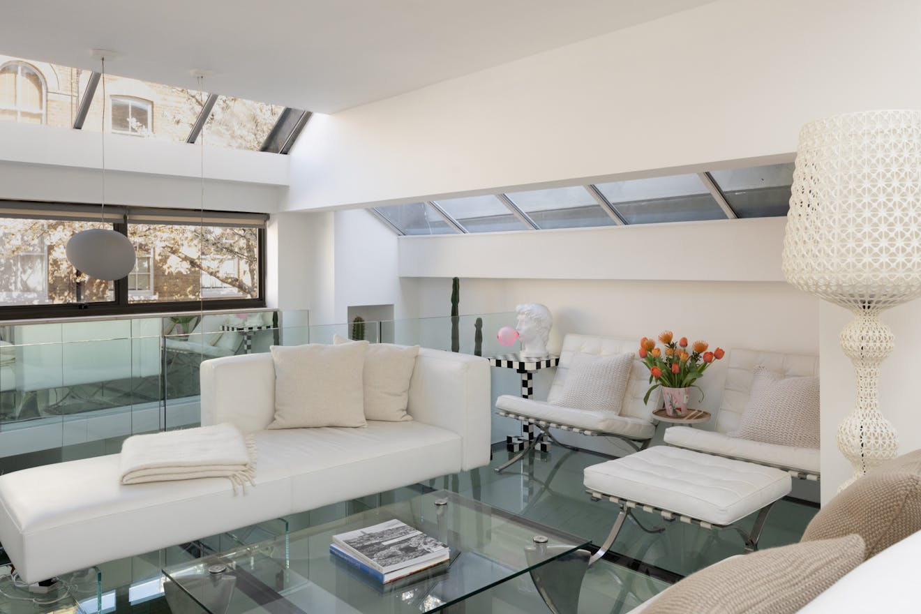 From here, framed views stretch out towards the surrounding Georgian architecture, softened by seasonal cherry blossom, while clerestory glazing draws in a gentle, ambient light. To the rear, bi-folding French doors open onto a terrace, allowing the room to extend effortlessly outdoors. Also positioned on this floor, the principal bedroom is a well-proportioned double and an en suite bathroom sits alongside, finished in Italian porcelain tiles.