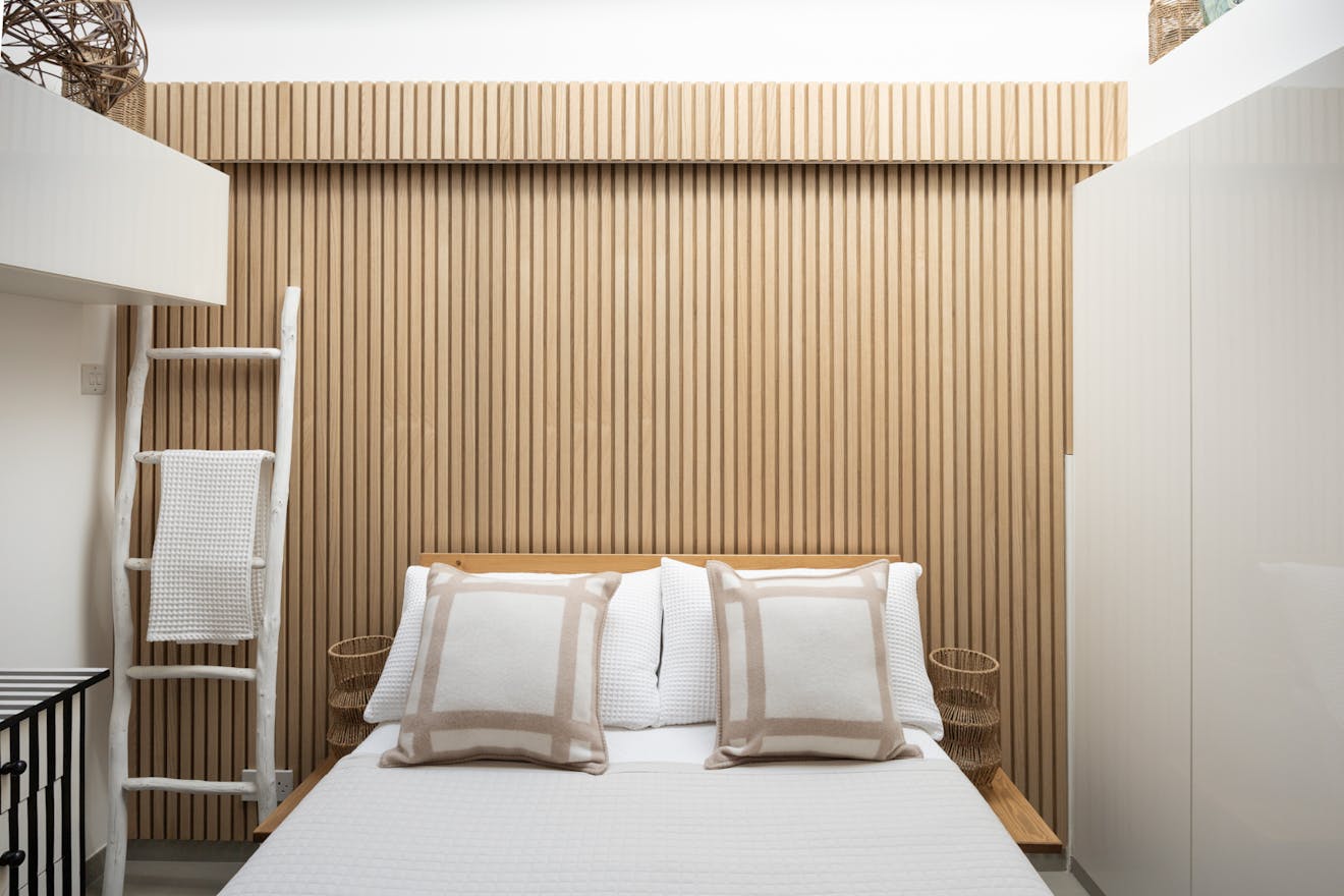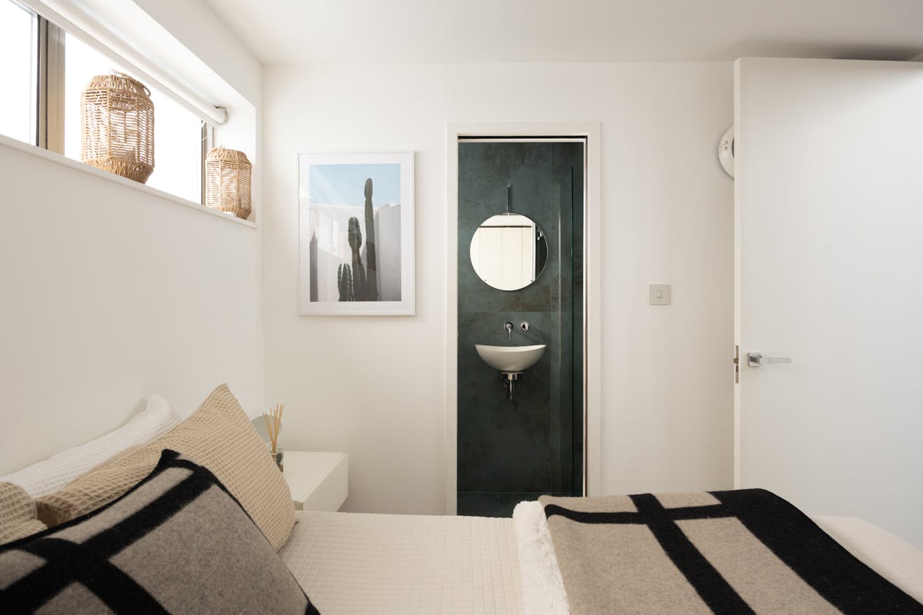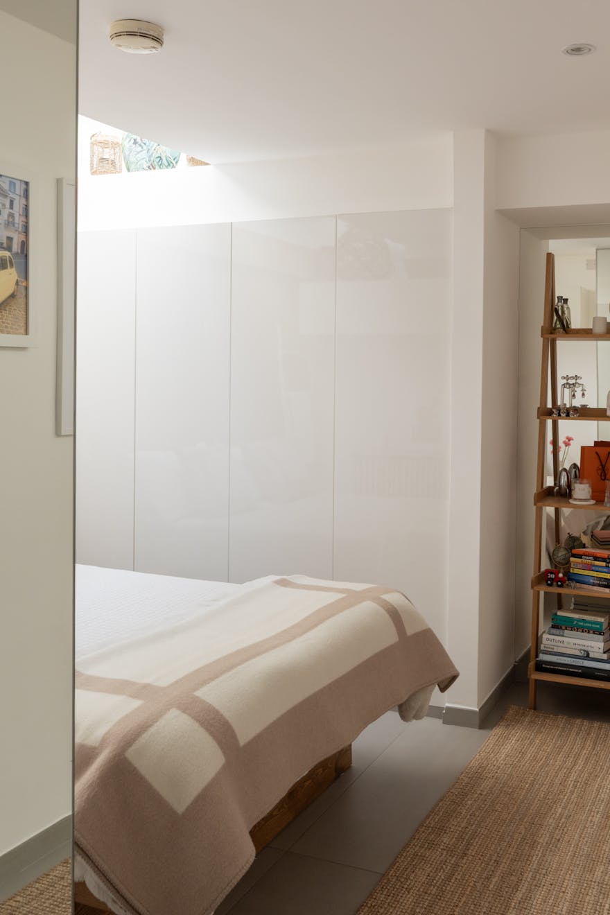 On this floor, towards the rear of the plan, there is a double bedroom set apart and thoughtfully designed with pocket doors to maximise space. Integrated storage helps to maintain the clean, uncluttered feel, while clerestory glazing draws in soft natural light, lending the room a calming atmosphere.
